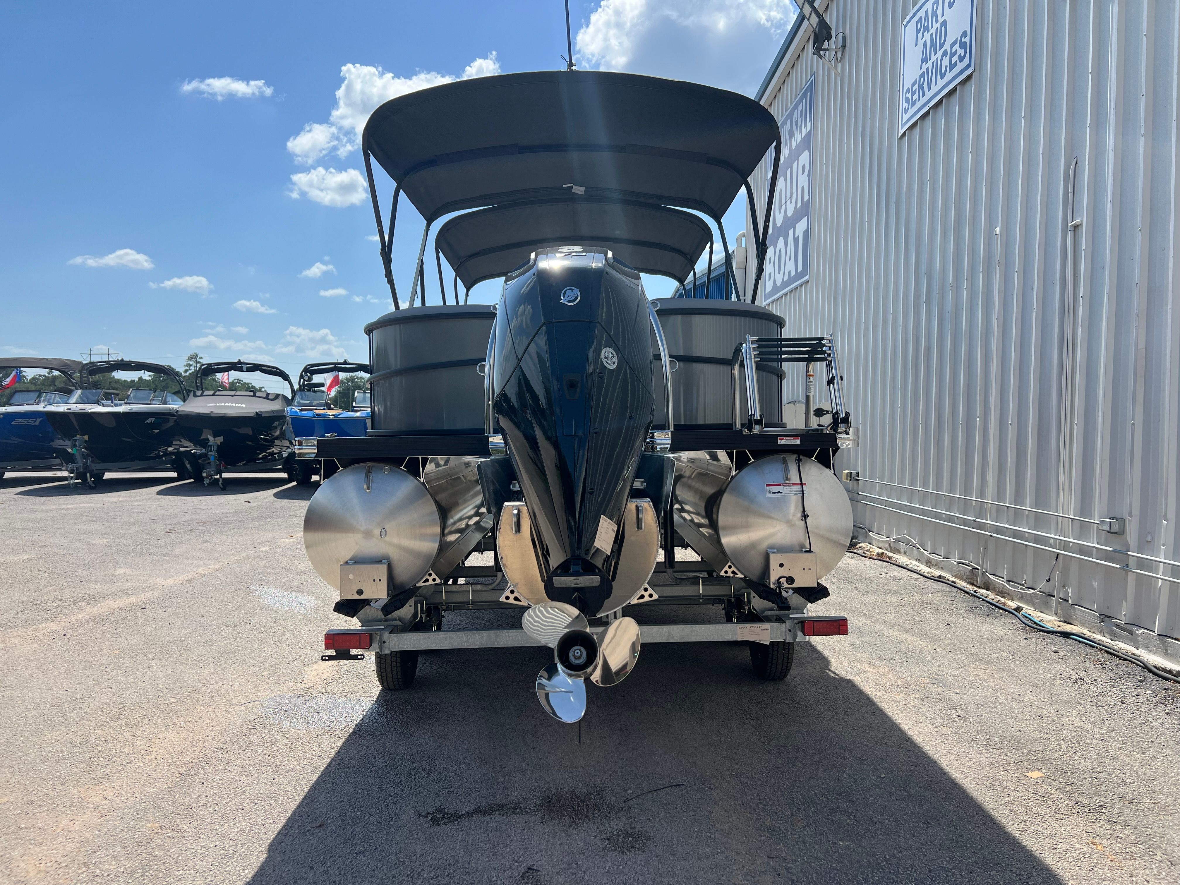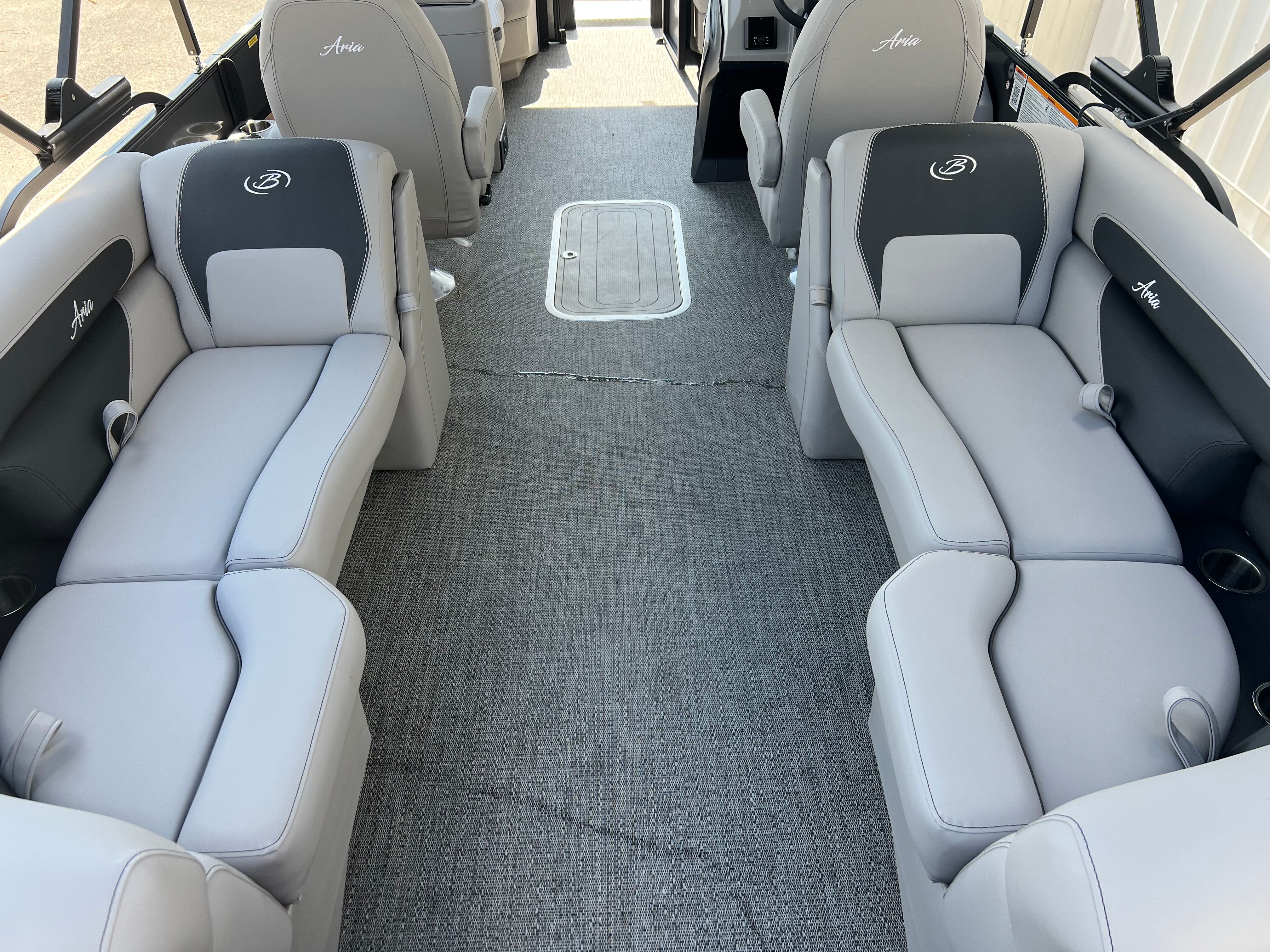 The Barletta Aria A22QC-Platinum is packed with special features that set it apart from other pontoon boats for sale. The Railskin Color Aria in Gray Moonstone gives the exterior a sophisticated and modern look, while the Blackout Package Aria adds a bold touch of elegance. Inside, the Tempest Gray furniture offers both comfort and style, creating a welcoming atmosphere for passengers. The Amore Gray flooring is not only visually appealing but also designed for durability and easy maintenance.One of the standout features is the Double Bimini canvas, providing ample shade and protection from the sun, so you can relax in comfort no matter the weather. The In Floor Midship Storage offers convenient space for stowing gear, water toys, and other essentials, keeping the deck clutter-free and organized. With the Triple Toon Package Aria, you’ll benefit from enhanced buoyancy and stability, making every ride smoother and more enjoyable.