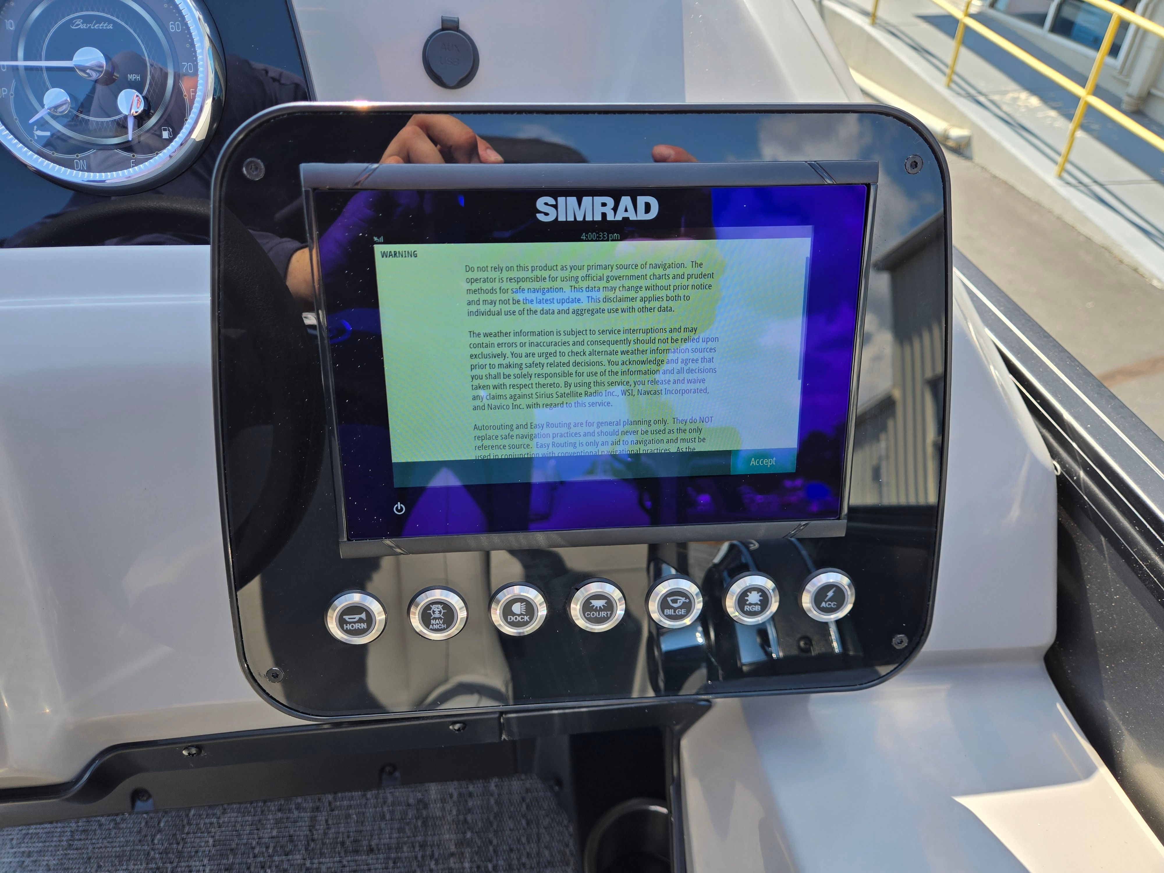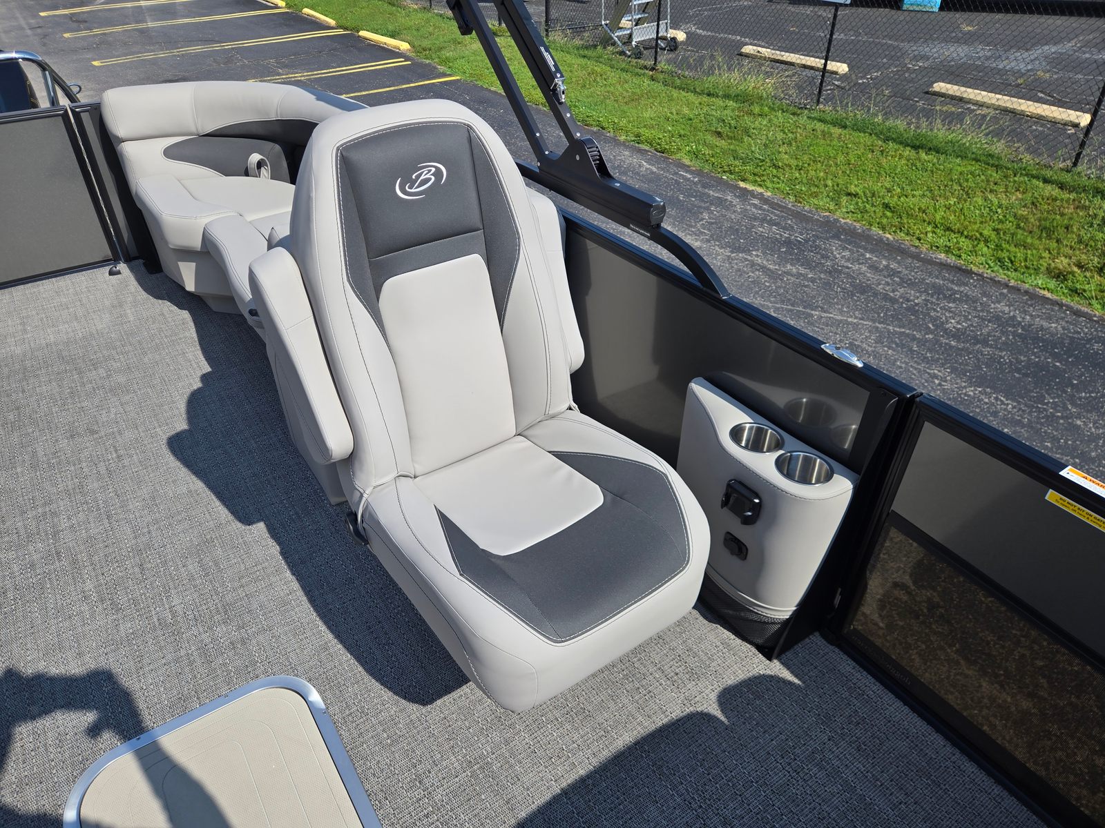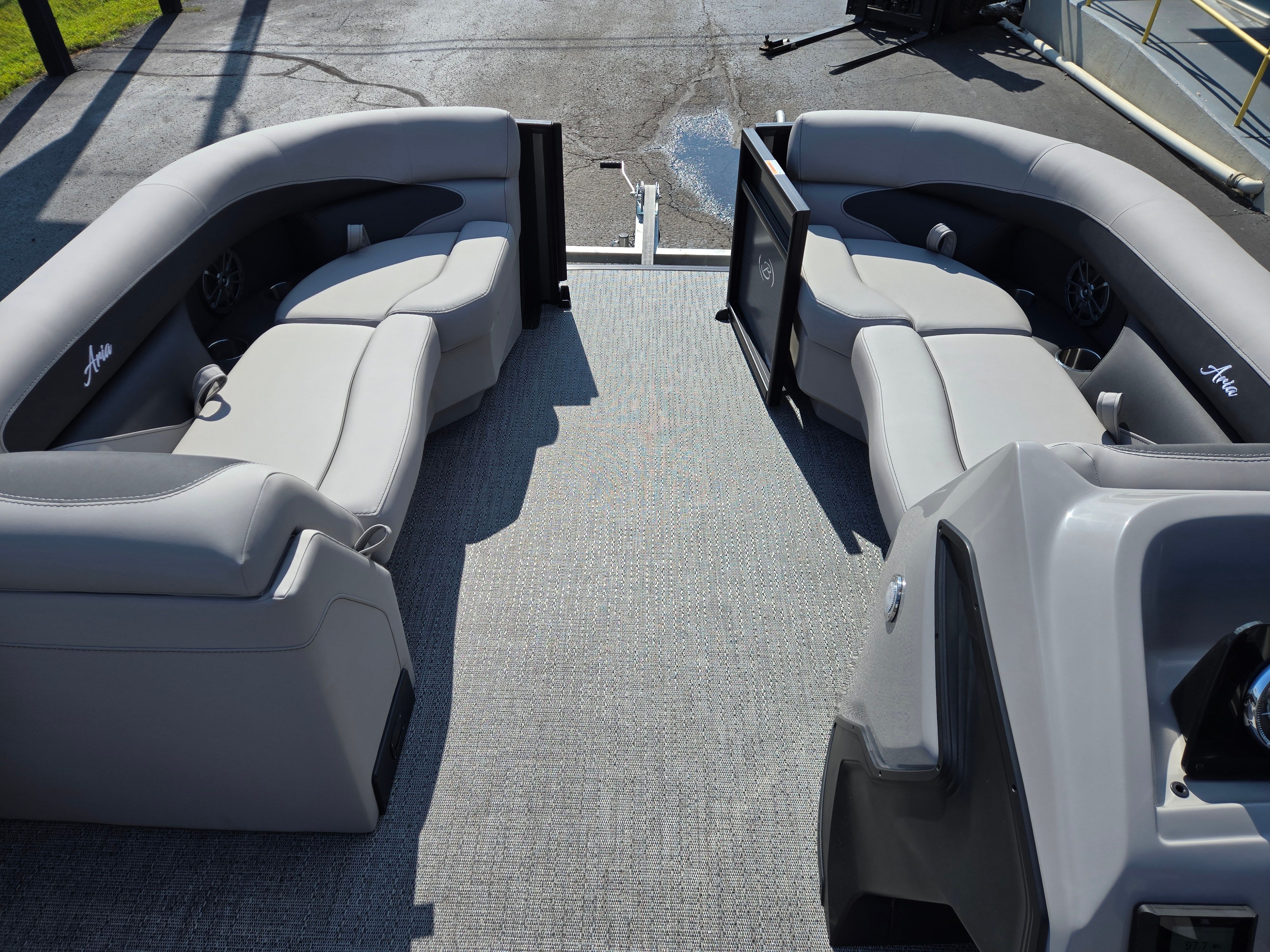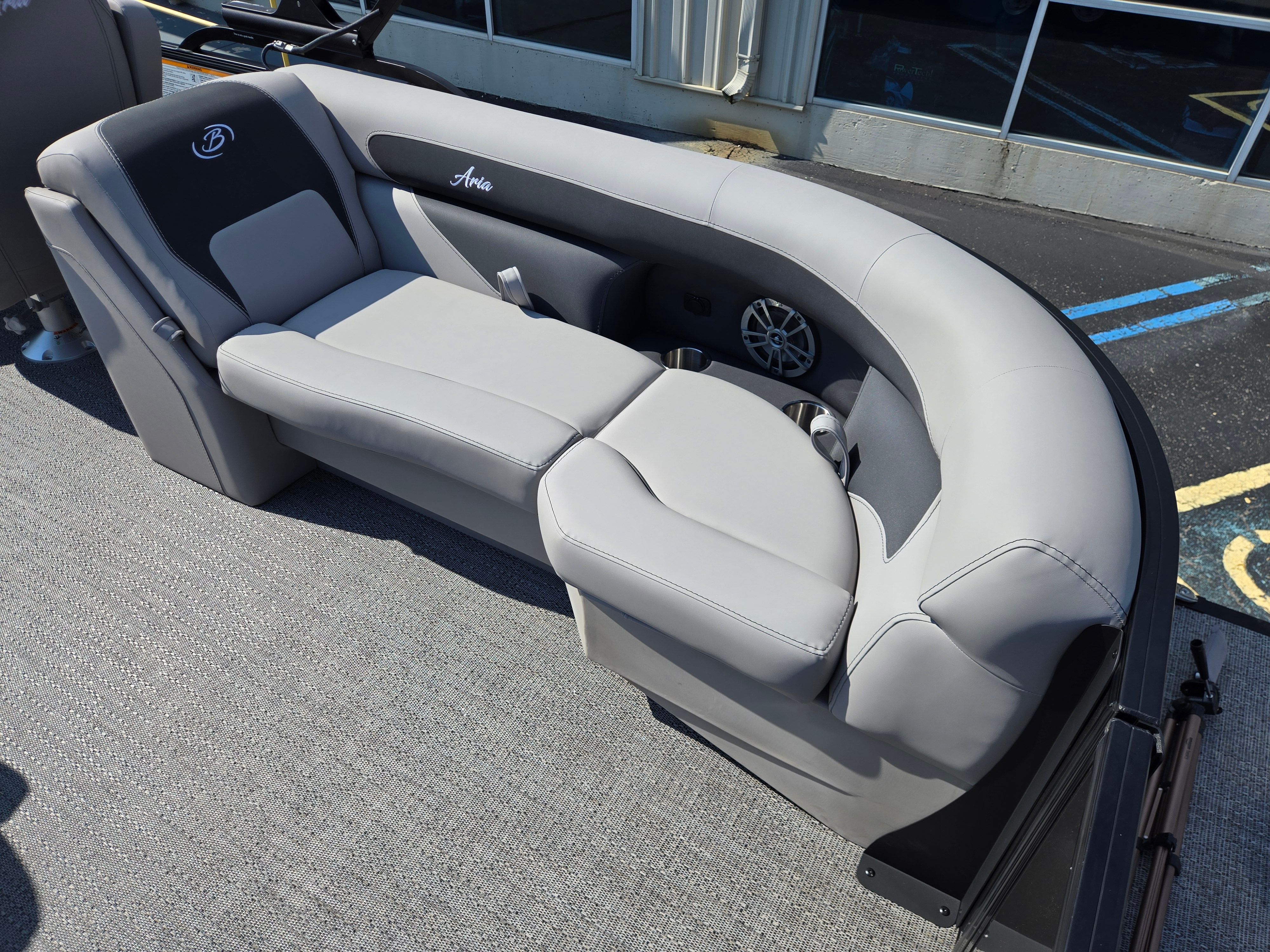 Step aboard the Barletta Aria A22QC-Platinum and discover a host of premium features designed to enhance your boating experience. The flooring is finished in Amore Gray, providing a stylish and comfortable surface that’s easy to maintain. The furniture, upholstered in Tempest Gray, offers plush seating and ergonomic support, ensuring every passenger enjoys maximum comfort throughout the day. The Triple Toon Package Aria adds stability and buoyancy, delivering a smooth and secure ride even in choppy waters.The railskin packages feature the Blackout Package Aria, complemented by the elegant Gray Moonstone railskin color, giving the boat a sophisticated and modern appearance. Navigation is made simple and intuitive with the Simrad 7" G07 XSE, a state-of-the-art display that provides real-time data and easy access to essential controls. Adding a touch of patriotism and style, the stainless steel flag pole with an American flag is a distinctive feature that sets this pontoon apart.