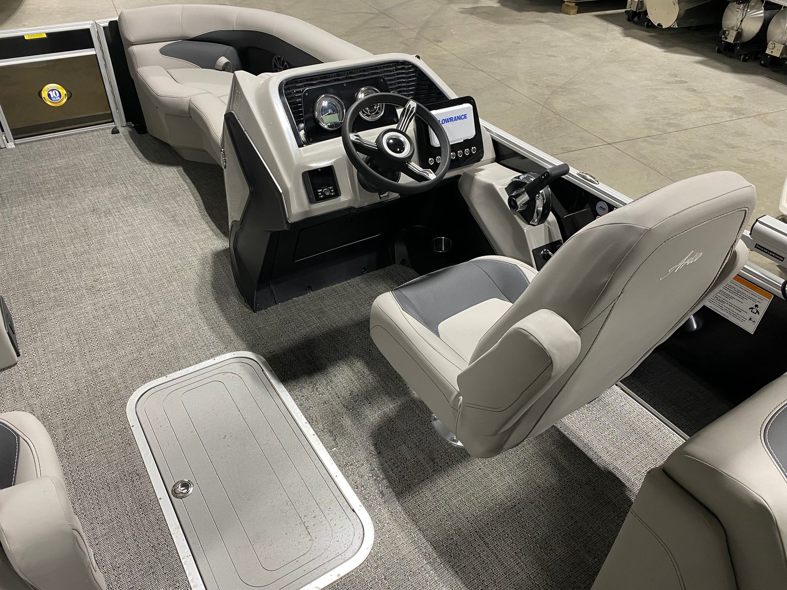 This Barletta pontoon boat is packed with features designed to maximize comfort, convenience, and fun. The Railskin Color Aria in Black Diamond gives the boat a bold, elegant look, while the Tempest Gray furniture offers plush seating for all your guests. The Amore Gray flooring is not only visually appealing but also durable and easy to maintain, ensuring your boat stays looking pristine season after season.The Triple Toon Package Aria provides added buoyancy and stability, making this pontoon boat ideal for a variety of water conditions. The in-floor midship storage offers ample space to stow away gear, water toys, and personal items, keeping the deck clutter-free and organized. The Eagle 5 GPS system ensures you always know your location and can navigate with confidence, whether you are exploring new waters or returning to your favorite spots.A stainless steel flag pole with an American flag adds a patriotic touch and enhances the boat’s overall aesthetic. The Drop Ship Engine - NO PROP configuration allows for customization based on your specific needs and preferences.