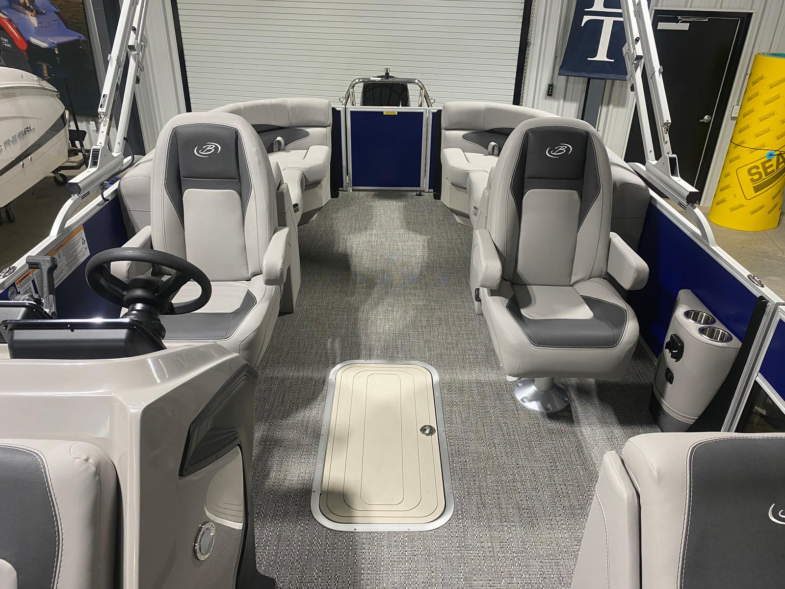 The Barletta Aria A22QC is a 2026 model pontoon boat, measuring just over 21 feet in length. This new vessel is crafted to offer ample space for friends and family, making it ideal for social gatherings, relaxing cruises, and memorable adventures. The Aria A22QC’s sleek profile and contemporary aesthetics are complemented by its Bohemian Blue Railskin color, which sets it apart from the crowd and ensures you’ll turn heads at every marina. The Tempest Gray furniture and Amore Gray flooring add a touch of sophistication and comfort, creating an inviting atmosphere for all aboard.
