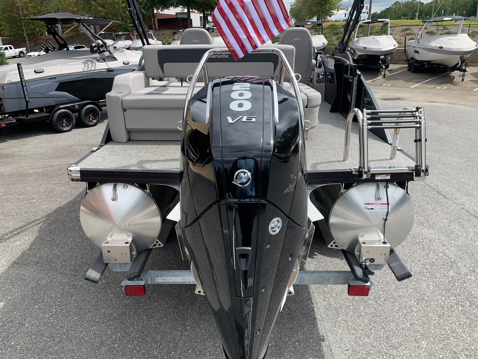 Step aboard the Barletta Aria A22UC-Platinum and discover a world of thoughtful features and high-end amenities. The flooring is finished in elegant Amore Gray, providing both durability and a contemporary look that complements the overall aesthetic. The Tempest Gray furniture offers plush seating and ergonomic support, ensuring that every passenger enjoys maximum comfort during long days on the water.The Blackout Package Aria railskin package adds a touch of sophistication and modern flair to the exterior, while the stainless steel flag pole with an American flag proudly displays your love for boating and country. The helm is equipped with a Simrad 7" G07 XSE, offering advanced navigation and control at your fingertips, so you can explore new waters with confidence.One of the standout features of this pontoon is the Triple Toon Package Aria, which enhances stability, buoyancy, and overall performance. This package also enables the inclusion of in-floor midship storage, providing ample space for all your gear, water toys, and essentials. With everything neatly stowed away, you can enjoy a clutter-free deck and make the most of your time on the water.