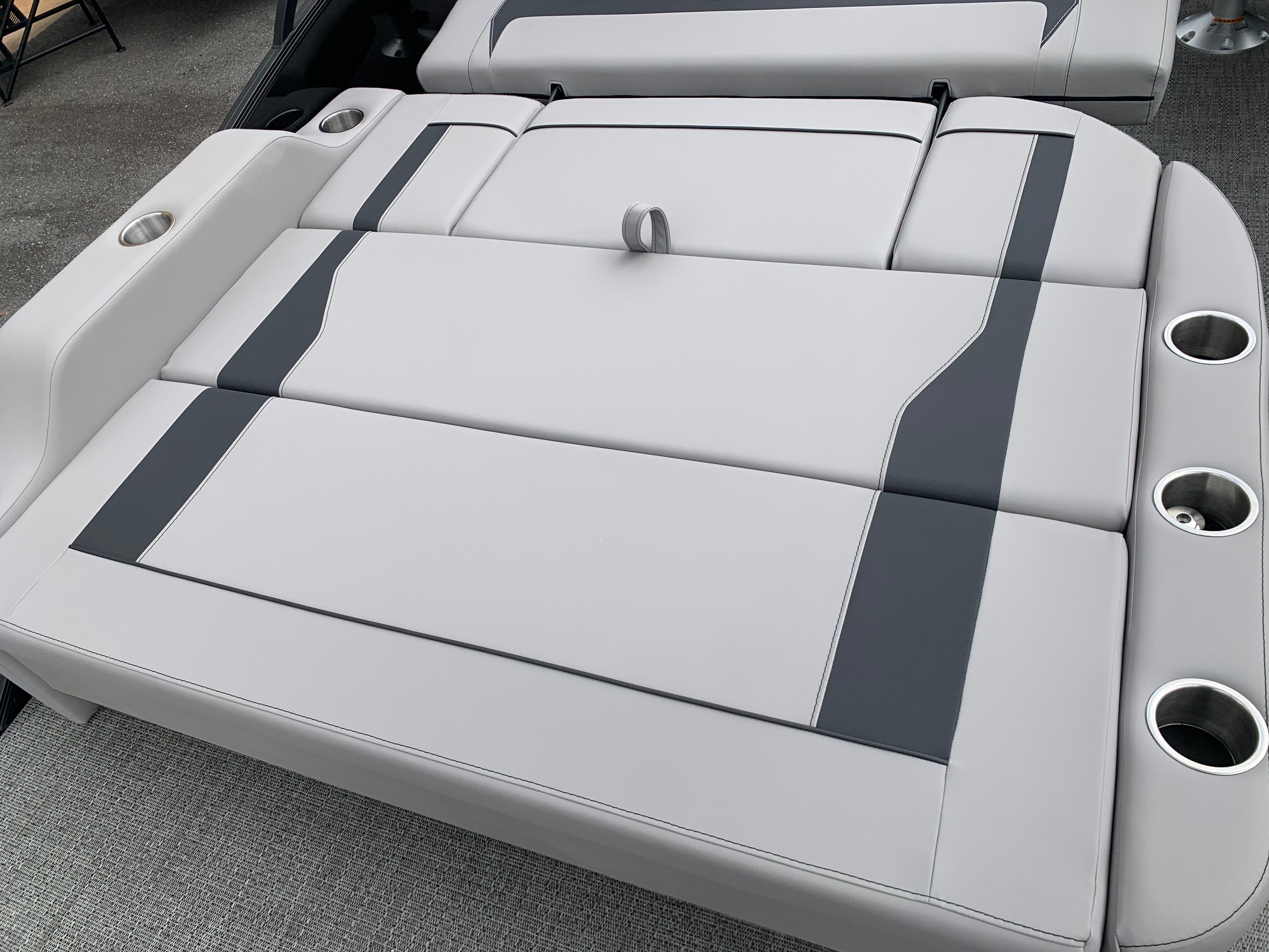 Beyond its recreational appeal, the Barletta Aria A22UC-Platinum is designed with practicality in mind. The in-floor midship storage, made possible by the Triple Toon Package Aria, offers a convenient solution for keeping your belongings organized and secure. This feature is especially valuable for families or groups who need extra space for life jackets, coolers, and water sports equipment.Docking and maneuvering are made simple thanks to the responsive power assist steering and the efficient Mercury engine. The sturdy construction and thoughtful layout ensure that boarding, loading, and unloading are hassle-free, so you can focus on enjoying your time on the water. The durable Amore Gray flooring is easy to clean and maintain, ensuring your pontoon looks great season after season.