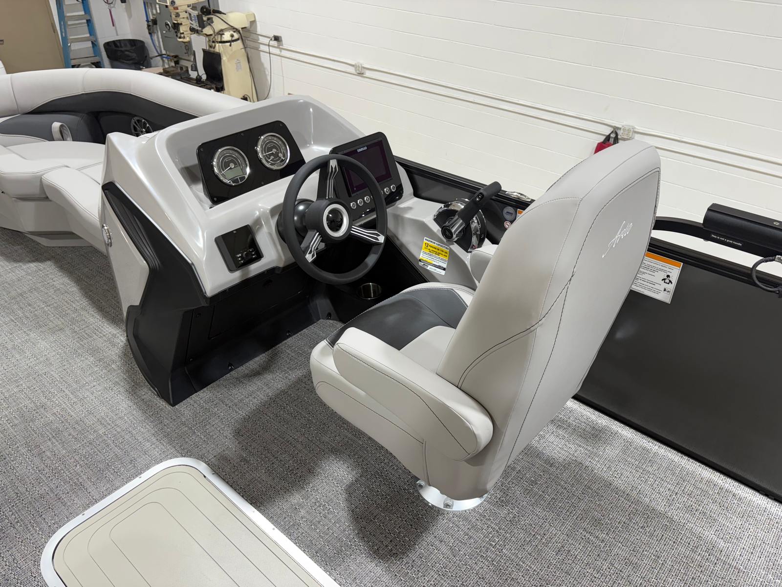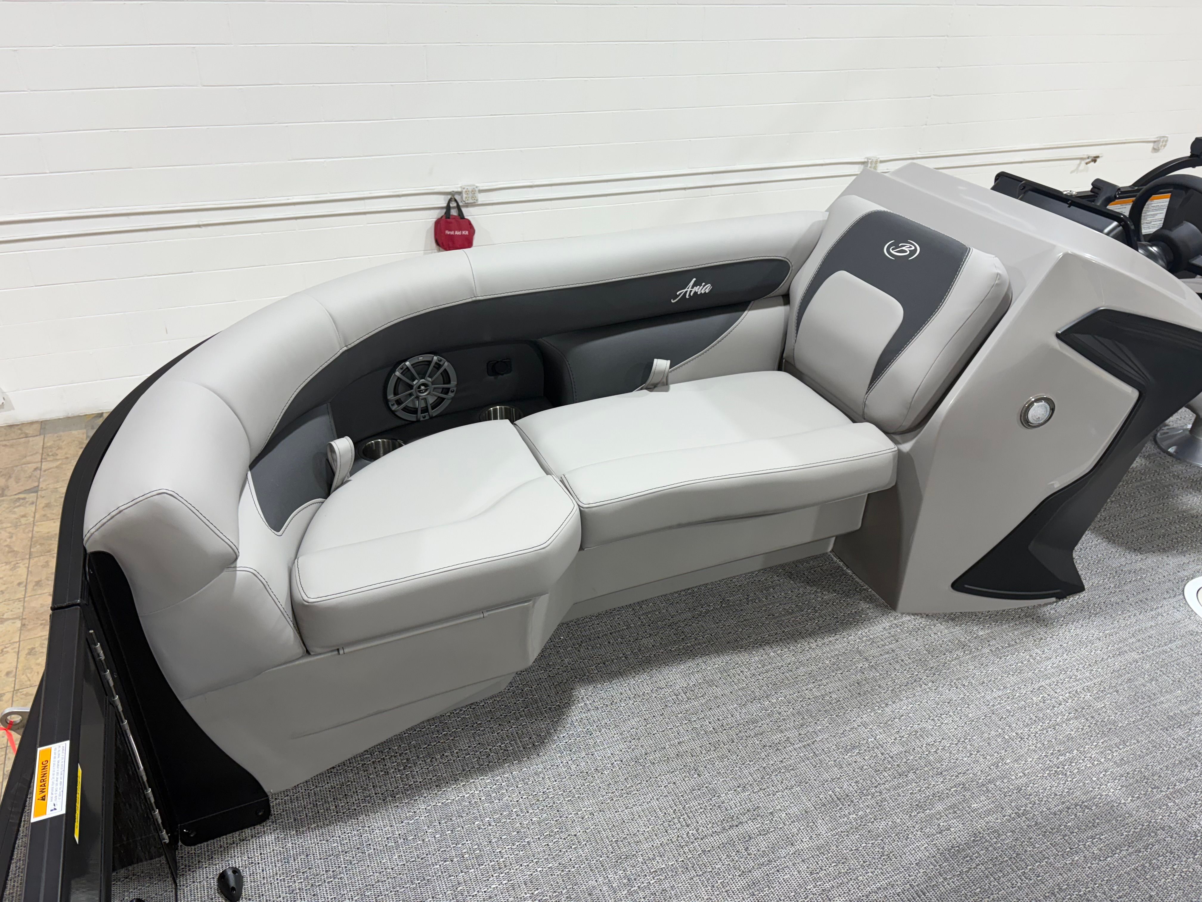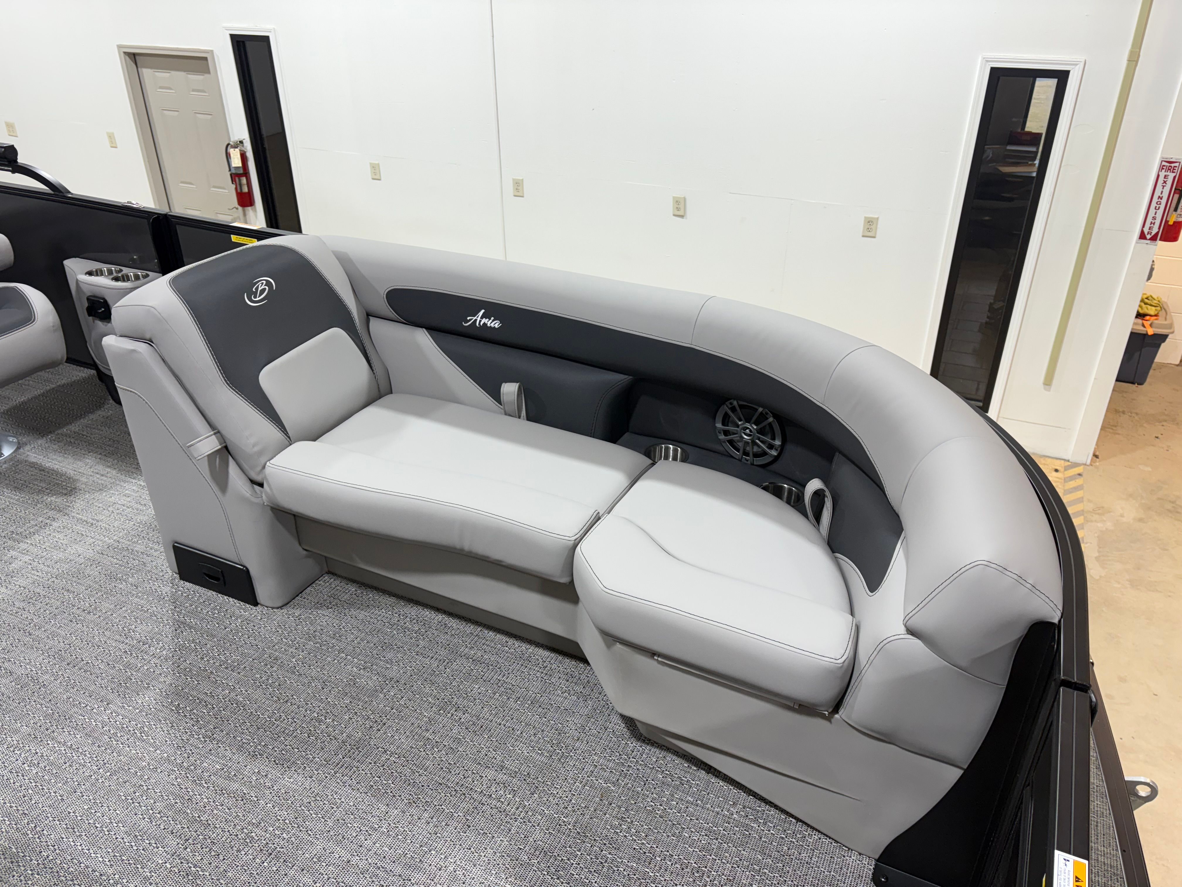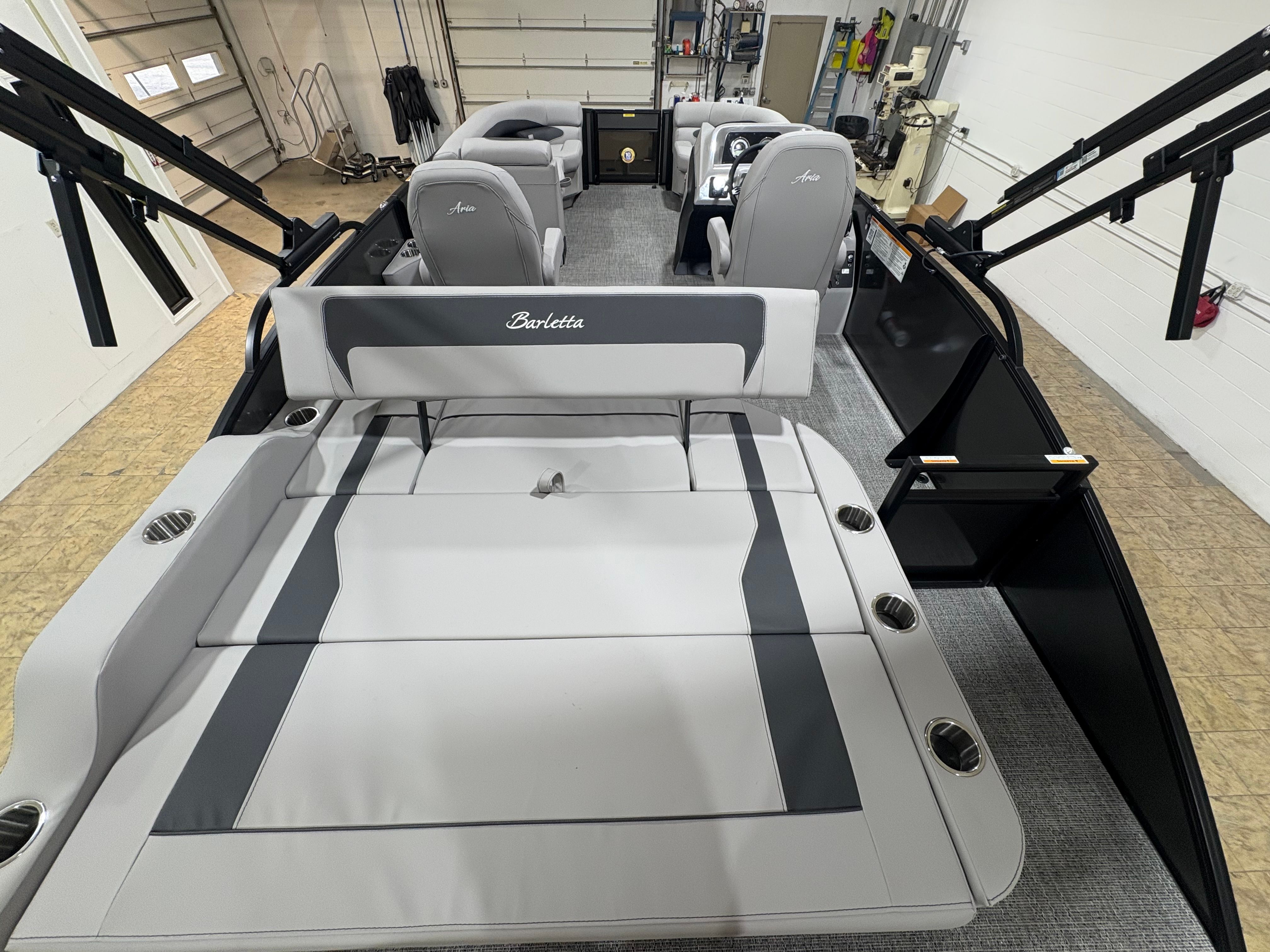 The 2026 Barletta Aria A22UC-Platinum is a stunning pontoon boat measuring just over 21 feet in length, making it ideal for both intimate gatherings and larger social events. Its modern silhouette and eye-catching Railskin Color Aria in Gray Moonstone, complemented by the Blackout Package Aria, ensure that this boat turns heads wherever it goes. The Tempest Gray furniture and Amore Gray flooring create a sophisticated and inviting atmosphere, perfect for relaxing or entertaining guests. As a new Barletta boat for sale, this model offers the latest innovations and craftsmanship, guaranteeing a premium boating experience from the moment you step aboard.