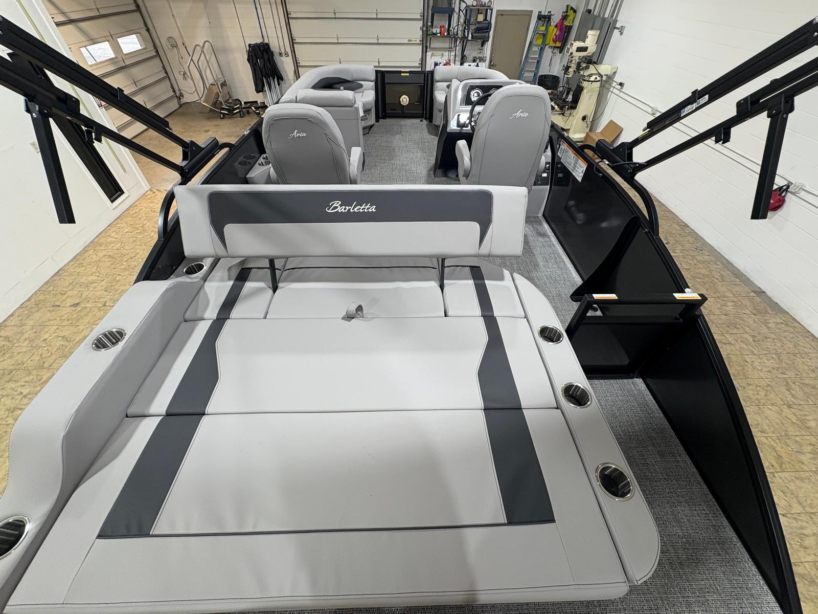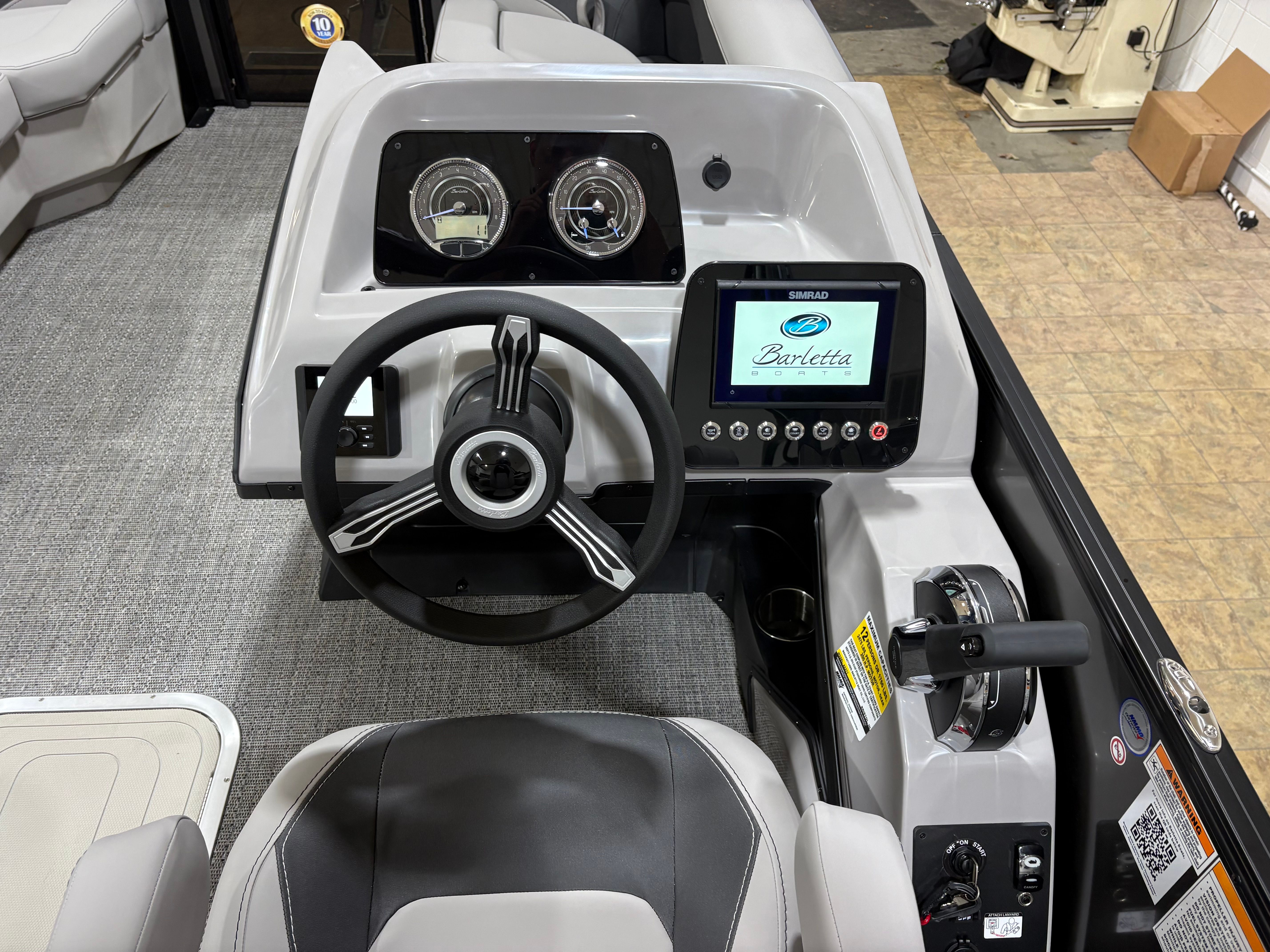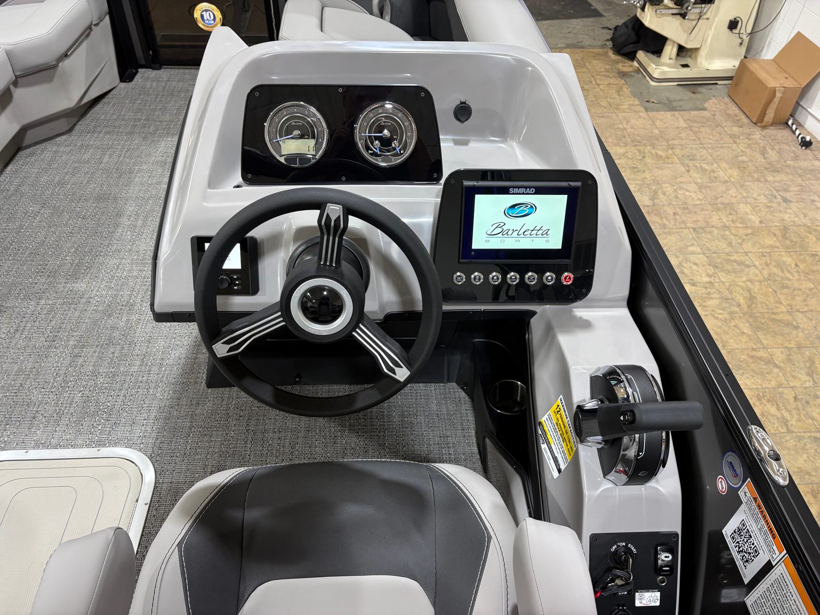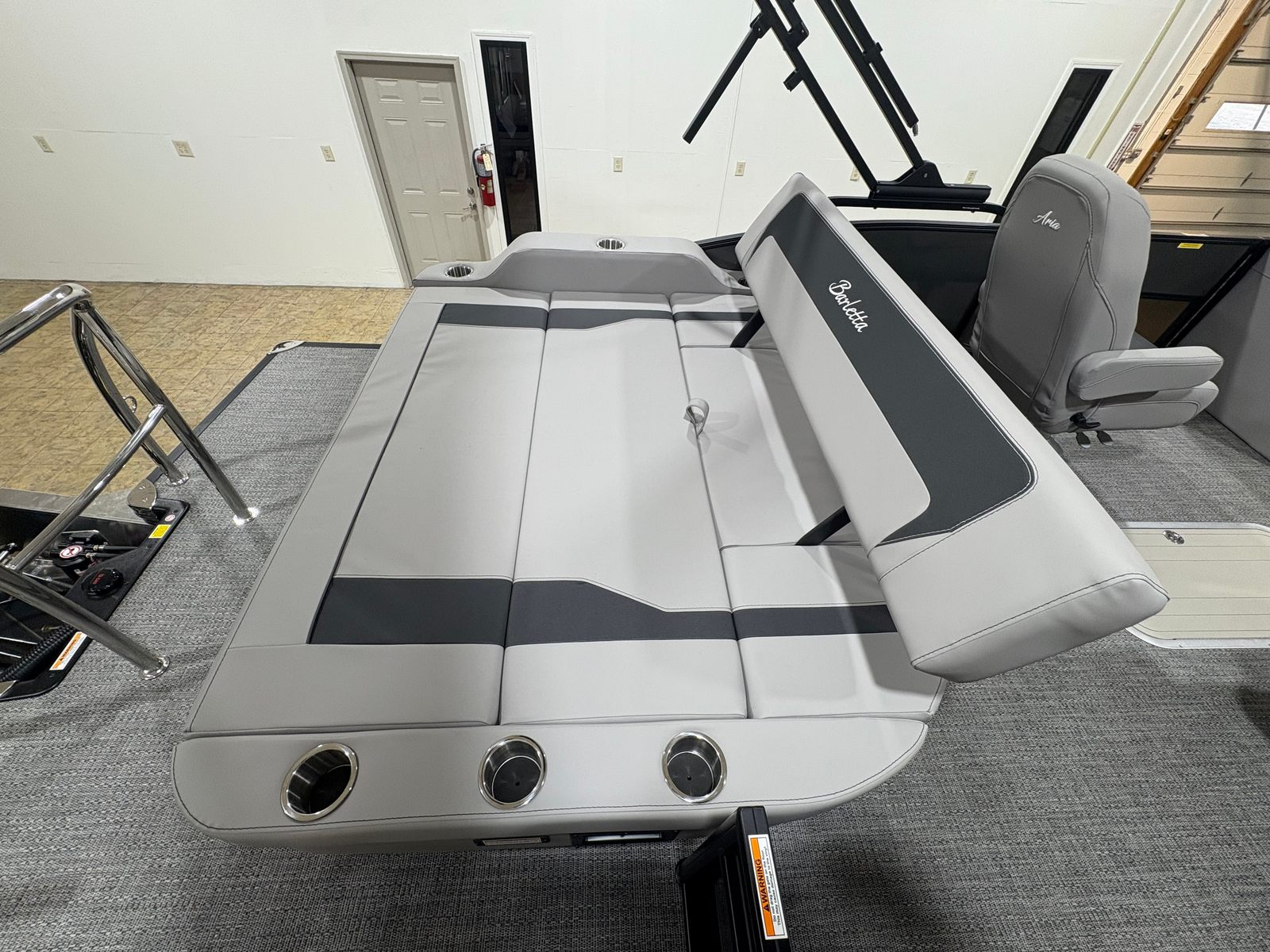 This Barletta pontoon boat is packed with special features designed to elevate your time on the water. The Railskin Color Aria in Gray Moonstone and the Blackout Package Aria give the exterior a sleek, modern look that’s sure to impress. Inside, the Tempest Gray furniture provides plush seating and comfort, while the Amore Gray flooring adds a touch of elegance and practicality. The Triple Toon Package Aria enhances the boat’s stability and ride quality, making it perfect for a variety of activities. The Mercury pre-rig with power assist and stainless steel prop ensures optimal engine performance and easy handling. For added flair, the exterior features a stainless steel flag pole with an American flag, showcasing your pride and style. The interior boasts in-floor midship storage (available with the Triple Toon package), offering convenient space for gear, water toys, and personal items.