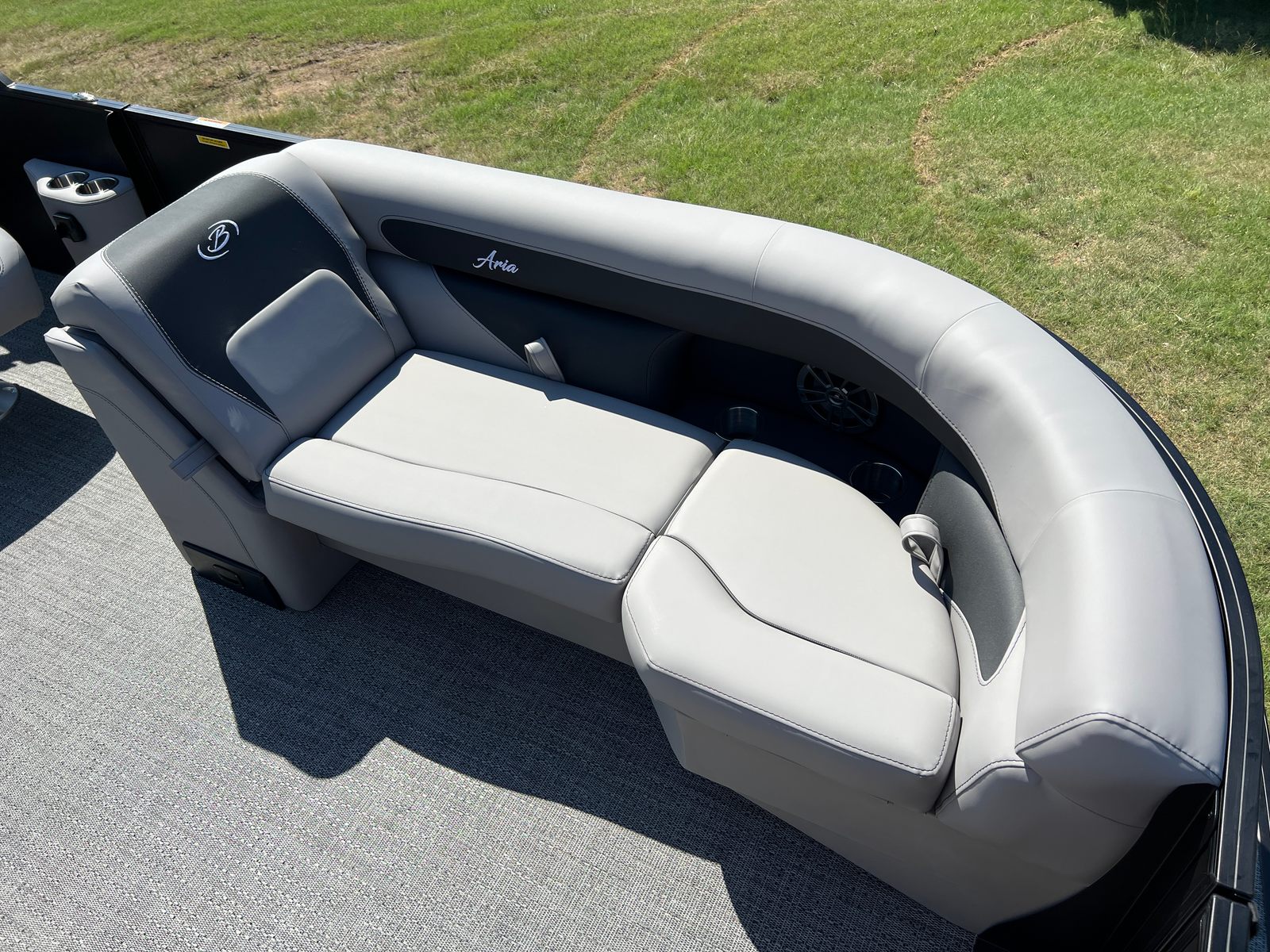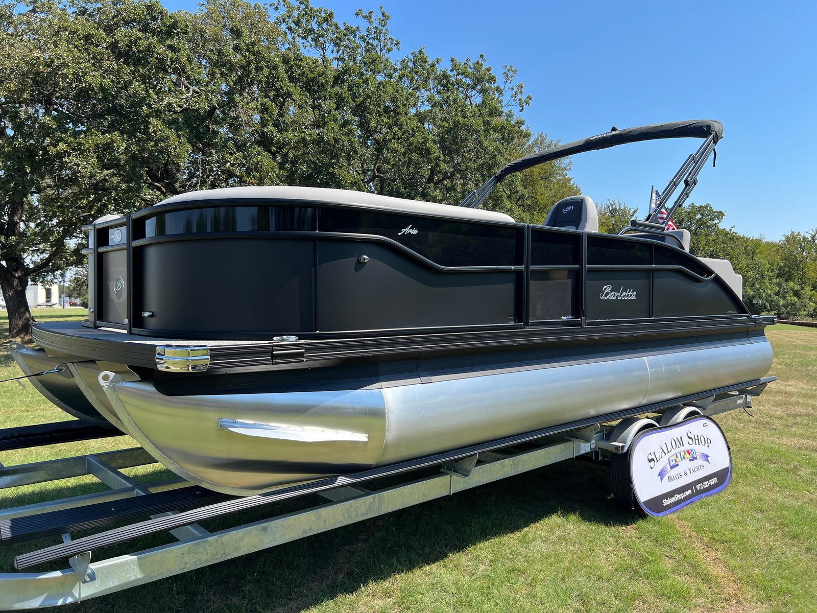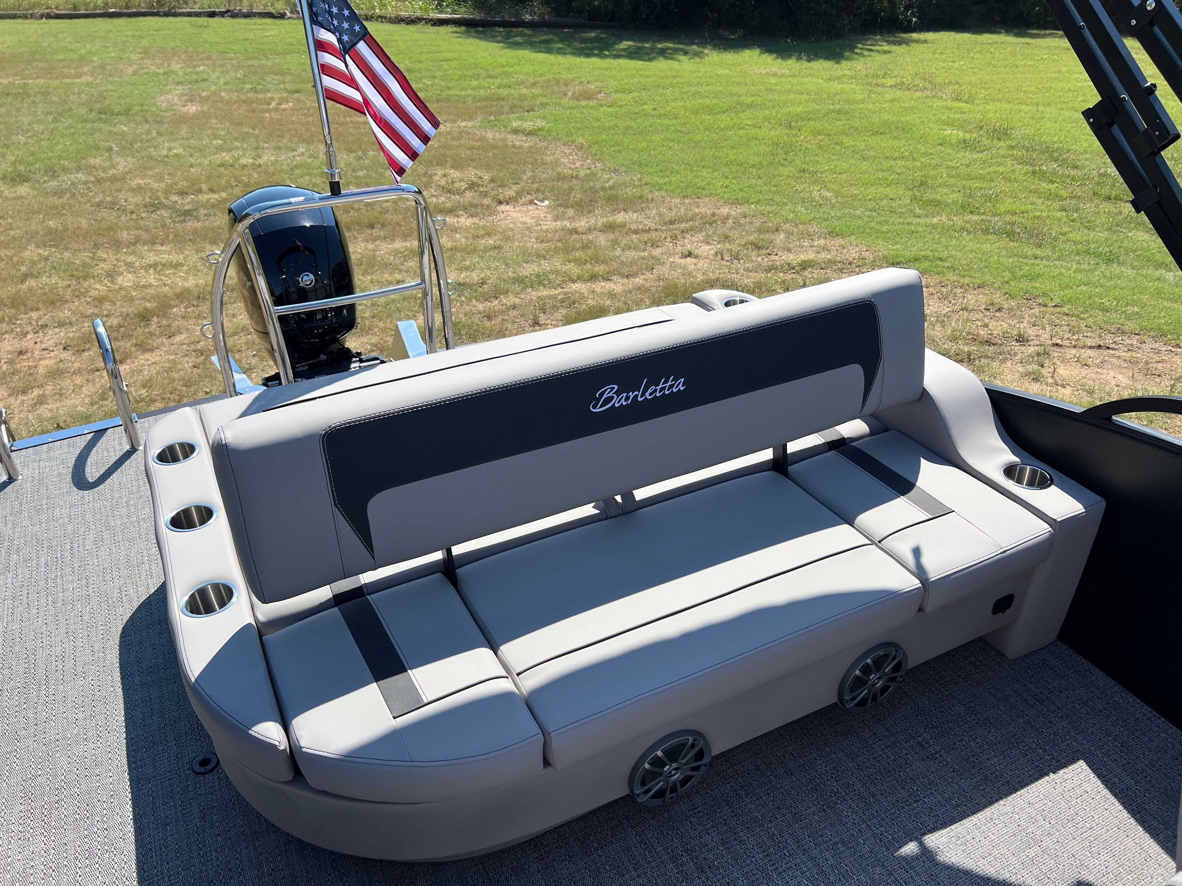 The 2026 Barletta Aria A22UC is loaded with features that set it apart from other pontoon boats for sale. The Railskin Color Aria in Matte Black, complemented by the Blackout Package Aria, gives this pontoon a striking and contemporary appearance that is sure to turn heads at the dock. The Tempest Gray furniture provides a sophisticated and inviting atmosphere, while the Amore Gray flooring is both stylish and easy to maintain. The in-floor midship storage offers a convenient solution for stowing away gear, water toys, and personal items, keeping the deck clutter-free and organized. A stainless steel flag pole with an American flag adds a patriotic touch, perfect for celebrating holidays or simply showing your pride on the water.