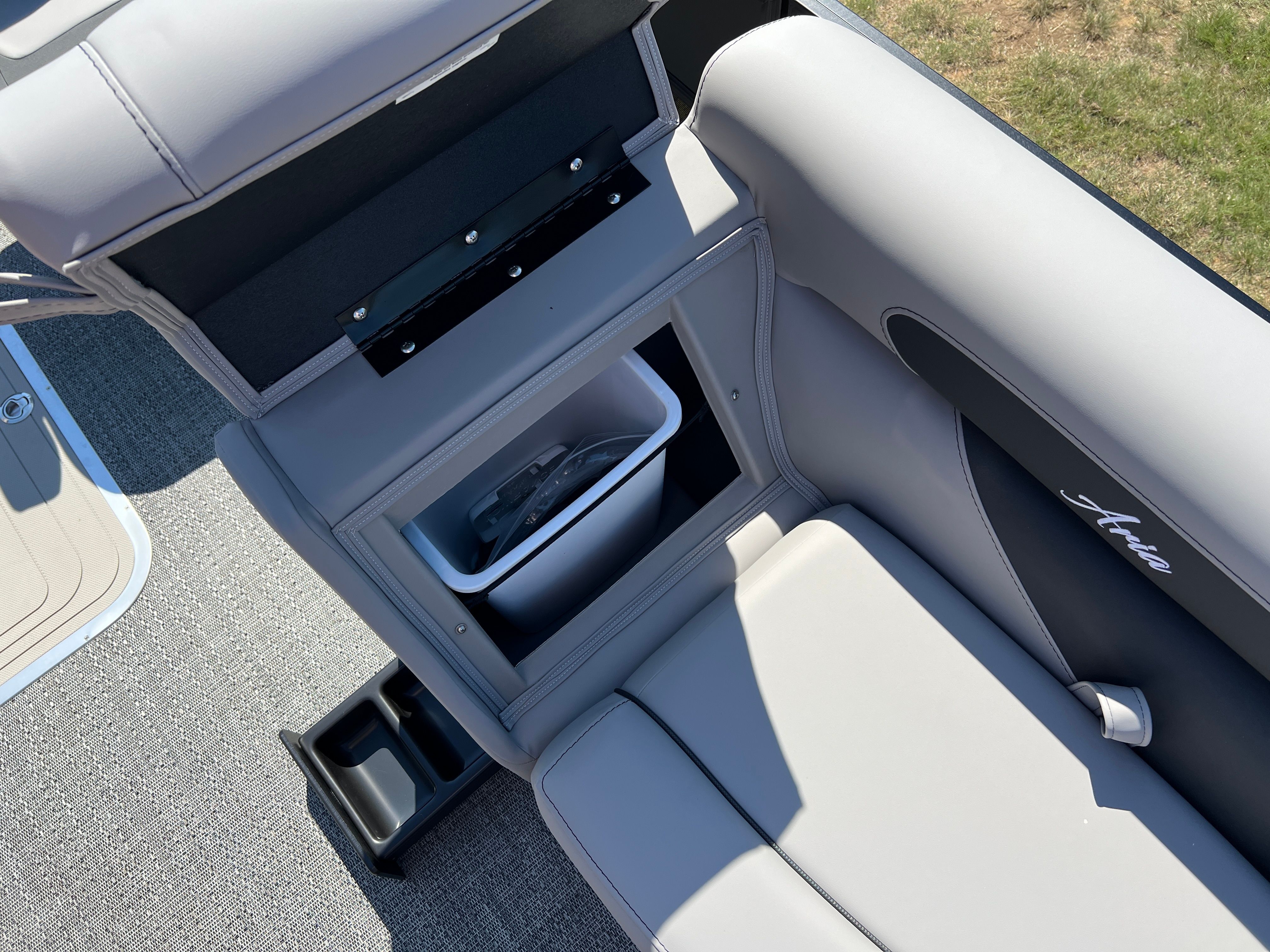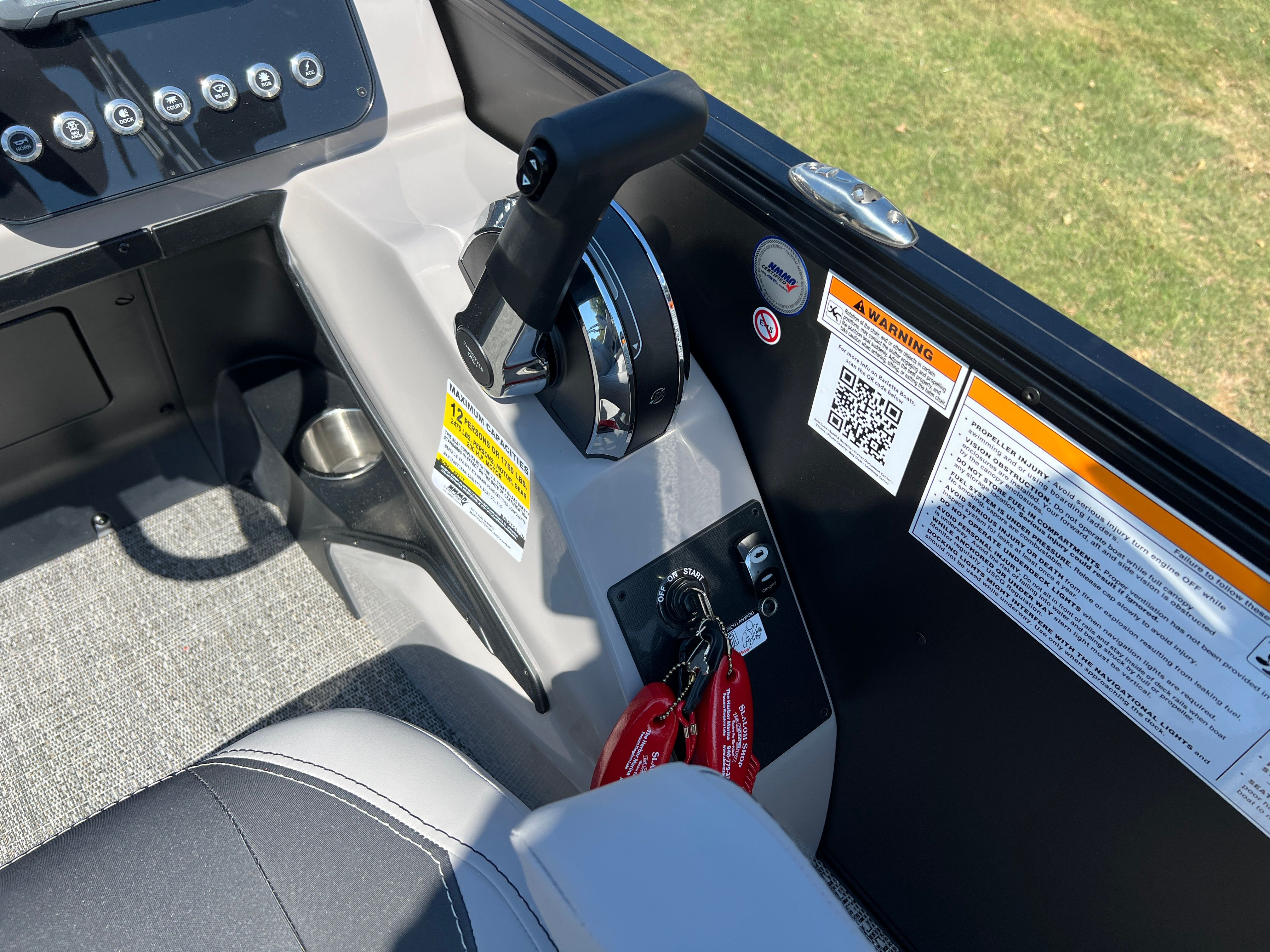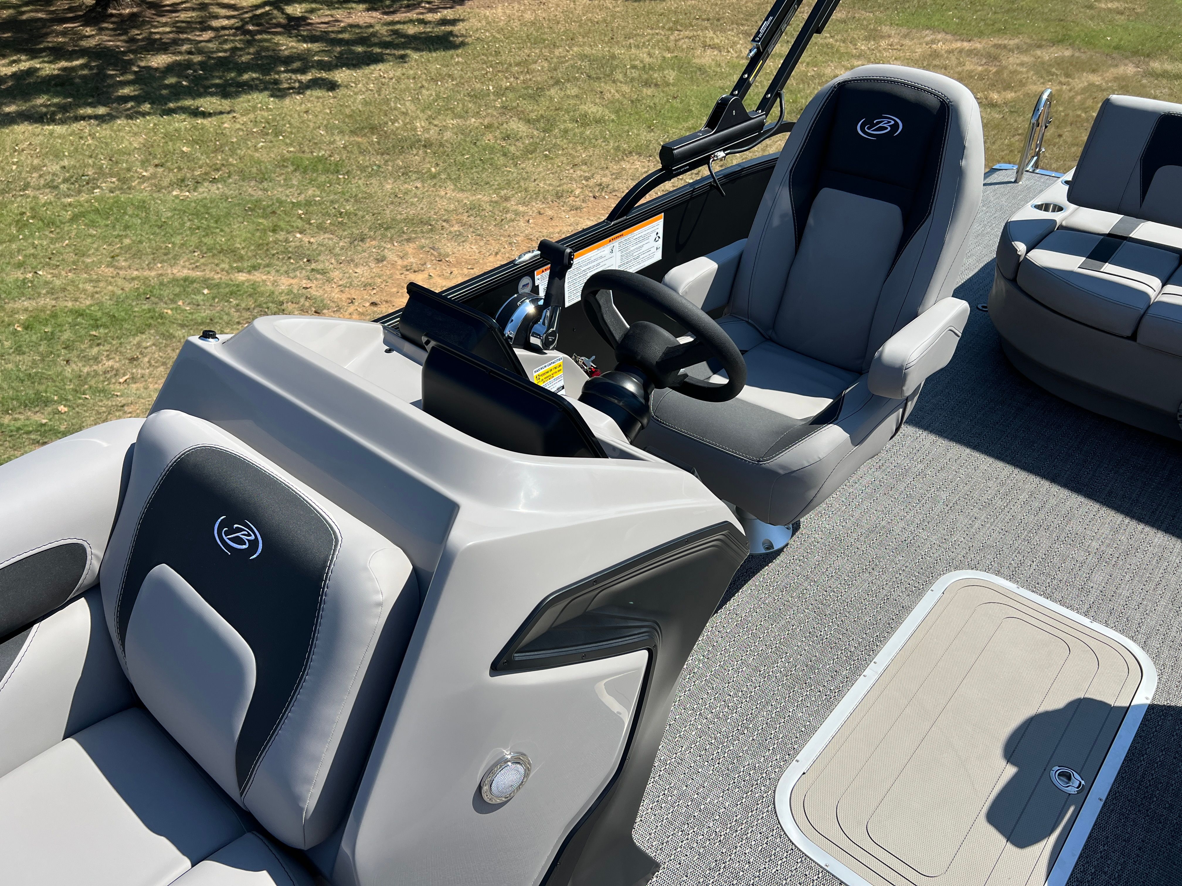 The 2026 Barletta Aria A22UC is loaded with features that set it apart from other pontoon boats for sale. The Railskin Color Aria in Matte Black, complemented by the Blackout Package Aria, gives this pontoon a striking and contemporary appearance that is sure to turn heads at the dock. The Tempest Gray furniture provides a sophisticated and inviting atmosphere, while the Amore Gray flooring is both stylish and easy to maintain. The in-floor midship storage offers a convenient solution for stowing away gear, water toys, and personal items, keeping the deck clutter-free and organized. A stainless steel flag pole with an American flag adds a patriotic touch, perfect for celebrating holidays or simply showing your pride on the water.