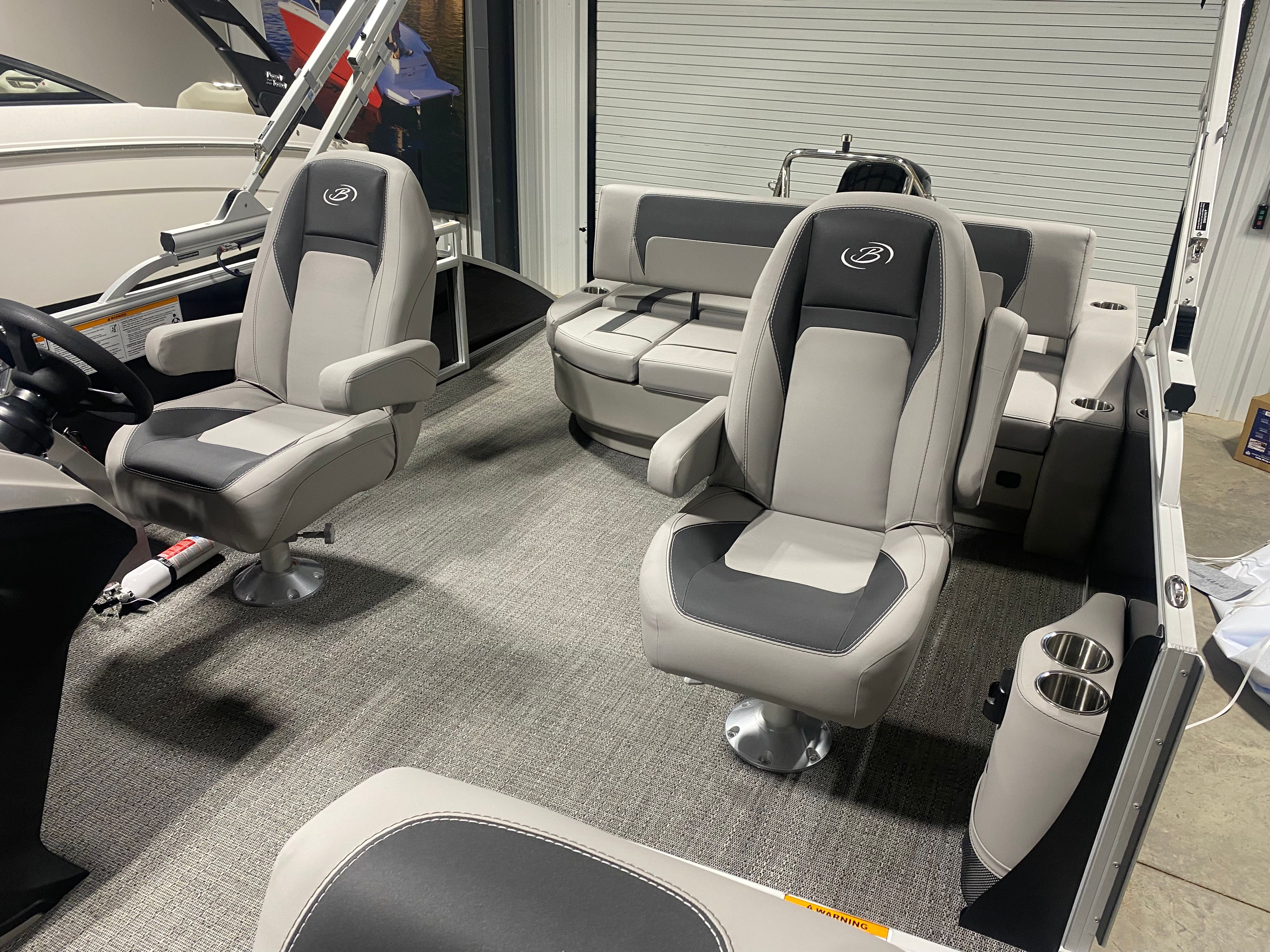 The Barletta Aria A22UC is a 2026 model pontoon boat that measures just over 21 feet in length, offering ample space for socializing, lounging, and enjoying the open water. Its contemporary aesthetic is highlighted by the Railskin Color Aria in Black Diamond, giving the boat a sophisticated and modern look that is sure to turn heads at any marina or lake. The Tempest Gray furniture and Amore Gray flooring create a harmonious and inviting atmosphere, making every outing a pleasure. As a new pontoon boat for sale, this vessel promises pristine condition and the latest advancements in pontoon design.