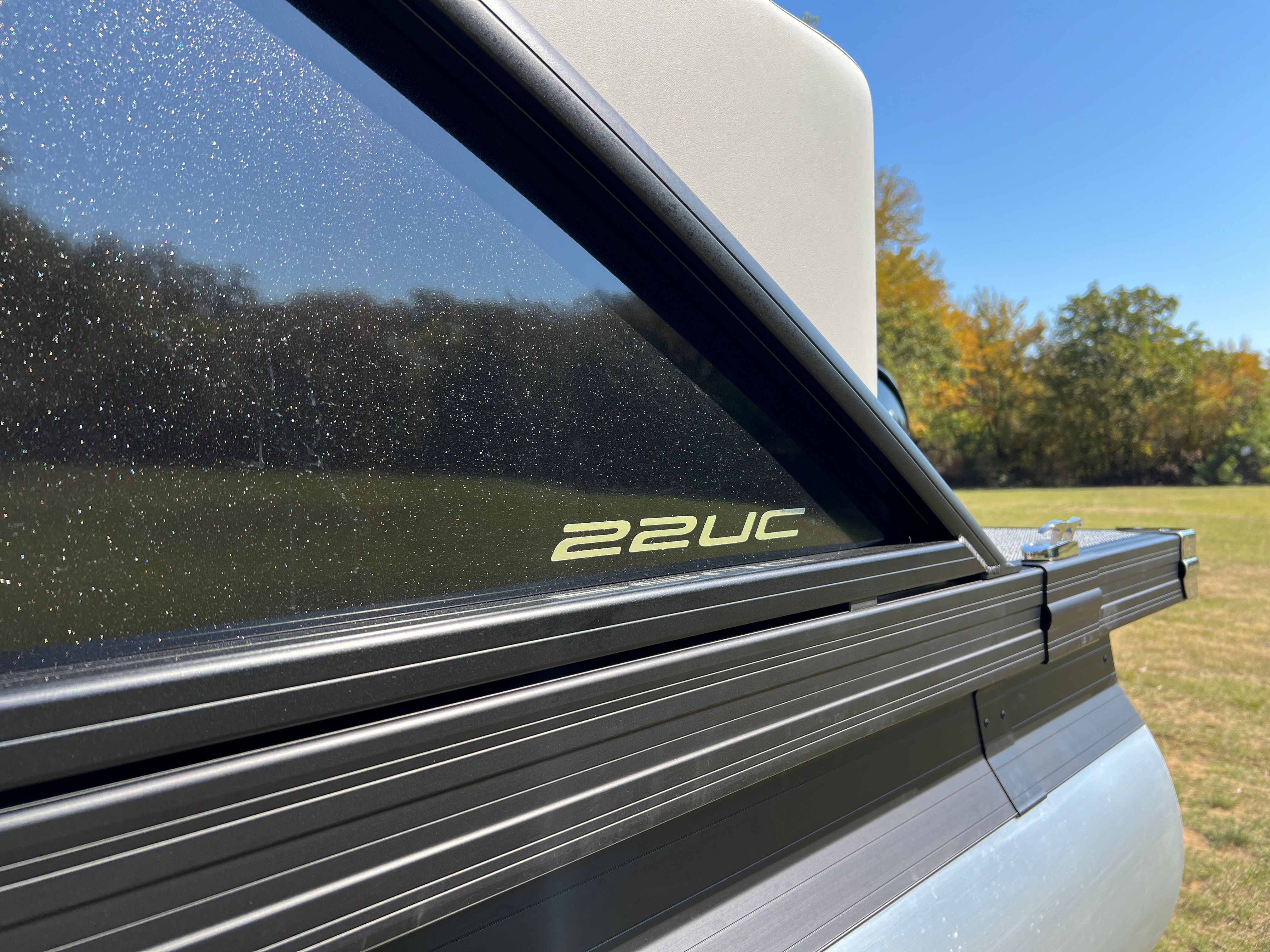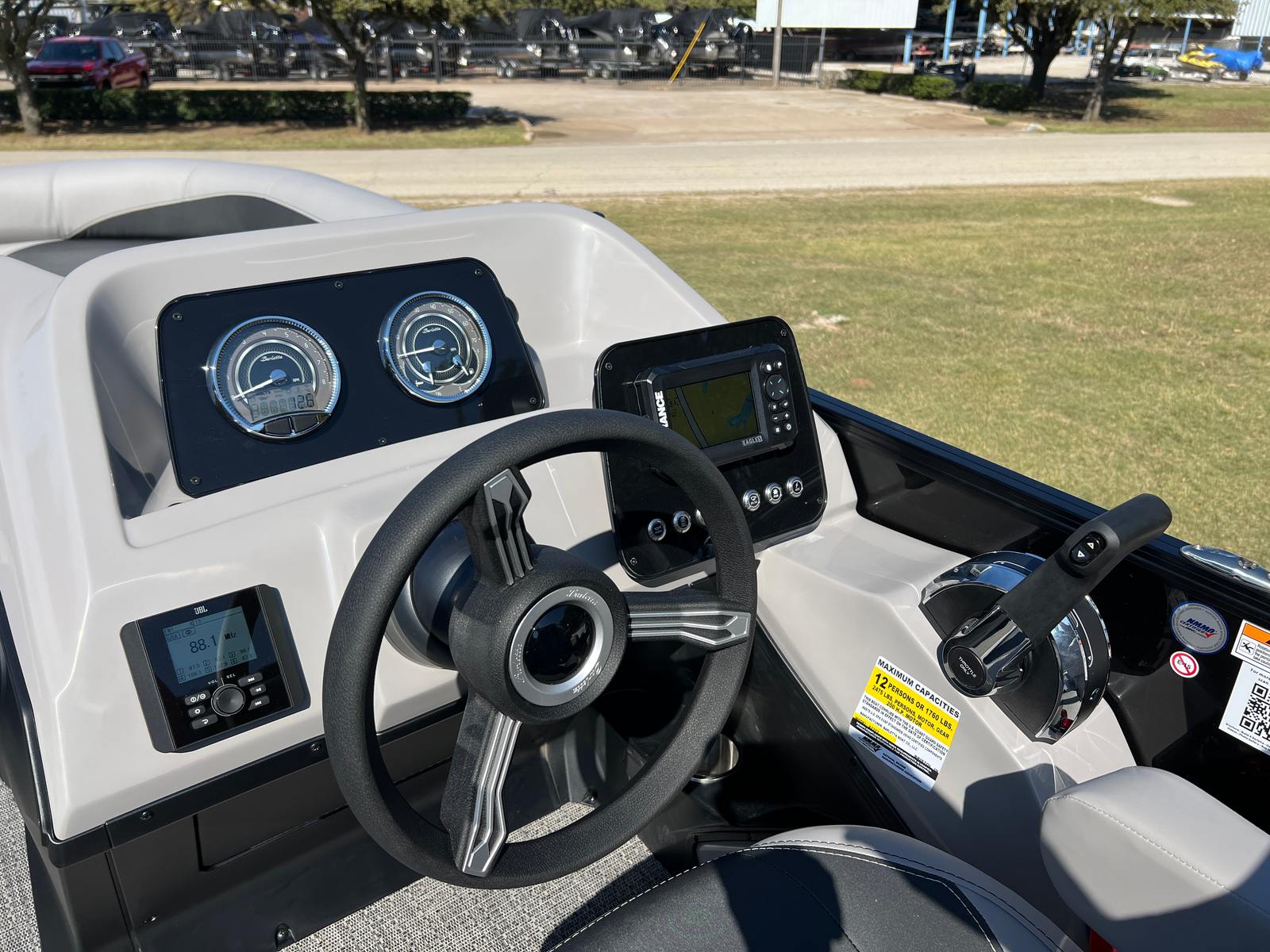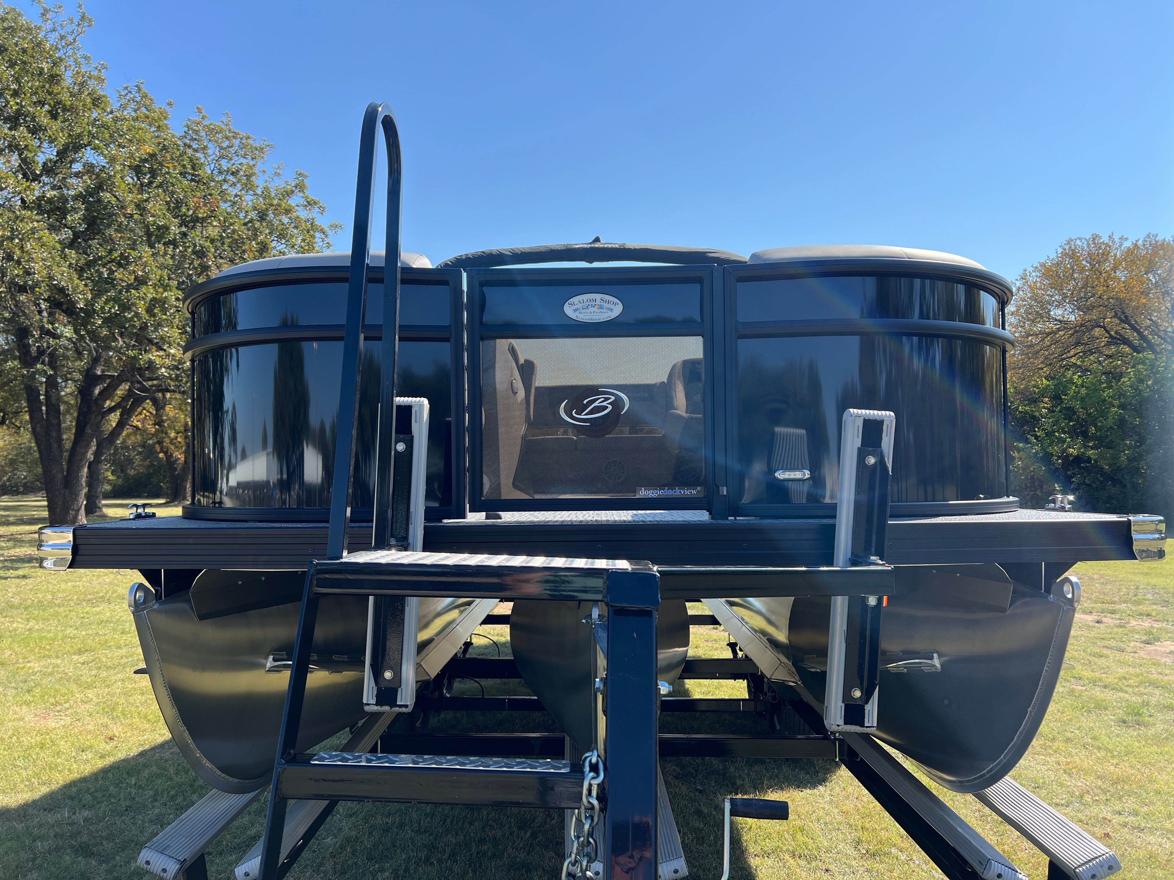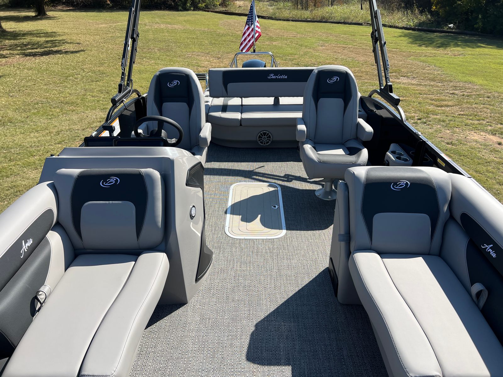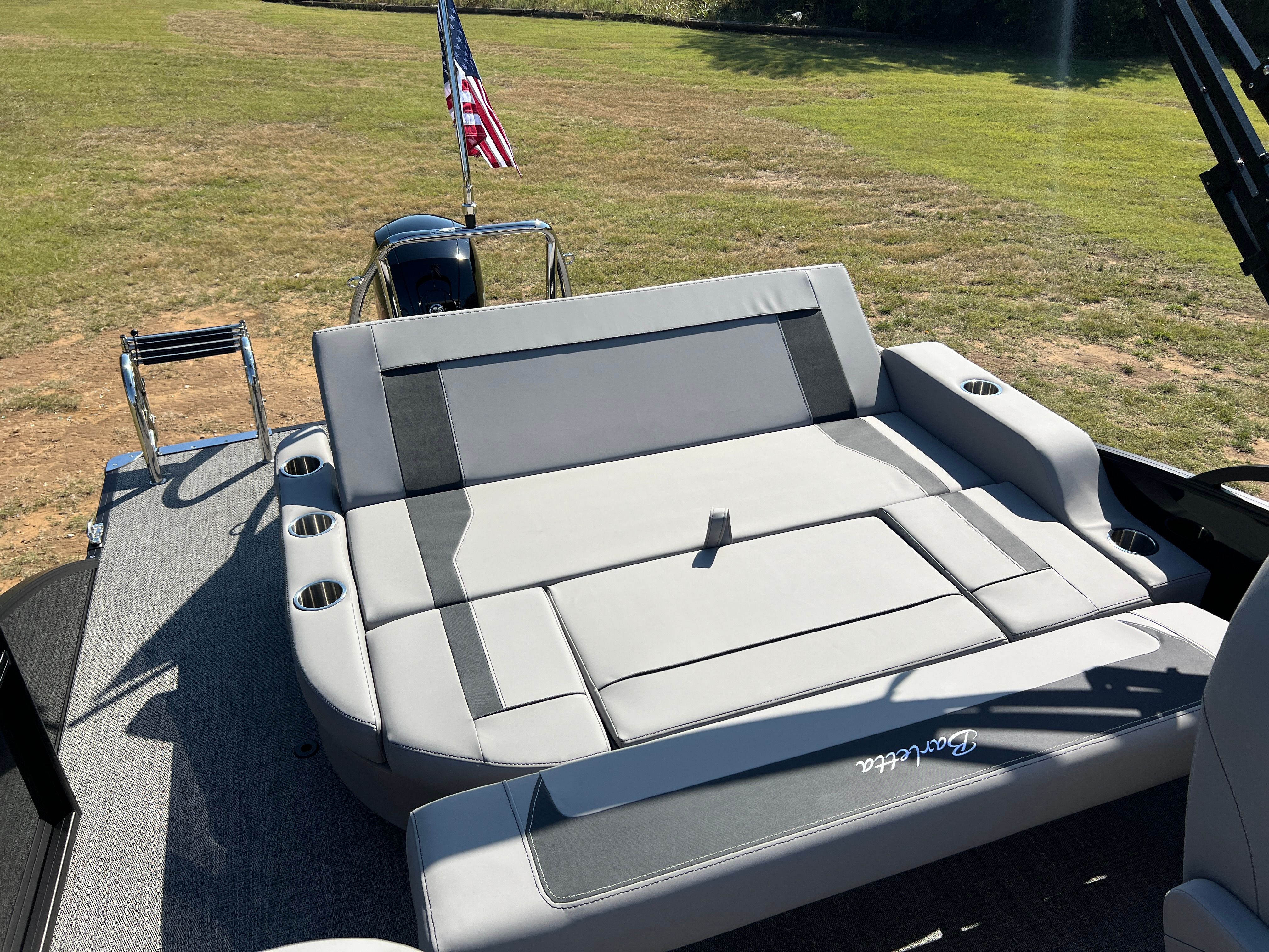 The Barletta Aria A22UC is packed with special features that elevate your boating experience. The Railskin Color Aria in Black Diamond and the Blackout Package Aria give the boat a bold, sophisticated look, while the Tempest Gray furniture and Amore Gray flooring create a modern, comfortable interior. The Triple Toon Package Aria adds an extra layer of stability and performance, making this pontoon ideal for larger groups and more active outings. The in-floor midship storage provides convenient space for stowing gear, water toys, and personal items, keeping the deck clutter-free and organized. A stainless steel flag pole with an American flag adds a patriotic touch, perfect for holiday weekends and special occasions.