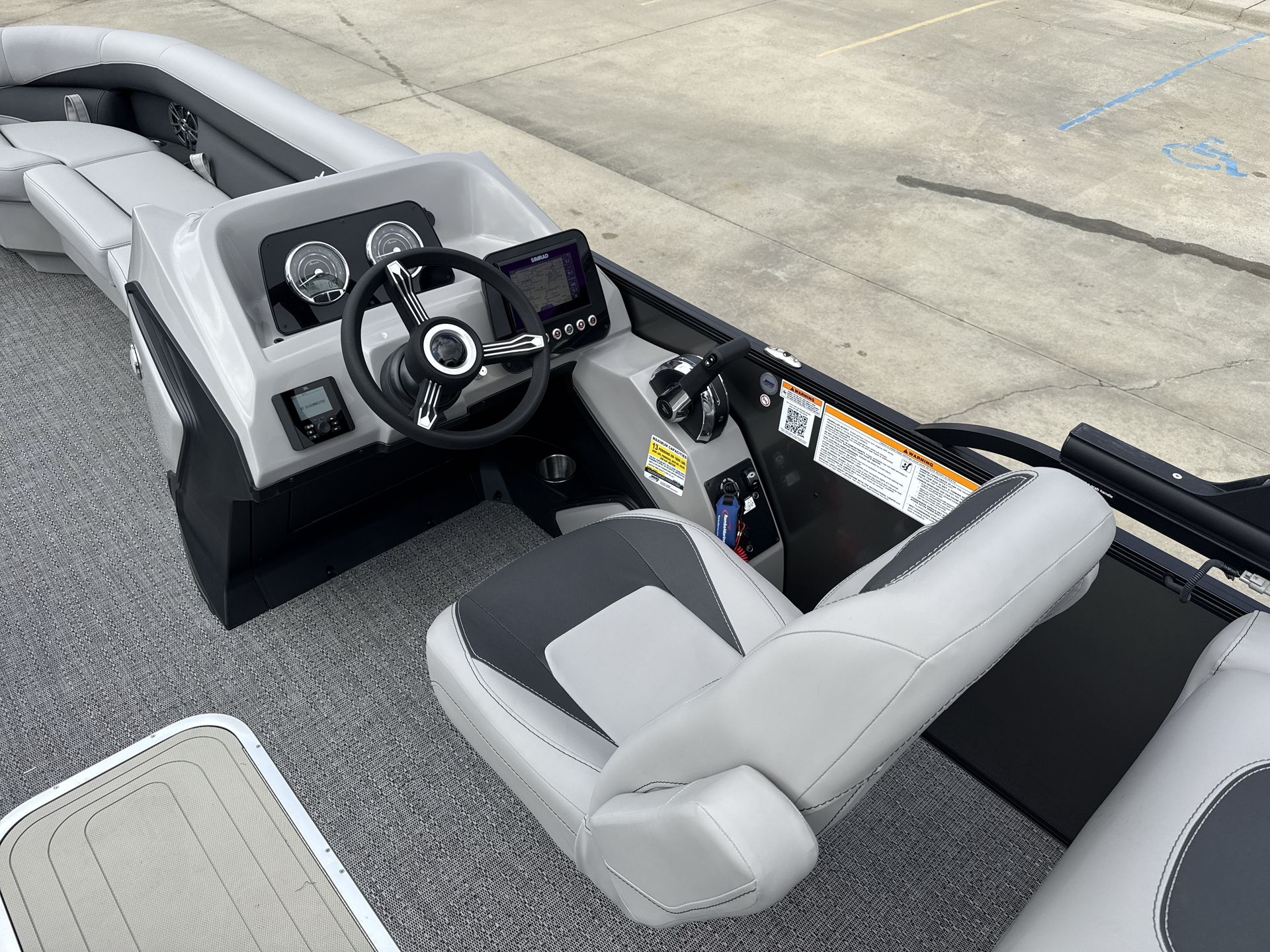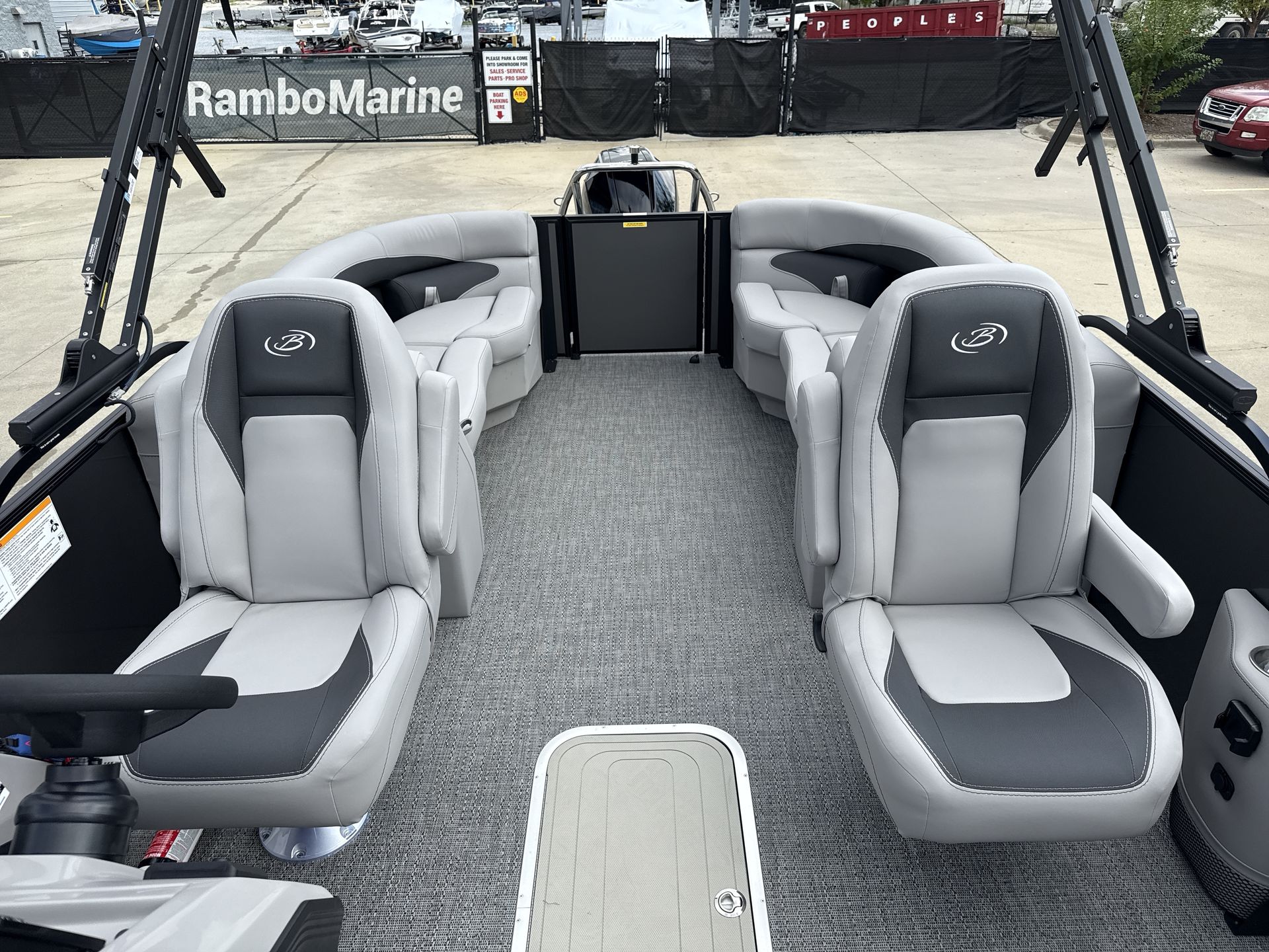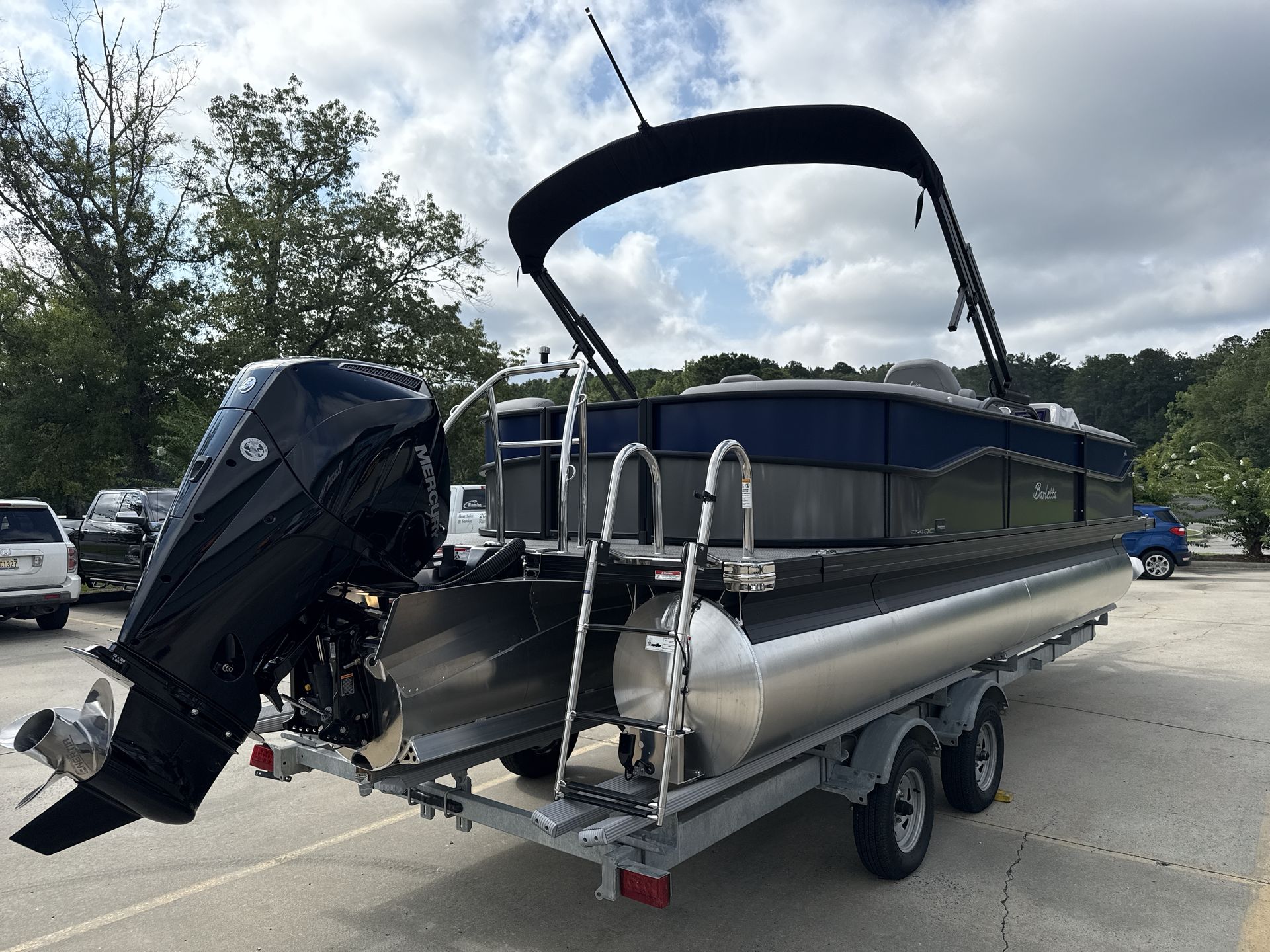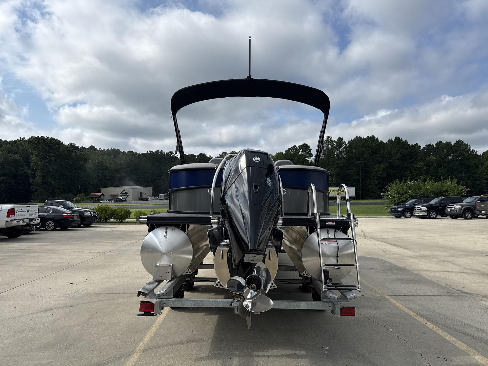 The 2026 Barletta Aria A24QC is loaded with features that set it apart from other pontoon boats for sale. The Railskin Color Aria in Gray Moonstone, complemented by the Bohemian Blue accent and Blackout Package Aria, creates a sophisticated and modern exterior that is sure to impress. Inside, the Tempest Gray furniture offers plush seating and a contemporary look, while the Amore Gray flooring provides a durable and stylish foundation for all your activities. The Triple Toon Package Aria enhances performance and stability, making every ride smooth and enjoyable. The Mercury (M) 200L FourStroke engine, paired with a stainless steel prop, ensures reliable power and efficiency. Additional touches like the stainless steel flag pole with an American flag add a sense of pride and distinction to your boating experience.