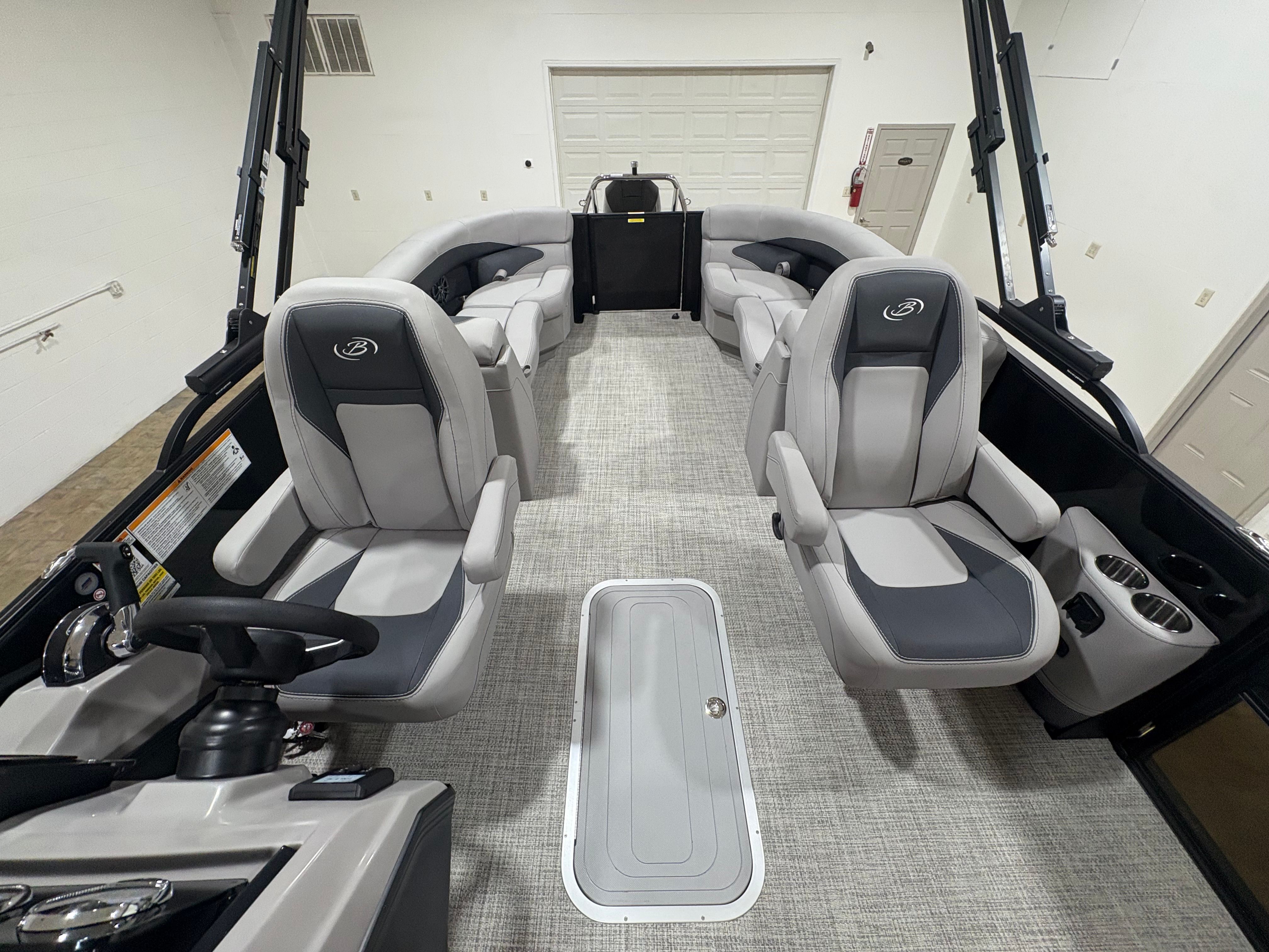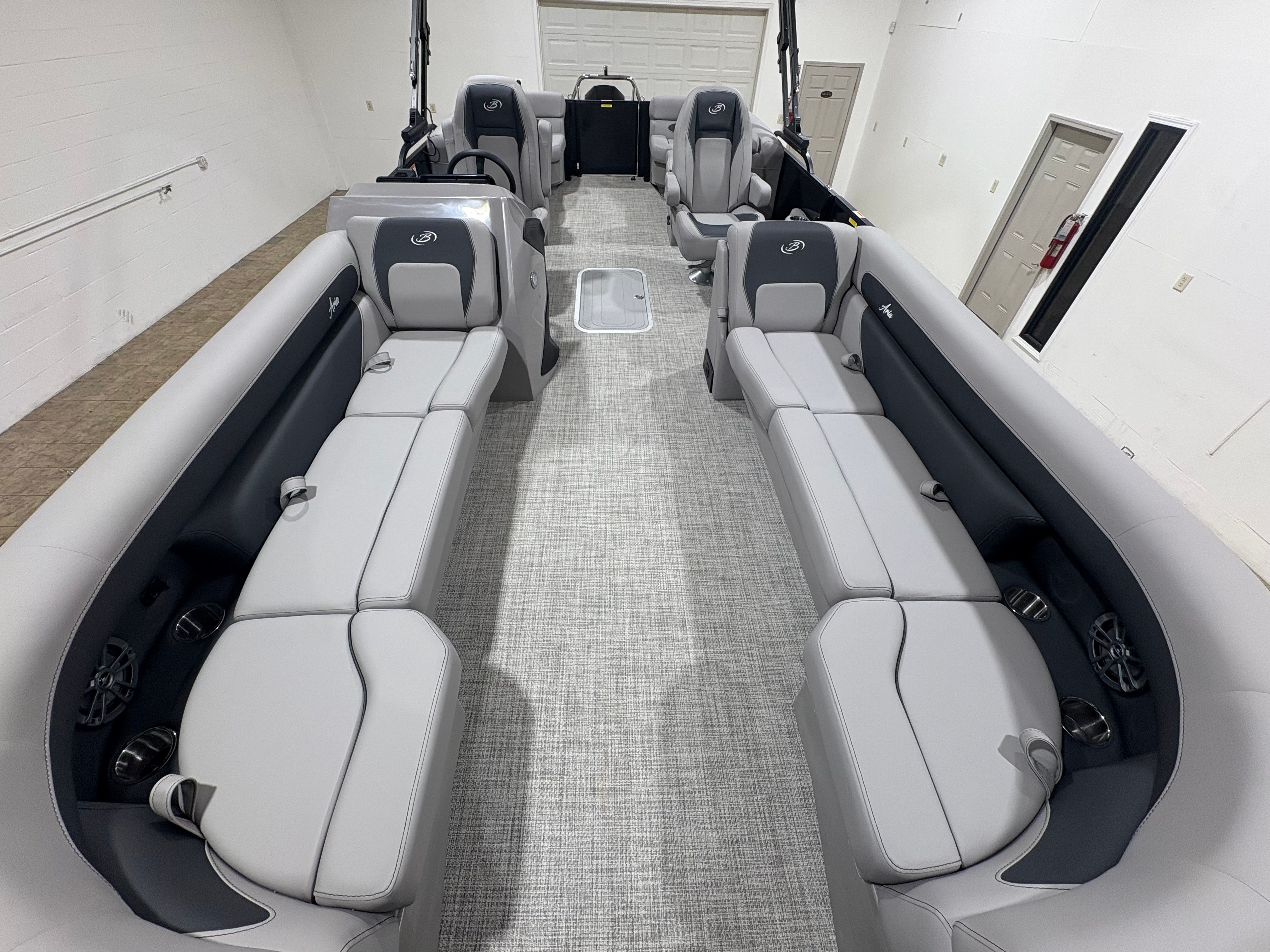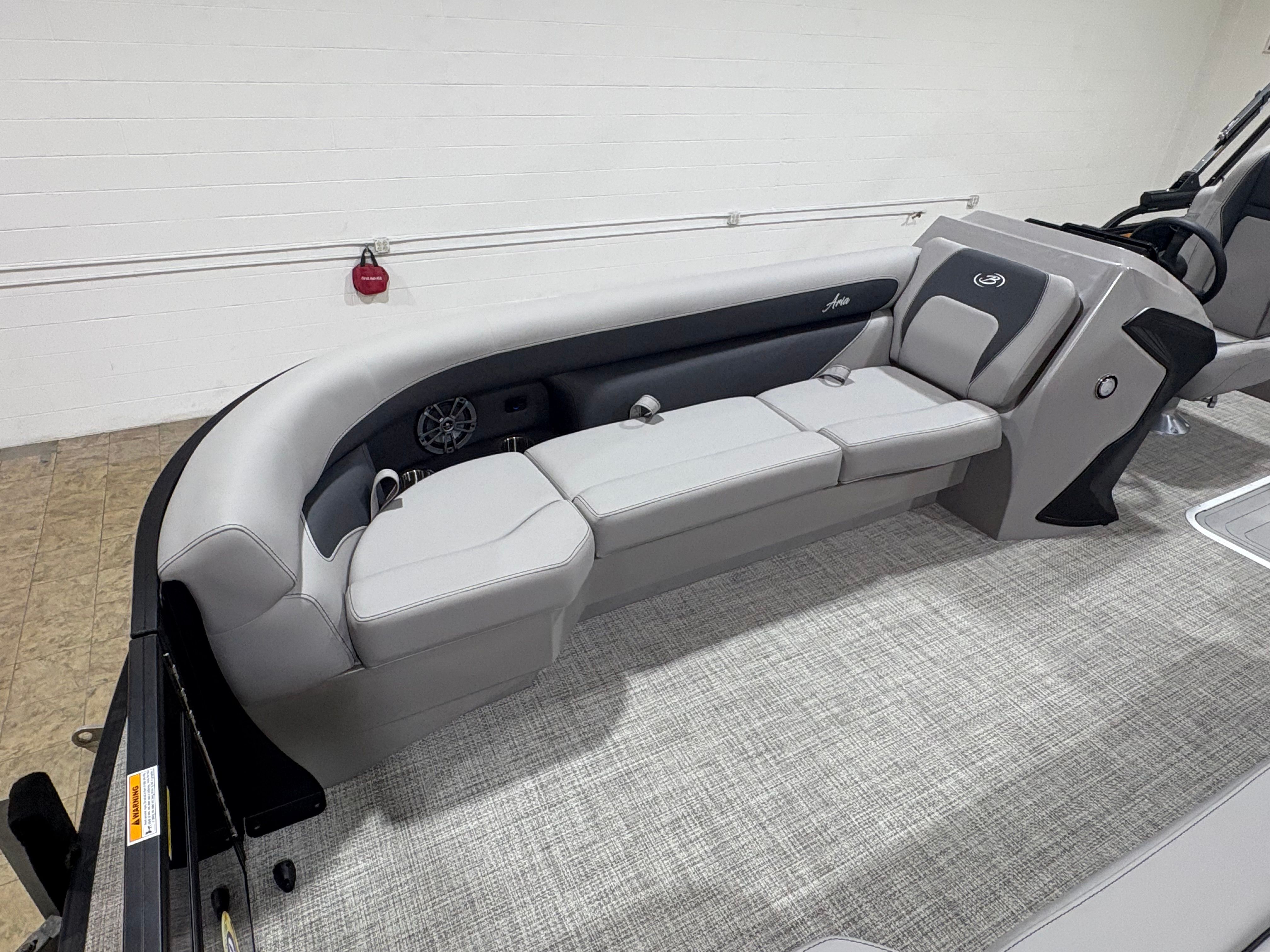 The Barletta Aria A24QC is loaded with features designed to enhance your time on the water. The Aria Blackout Package adds a bold, contemporary flair to the exterior, while the Black Diamond Railskin provides a striking visual impact. Inside, the Tempest Gray furniture offers plush seating for relaxation and socializing, complemented by the Amore Gray flooring that is both stylish and easy to maintain.For added convenience, the in-floor midship storage provides ample space for stowing gear, water toys, and personal items, keeping the deck clutter-free and organized. The clipped playpen cover with poles offers protection from the elements, ensuring your pontoon stays in pristine condition when not in use. The rigging includes a stainless steel prop for enhanced performance and longevity, while the Mercury pre-rig with power assist makes operating the boat smooth and responsive.