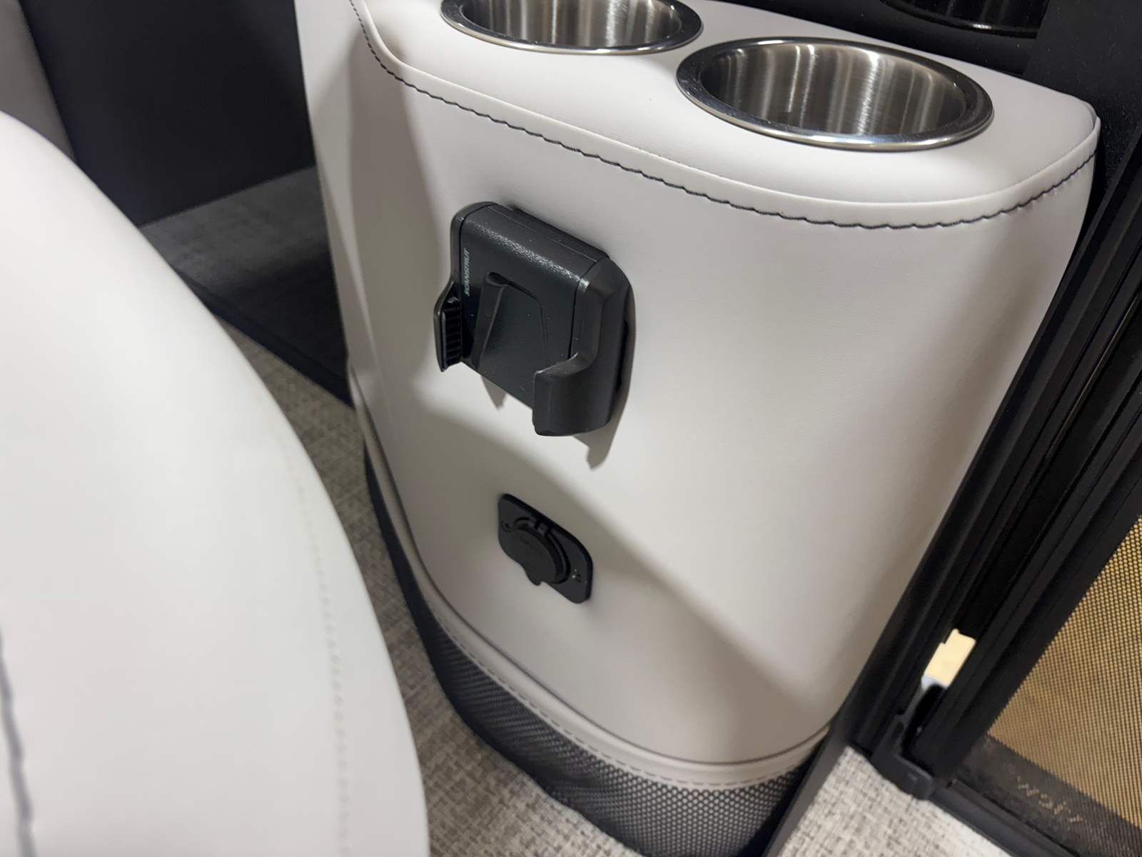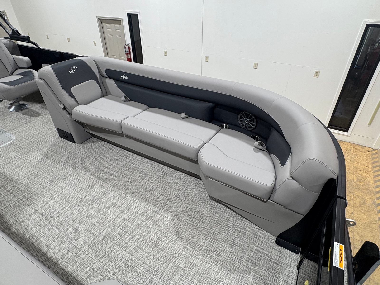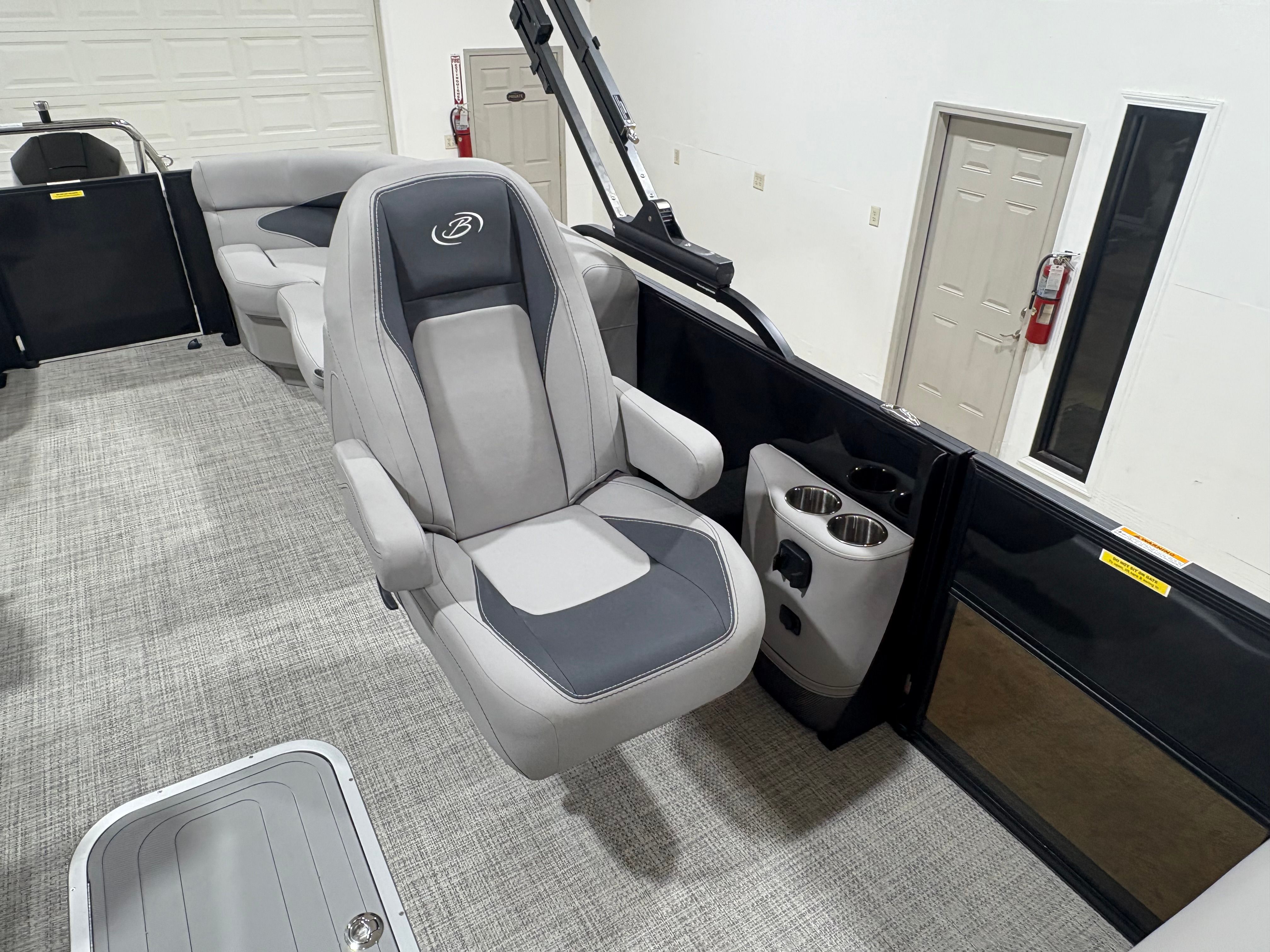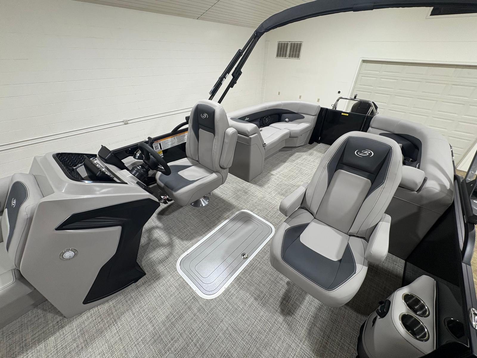 The Barletta Aria A24QC is loaded with features designed to enhance your time on the water. The Aria Blackout Package adds a bold, contemporary flair to the exterior, while the Black Diamond Railskin provides a striking visual impact. Inside, the Tempest Gray furniture offers plush seating for relaxation and socializing, complemented by the Amore Gray flooring that is both stylish and easy to maintain.For added convenience, the in-floor midship storage provides ample space for stowing gear, water toys, and personal items, keeping the deck clutter-free and organized. The clipped playpen cover with poles offers protection from the elements, ensuring your pontoon stays in pristine condition when not in use. The rigging includes a stainless steel prop for enhanced performance and longevity, while the Mercury pre-rig with power assist makes operating the boat smooth and responsive.