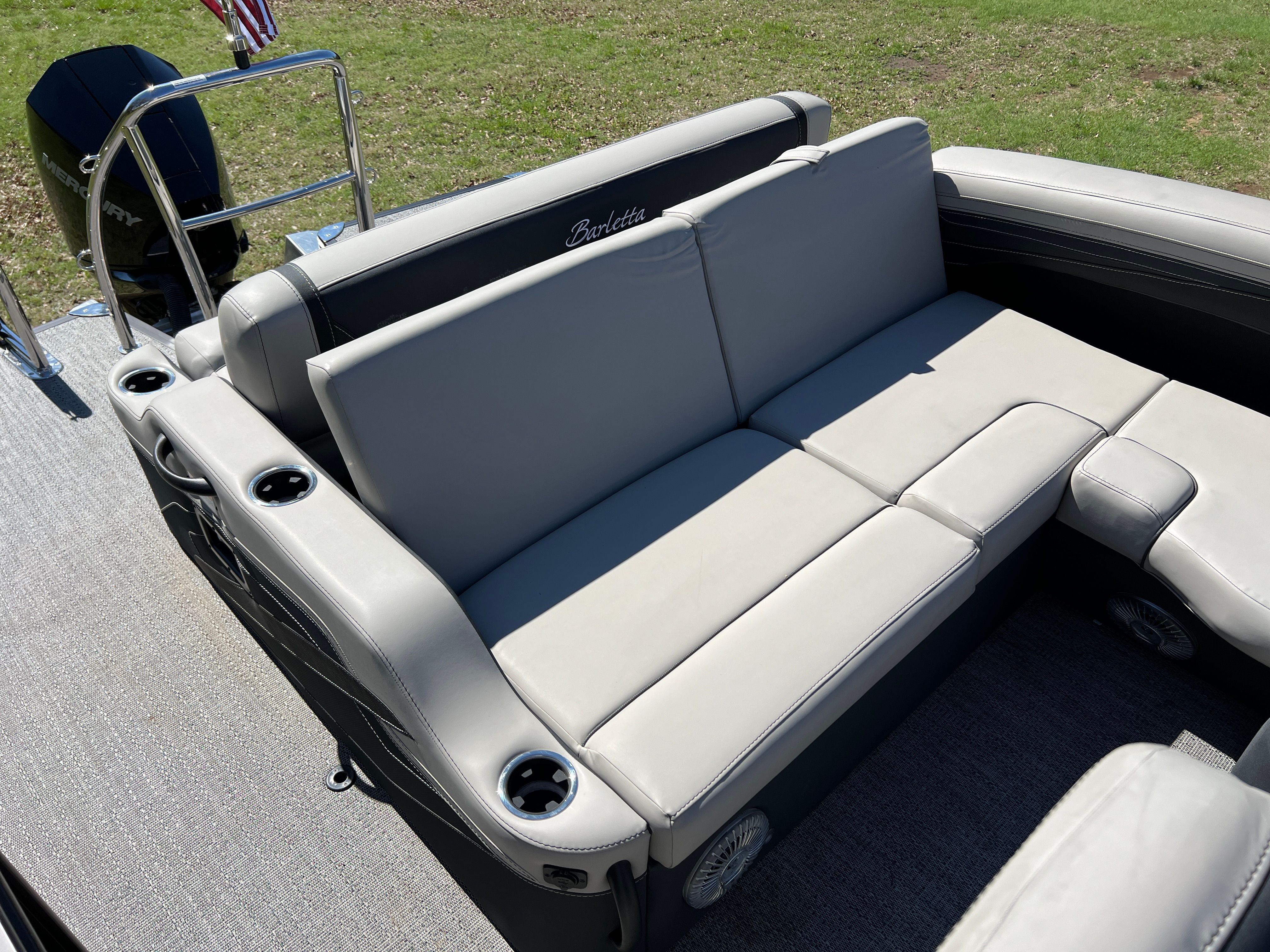 The Barletta Cabrio C22U is packed with special features that elevate its appeal and functionality. The Railskin Color in Black Diamond, complemented by the Gray Moonstone accent, gives the boat a sophisticated and contemporary look. The Blackout Package Cabrio adds a touch of exclusivity, ensuring your pontoon stands out wherever you go. Inside, the Marquesan Gray furniture with Onyx accents creates a comfortable and stylish environment, while the Amore Gray flooring is both attractive and easy to maintain.One of the standout features is the Triple Toon Package with midship storage, providing enhanced stability and extra space for gear, water toys, or personal belongings. The Sport Bimini canvas, installed in place of the standard bimini, offers superior sun protection and adds a sporty flair to the boat’s profile. Every detail, from the rigged engine with stainless steel prop to the thoughtfully designed interior, reflects Barletta’s dedication to quality and user satisfaction.