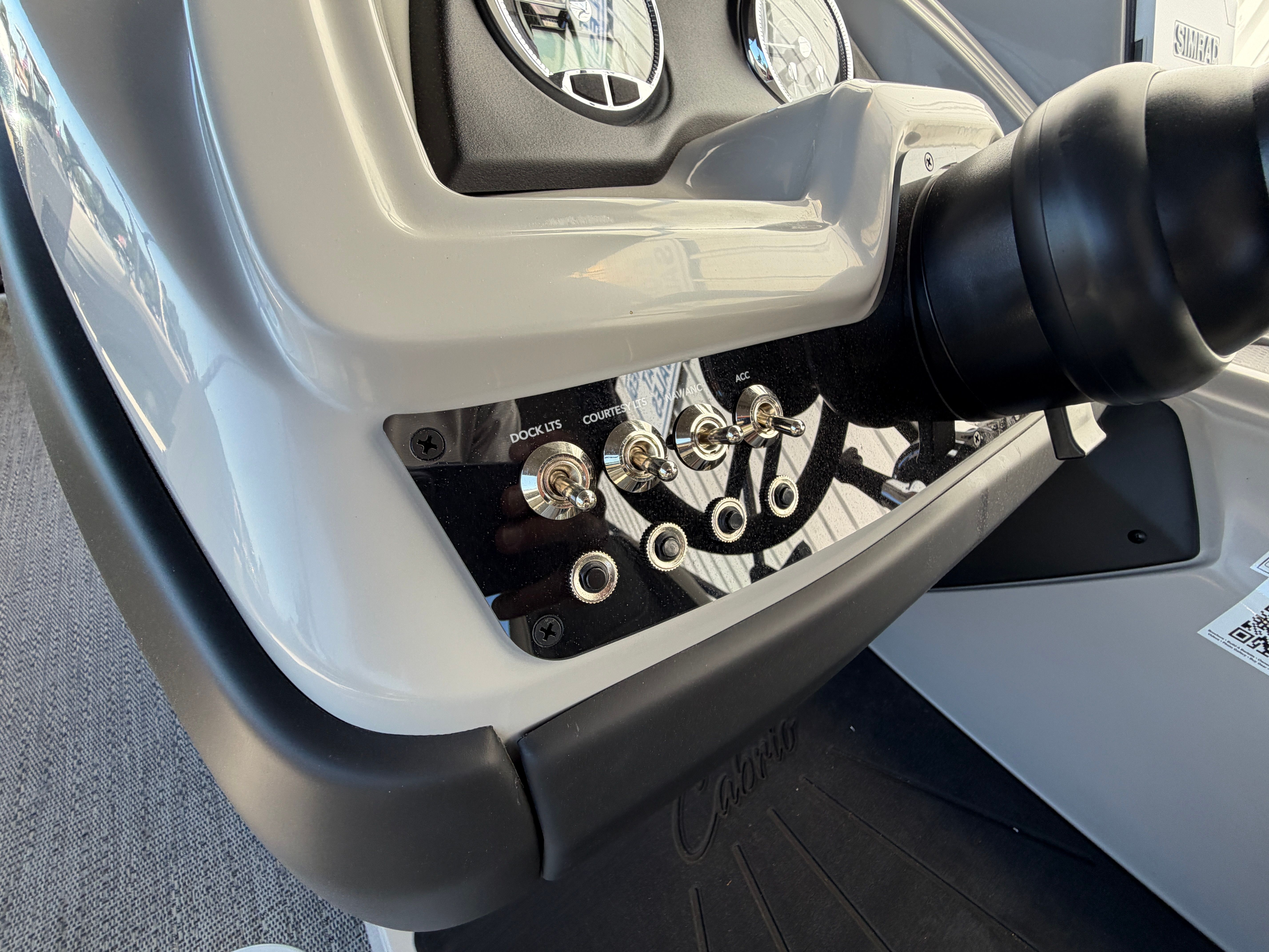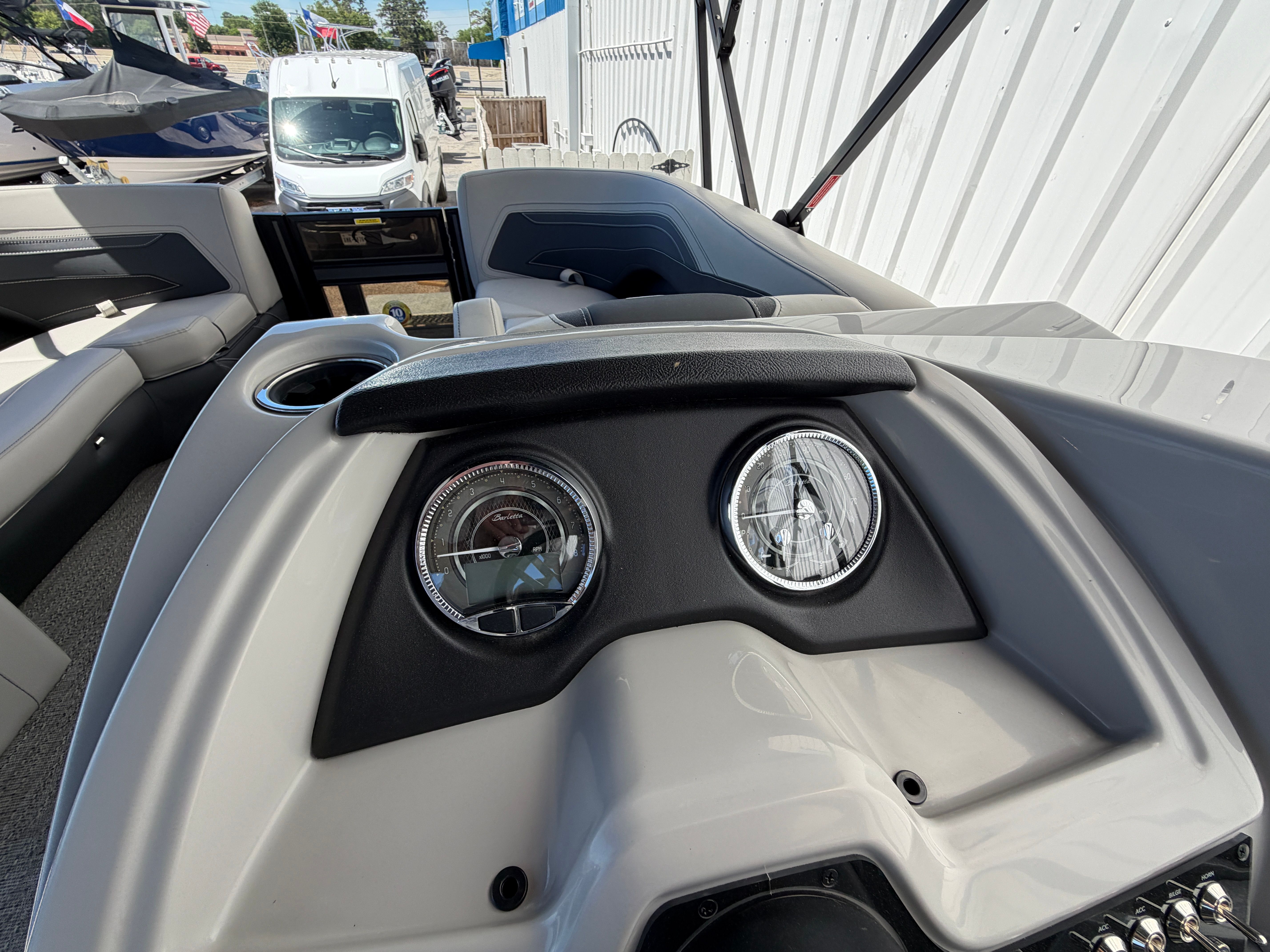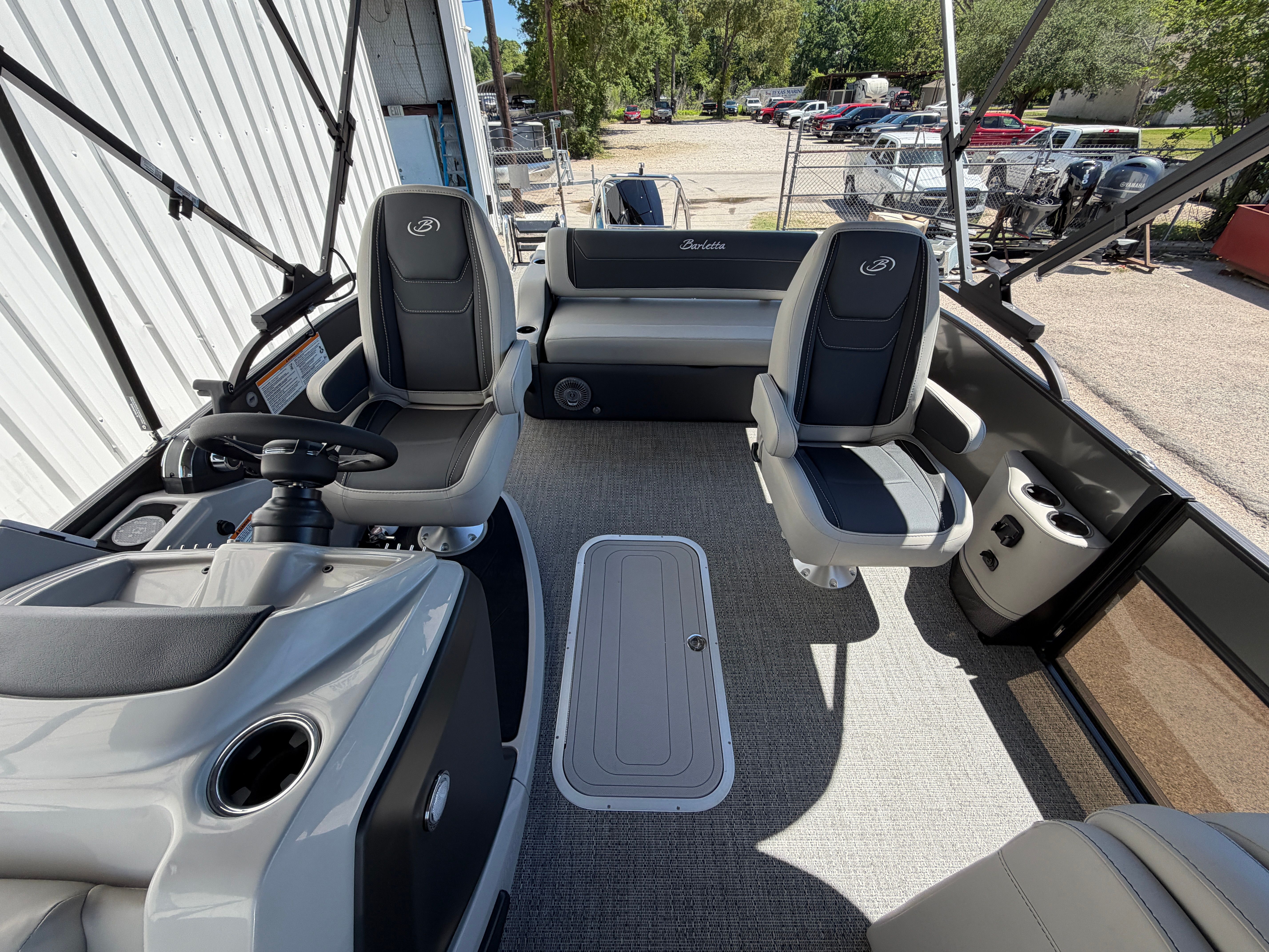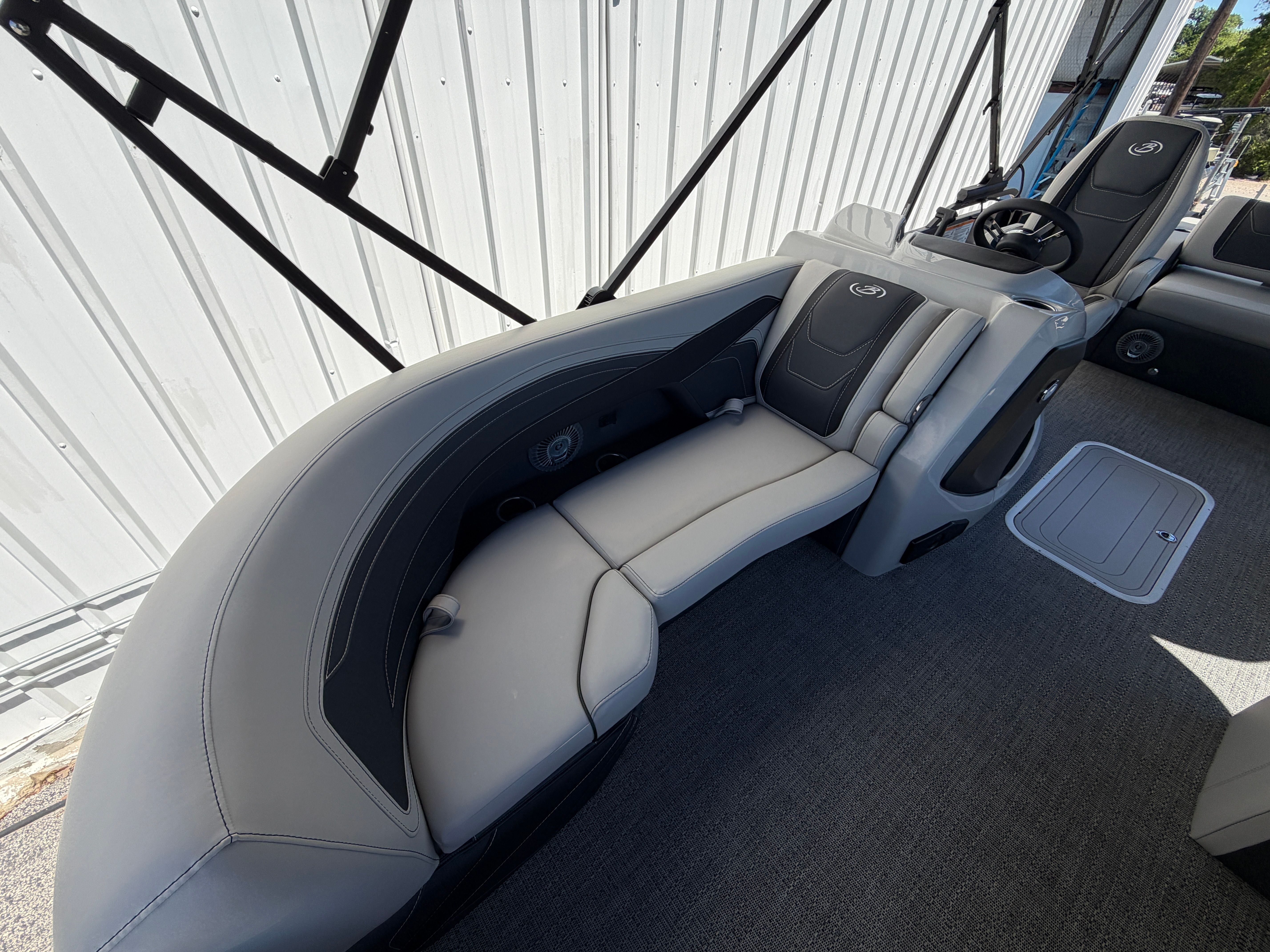 The Barletta Cabrio C22UC is loaded with special features that set it apart from other pontoon boats for sale. The Gray Moonstone Railskin color and Cabrio Blackout Package create a bold and stylish exterior, while the Marquesan Gray with Onyx furniture provides plush seating and a luxurious feel. The Amore Gray flooring is both elegant and practical, offering a comfortable surface that is easy to clean and maintain.The Cabrio Triple Toon Package with midship storage adds valuable space for your gear, making it easy to keep the deck organized and clutter-free. The Mercury (M) 200L FourStroke engine is paired with a pre-rig mechanical system and a stainless steel prop for reliable and efficient operation. Power assist steering ensures smooth and responsive control, enhancing your overall boating experience. The double bimini provides ample shade, allowing you and your guests to relax in comfort, even on the sunniest days.