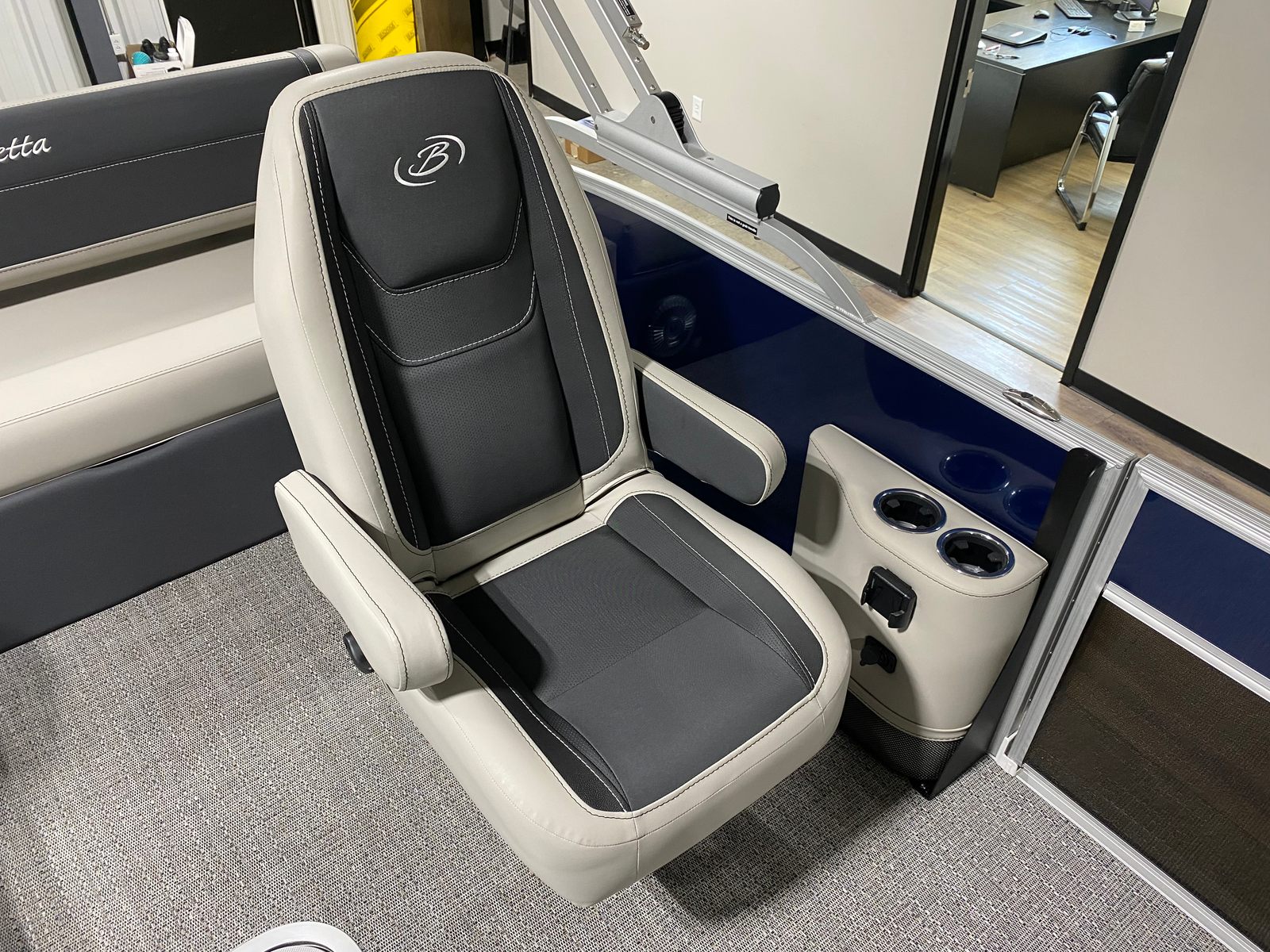 This pontoon boat is loaded with features that elevate your boating experience. The Blue Sapphire Railskin color gives the Cabrio C22UC a striking, contemporary look, while the Marquesan Gray with Onyx furniture offers plush, supportive seating for all-day comfort. The Amore Gray flooring is not only stylish but also durable and easy to maintain, making it ideal for active days on the water.The triple toon package with midship storage provides additional buoyancy and storage capacity, ensuring you have plenty of room for gear, water toys, and personal items. The stainless steel flag pole with an American flag adds a patriotic touch, perfect for holiday outings or simply showing your pride on the water. Exterior white underdeck and underwater lighting, along with the interior RGB lighting package, create a captivating ambiance for evening cruises and social gatherings, allowing you to set the mood with customizable colors and effects.