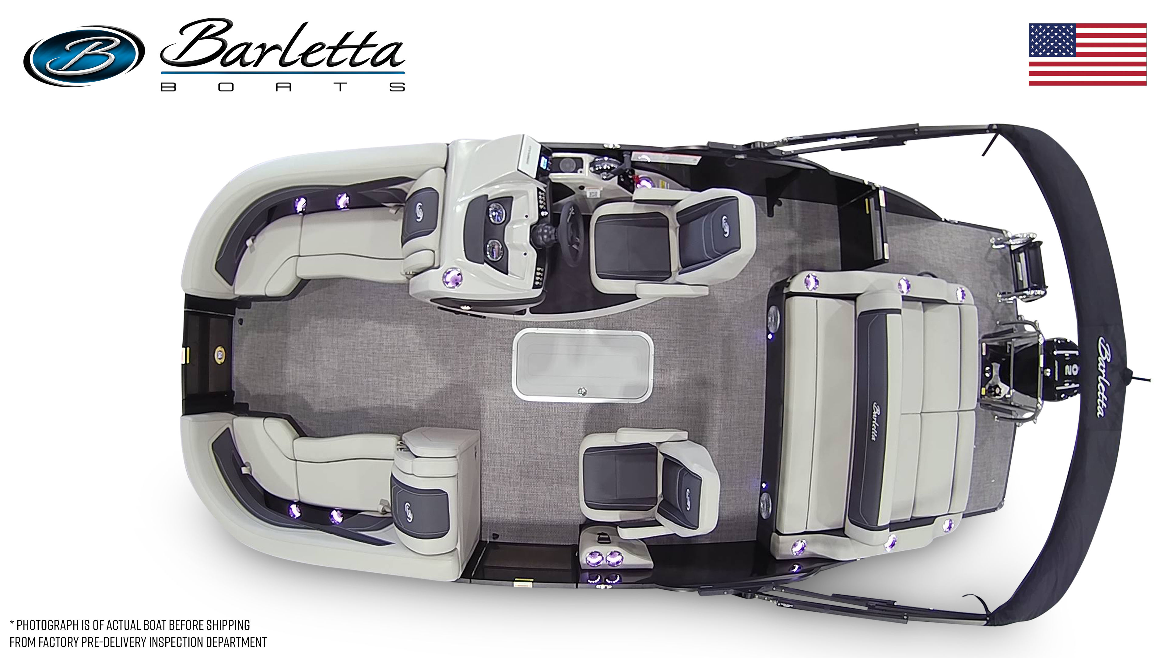 Step aboard the Barletta Cabrio C22UC and discover a world of comfort and convenience. The Marquesan Gray/Onyx furniture offers plush seating and a refined aesthetic, perfectly complemented by the Amore Gray flooring that’s both stylish and easy to maintain. The Triple Toon Package with midship storage provides enhanced stability, smoother rides, and generous space for stowing your essentials. The Blackout Package Cabrio adds a touch of elegance, while the stainless steel flag pole with an American flag showcases your pride and adds a unique finishing touch.