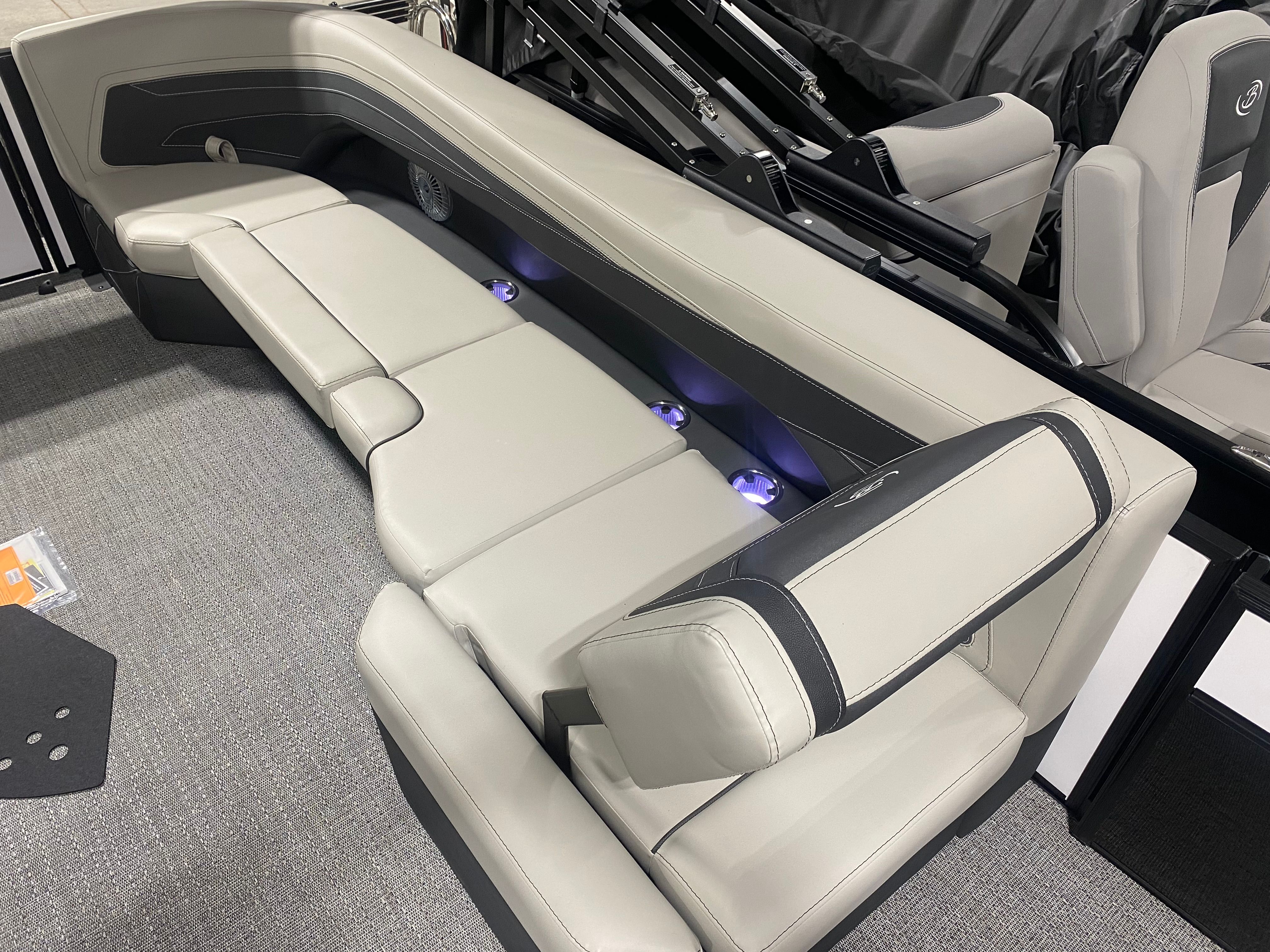 The 2026 Barletta Cabrio C24Q is a brand-new pontoon boat that measures an impressive 25.17 feet in length, offering ample space for relaxation, entertainment, and fun. As a Barletta boat for sale, this model is crafted with attention to detail and a commitment to quality, ensuring every outing is as enjoyable as it is memorable. The Cabrio C24Q’s modern design, highlighted by Marquesan Gray/Onyx furniture and Amore Gray flooring, creates a sophisticated and inviting atmosphere that is perfect for any occasion on the water.