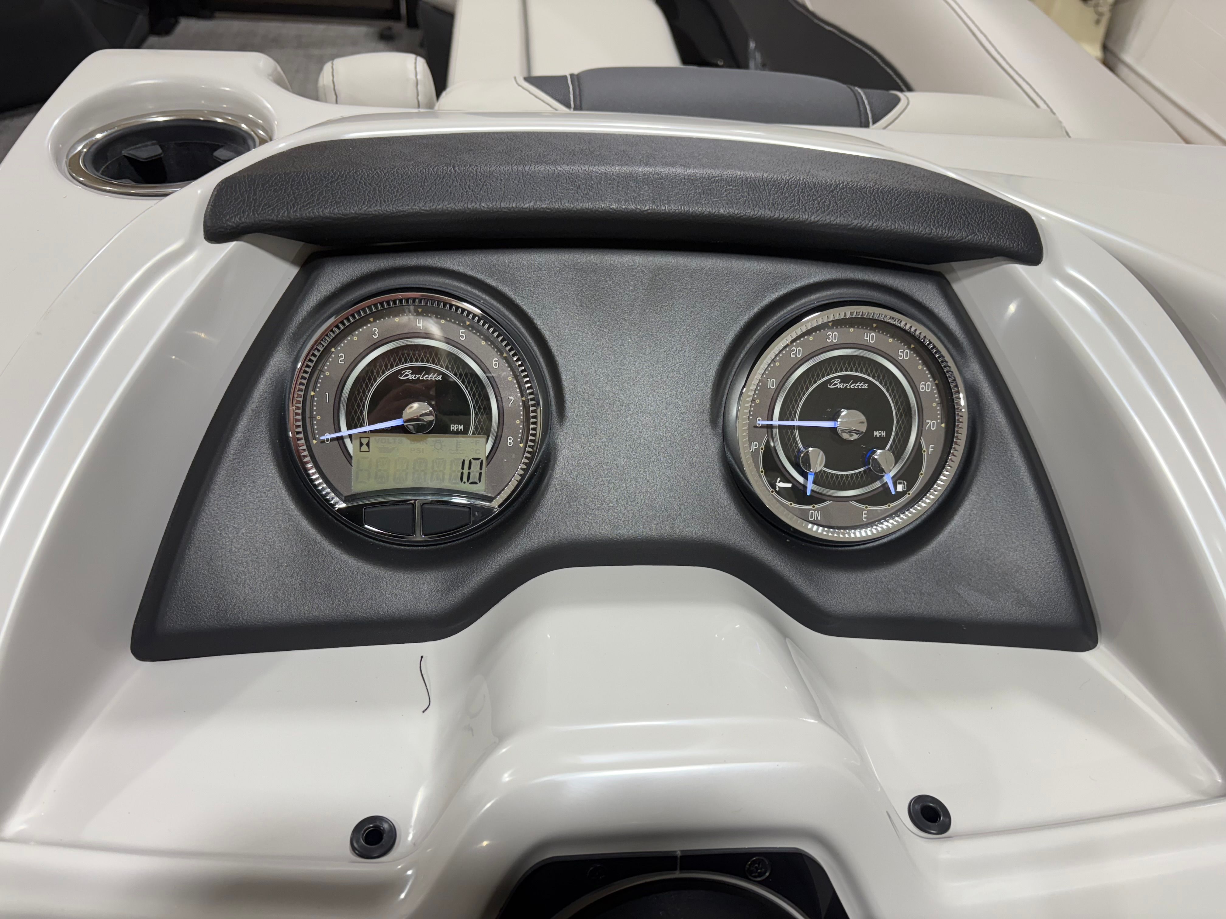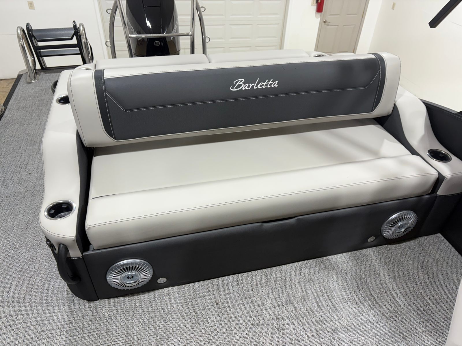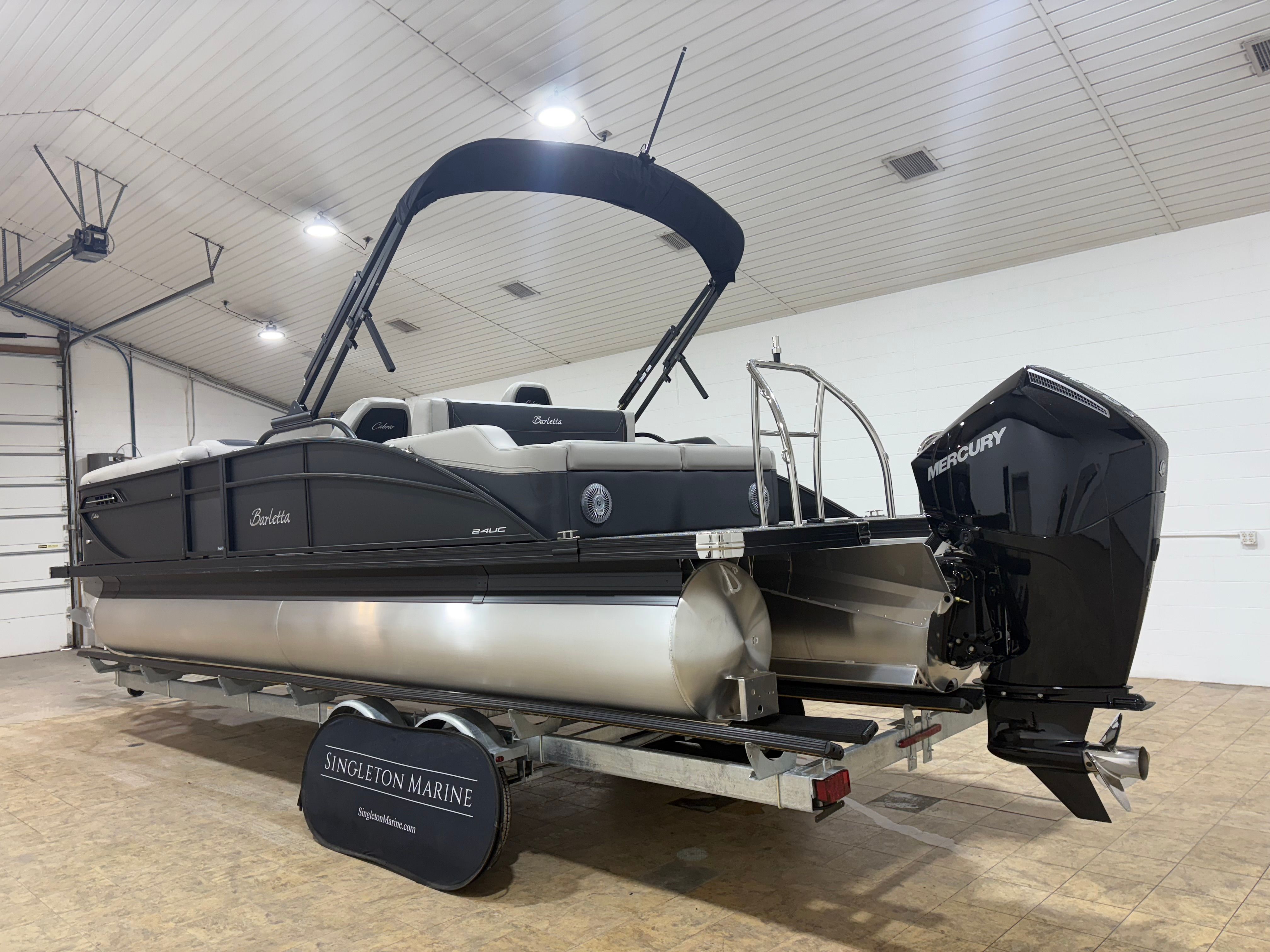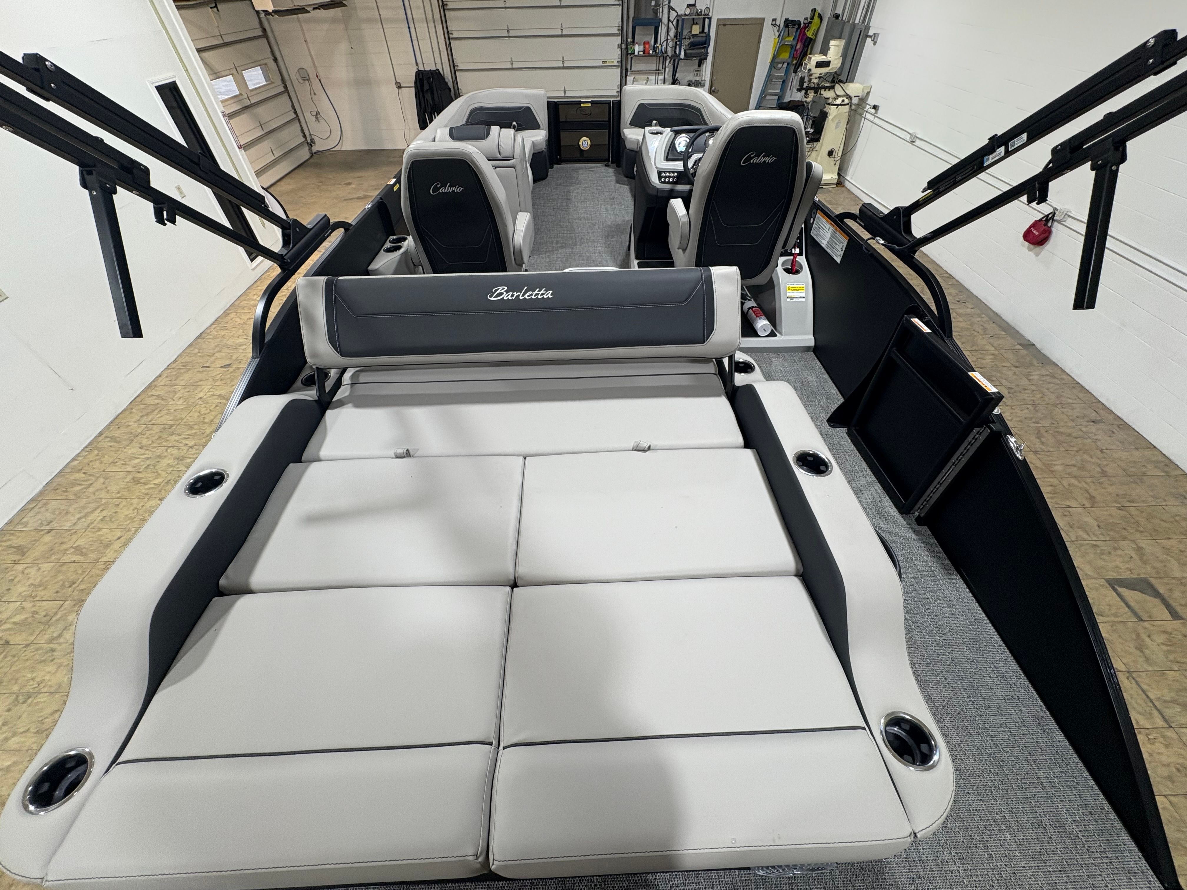 The Barletta Cabrio C24UC is packed with special features that elevate your boating experience. The Matte Black Railskin and Blackout Package Cabrio give the boat a striking, contemporary look, while the Marquesan Gray with Onyx furniture offers plush seating and superior comfort. The Amore Gray flooring is both stylish and practical, providing a non-slip surface that’s easy to clean and maintain. The Triple Toon Package with midship storage adds extra buoyancy and space for gear, ensuring you’re always prepared for a day on the water.Rigging is expertly handled with the Mercury mechanical pre-rig and power assist, complemented by a stainless steel prop for optimal performance. The exterior features a stainless steel flag pole with an American flag, adding a patriotic touch to your outings. Inside, the RGB lighting package creates a customizable ambiance, perfect for evening cruises or festive gatherings.