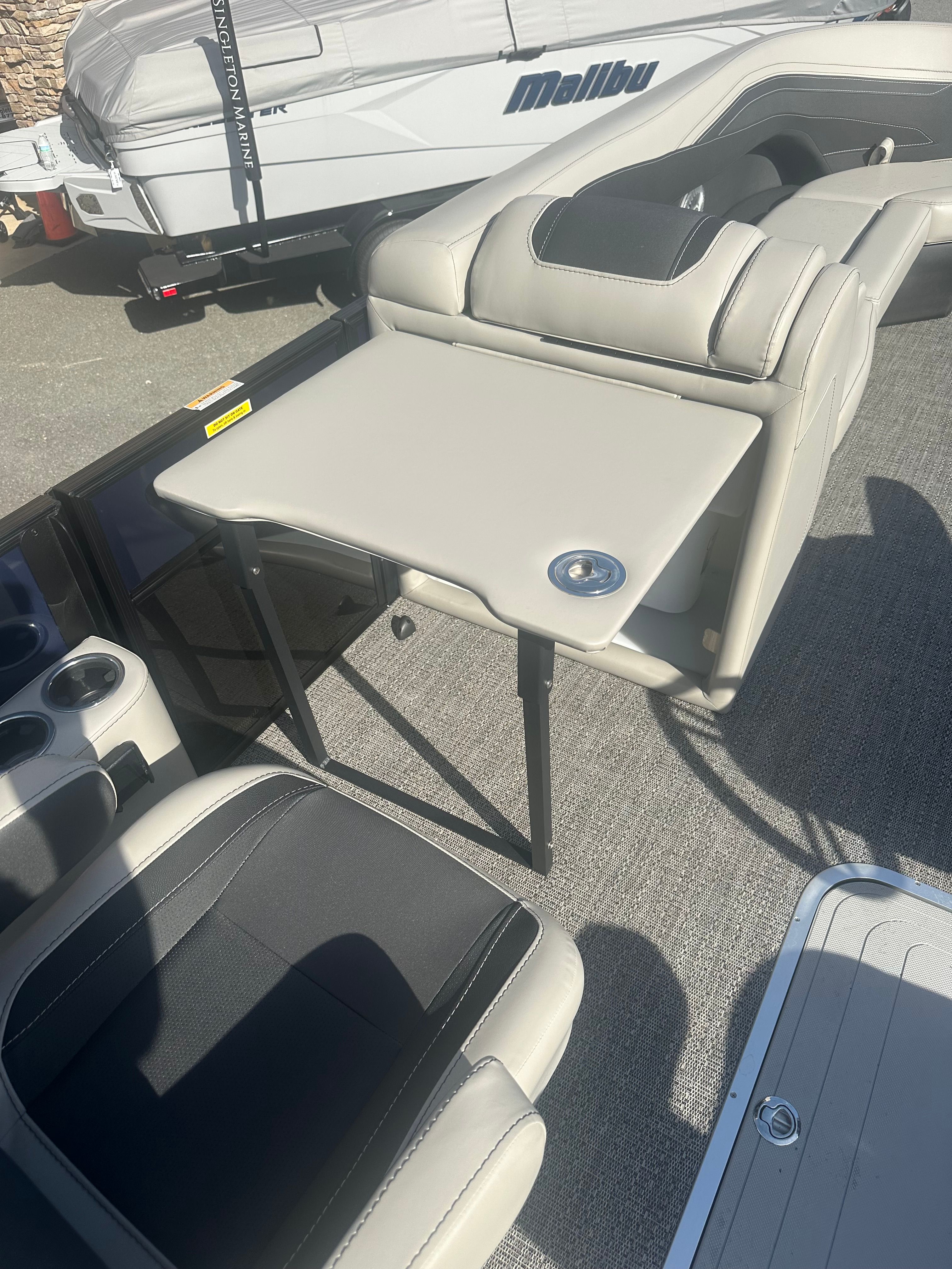 The Barletta Cabrio C24UC is loaded with features designed to enhance your boating experience. The Triple Toon Package with midship storage offers increased stability and additional space for your gear, making it ideal for longer trips or larger groups. The onboard battery charger with two batteries ensures you have reliable power for all your electronics and accessories, so you can focus on fun without worrying about running out of juice. The carefully selected railskin colors and blackout package give the boat a contemporary, stylish appearance, while the plush Marquesan Gray with Onyx furniture and Amore Gray flooring provide comfort and elegance throughout the deck. Every detail, from the rigged engine with stainless steel prop to the thoughtful storage solutions, is crafted to deliver both functionality and flair.