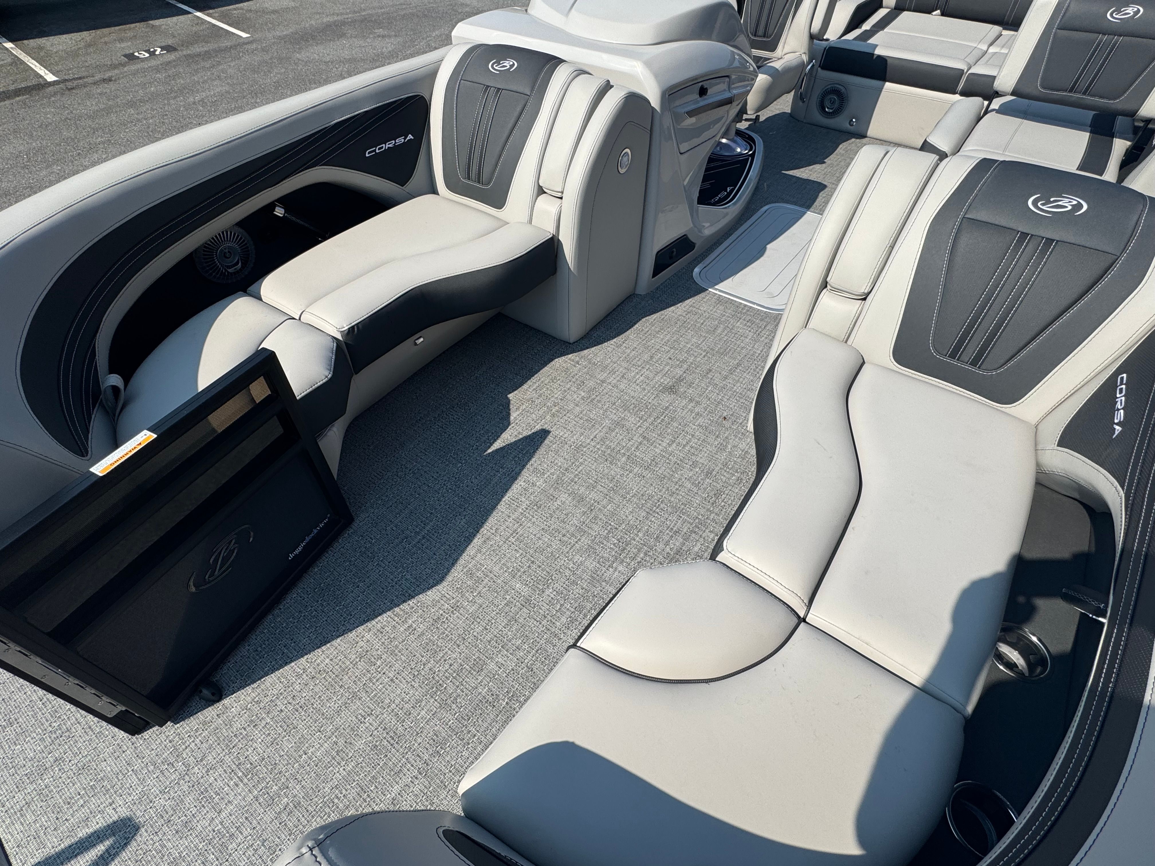The Barletta Corsa 23U excels in practicality as much as it does in style. Its spacious design offers ample room for gear, coolers, and water toys, making it easy to prepare for any outing. The hydraulic and power assist steering simplify docking and maneuvering, even for novice boaters, while the efficient Mercury 250L Verado V8 engine helps maximize fuel economy without sacrificing performance.The durable flooring and high-quality furniture are built to withstand the rigors of active use, ensuring your investment remains in top condition season after season. The advanced helm features, including Simrad engine integration and digital gauges, provide intuitive control and monitoring, so you can focus on enjoying your time on the water. Exterior lighting enhances safety and visibility, making evening returns to the dock stress-free and enjoyable.