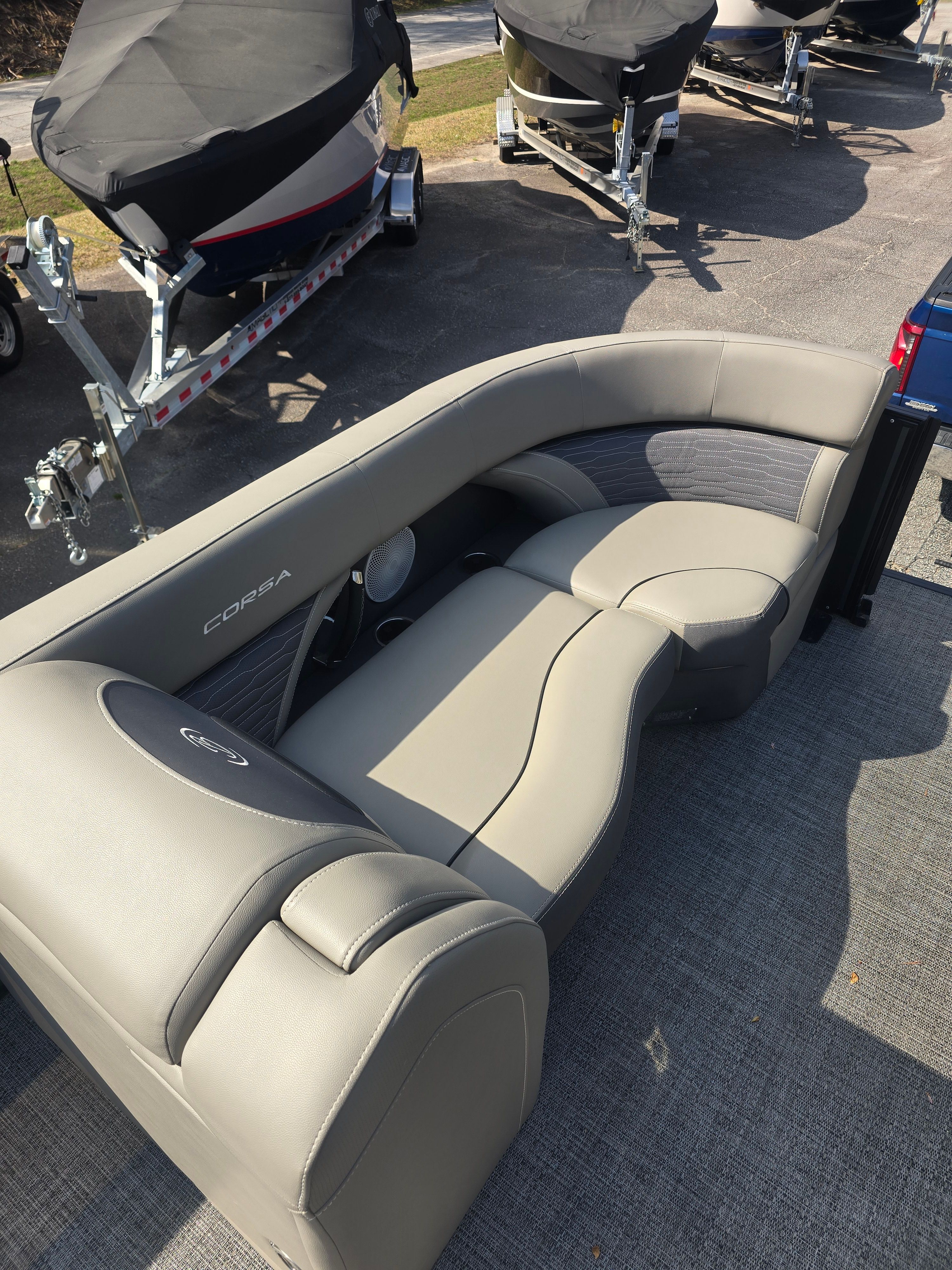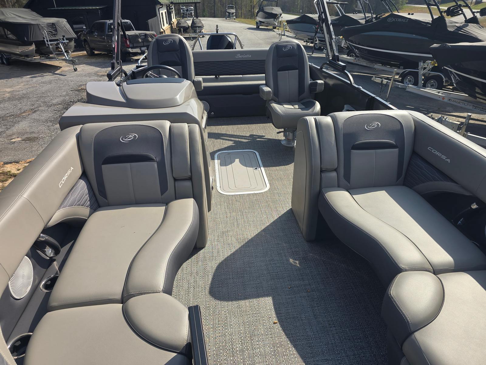 The 2024 Barletta Corsa 23UC pontoon boat is packed with features that enhance comfort, convenience, and enjoyment on the water. Its 25-foot length provides ample space for guests to relax, socialize, and soak up the sun. The thoughtfully designed seating arrangements ensure everyone has a comfortable spot, whether you’re hosting a lively gathering or enjoying a peaceful day with loved ones.Special features on the Barletta Corsa 23UC include a modern helm station with intuitive controls, premium upholstery, and a versatile layout that adapts to your needs. The pontoon’s innovative design maximizes usable space, allowing for easy movement throughout the deck. The Corsa 23UC’s attention to detail is evident in every aspect, from the stylish exterior to the high-quality finishes inside.