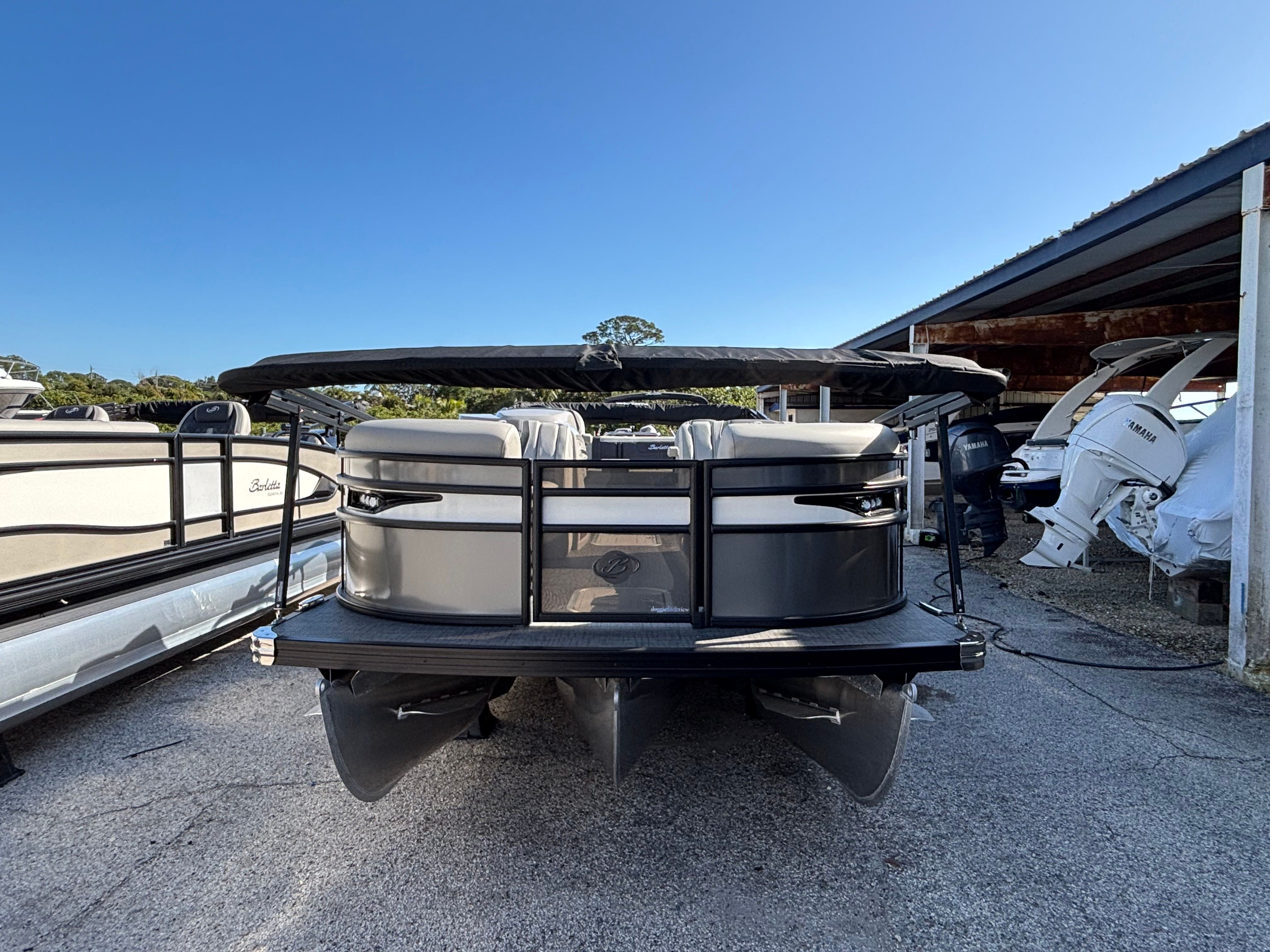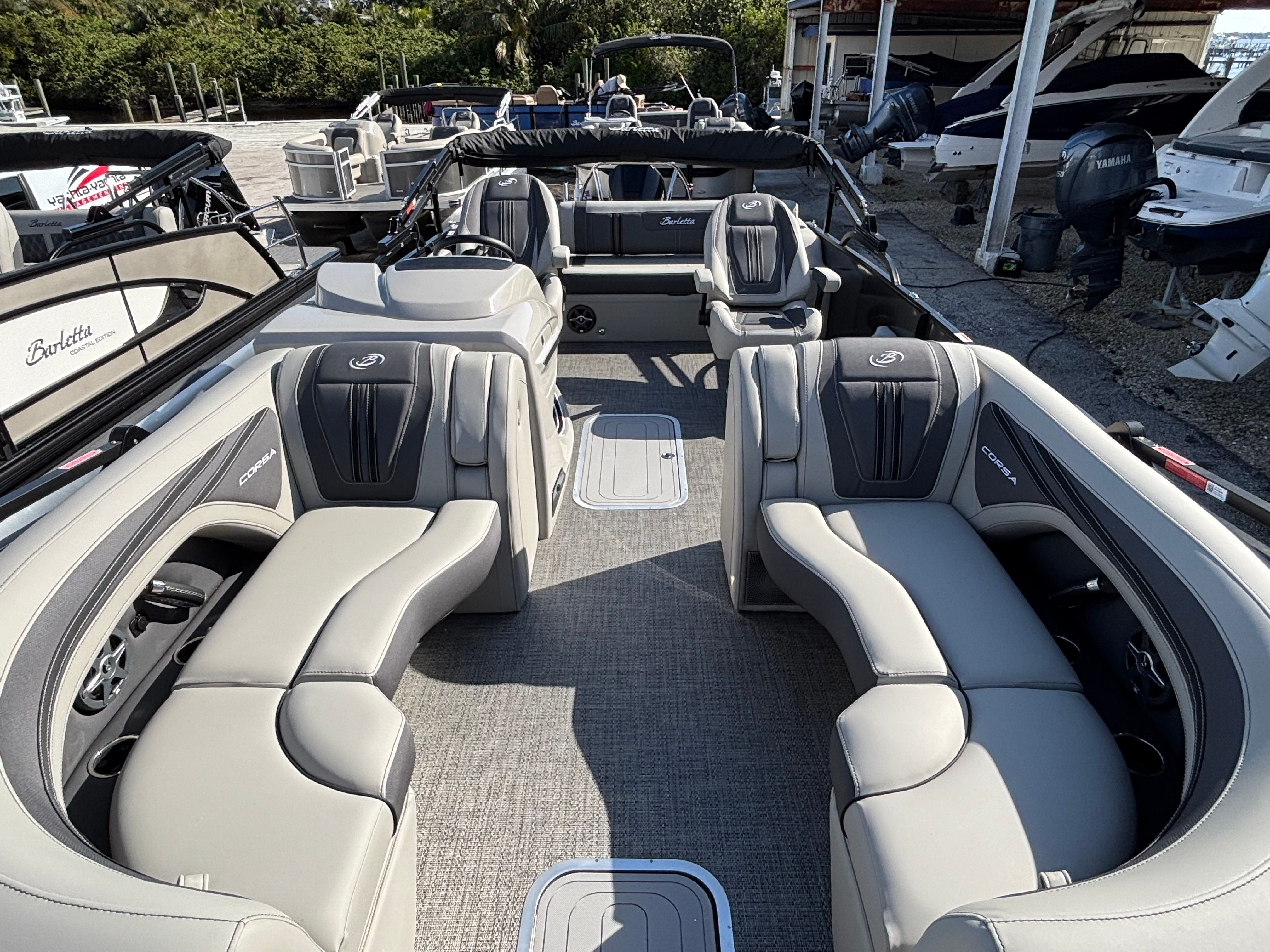 Step aboard the 2025 Barletta Corsa 23UC and discover a world of luxury and innovation. The interior is adorned with Soft Touch Marquesan Gray furniture accented by Carbon highlights, creating a sophisticated and inviting atmosphere. The Railskin Color in Gray Moonstone, complemented by a White Opal accent, gives the exterior a modern and elegant look, while the Amore Gray flooring adds a touch of refinement underfoot.The captain’s chair features an adjustable pedestal, ensuring optimal comfort and visibility for the driver. For those who appreciate high-quality sound, the addition of a subwoofer and amplifier transforms the pontoon into a floating entertainment hub, perfect for parties or relaxing with your favorite tunes. Exterior lighting, including white underdeck and underwater lights, enhances the boat’s ambiance and visibility during evening cruises.A double bimini provides generous shade, allowing you and your guests to stay cool and comfortable even on the sunniest days. Practical features such as anchor storage at the bow gate make anchoring simple and efficient, while the Blackout Package Corsa railskin package adds a bold, contemporary flair to the boat’s profile.