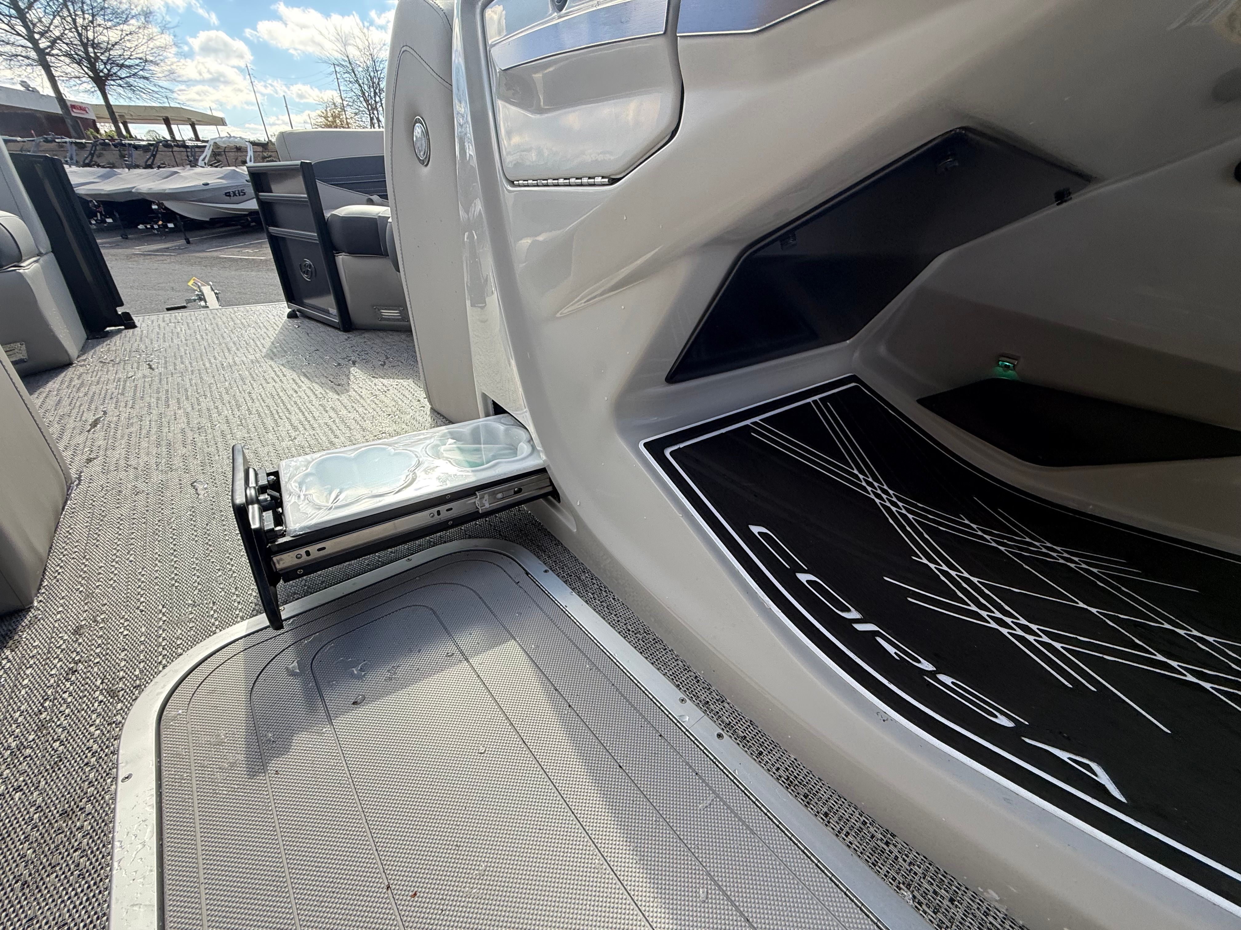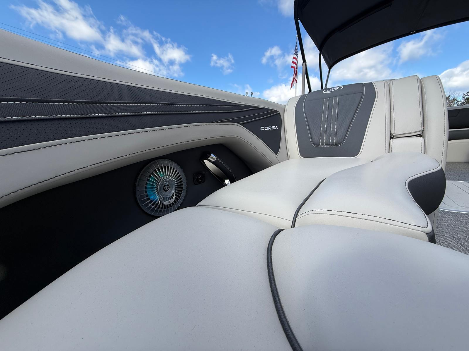 Powering the Corsa 23UC is a robust Mercury 250L Verado V8 engine, delivering an impressive 250 horsepower. This single-engine setup ensures smooth acceleration, reliable cruising speeds, and plenty of power for water sports or spirited rides across the lake. The Mercury Digital DTS Pre-Rig for VERADO engines with Vessel Link offers seamless digital control, enhancing responsiveness and efficiency. Hydraulic and power assist steering make handling effortless, whether you’re navigating tight marinas or wide-open waters. With digital gauges and Corsa Simrad engine integration, you’ll have real-time performance data at your fingertips, allowing you to optimize your boating experience with confidence.