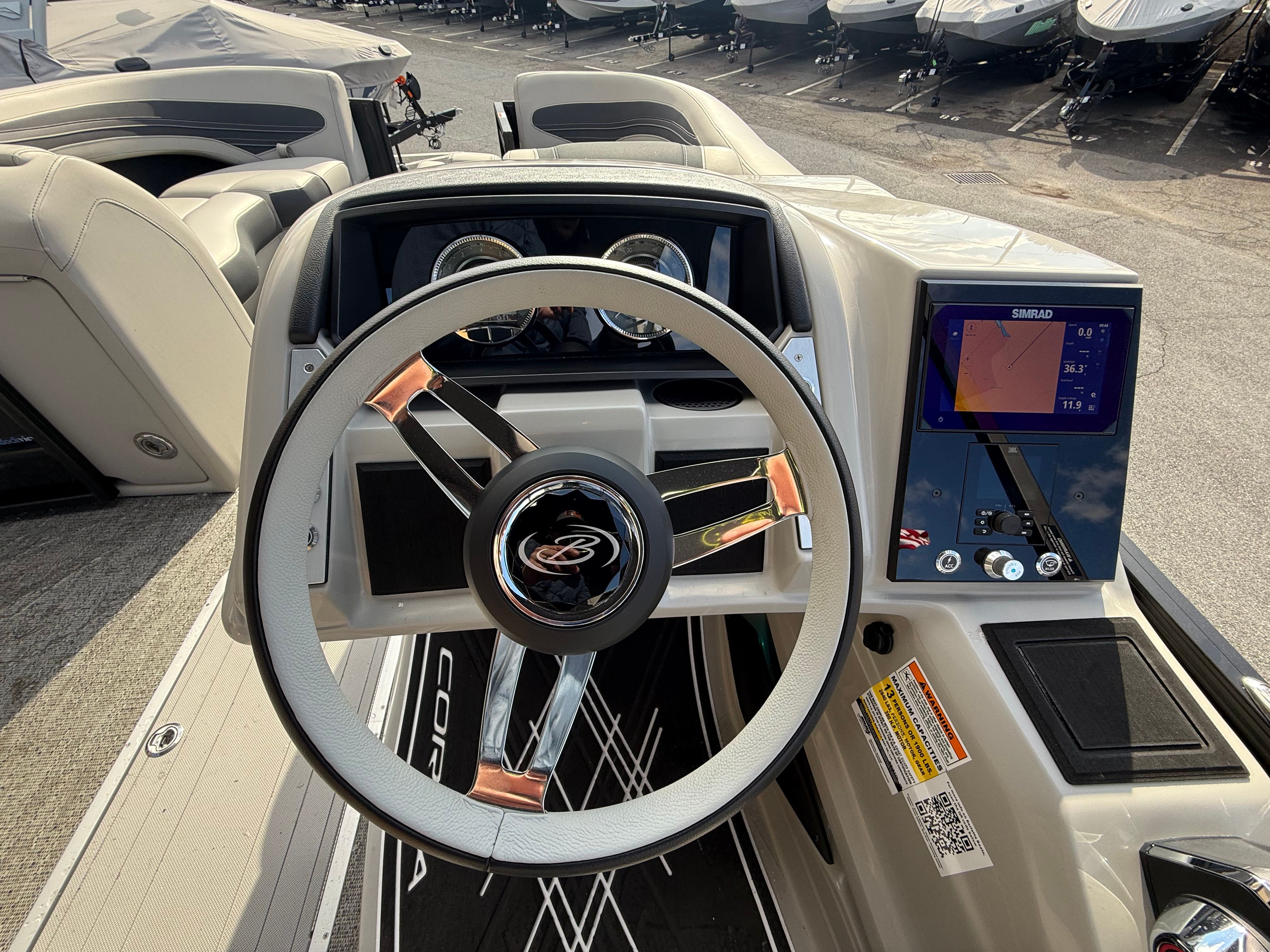 The Barletta Corsa 23UC is loaded with special features that elevate your time on the water. The Black Diamond railskin, complemented by a Matte Black accent and the Blackout Package Corsa, gives this pontoon a bold, modern look. Inside, the Soft Touch Marquesan Gray furniture with Carbon Accent offers plush seating and a sophisticated ambiance, while the Amore Gray flooring provides durability and style underfoot. The Mercury Digital DTS Pre-Rig ensures compatibility with VERADO engines, making engine management intuitive and efficient. Hydraulic and power assist steering, digital gauges, and rigging with a stainless steel prop further enhance performance and reliability. The exterior features a stainless steel flag pole with an American flag, adding a touch of patriotism and elegance. At the helm, the Corsa Simrad engine integration with digital motor control puts advanced navigation and monitoring tools at your command.