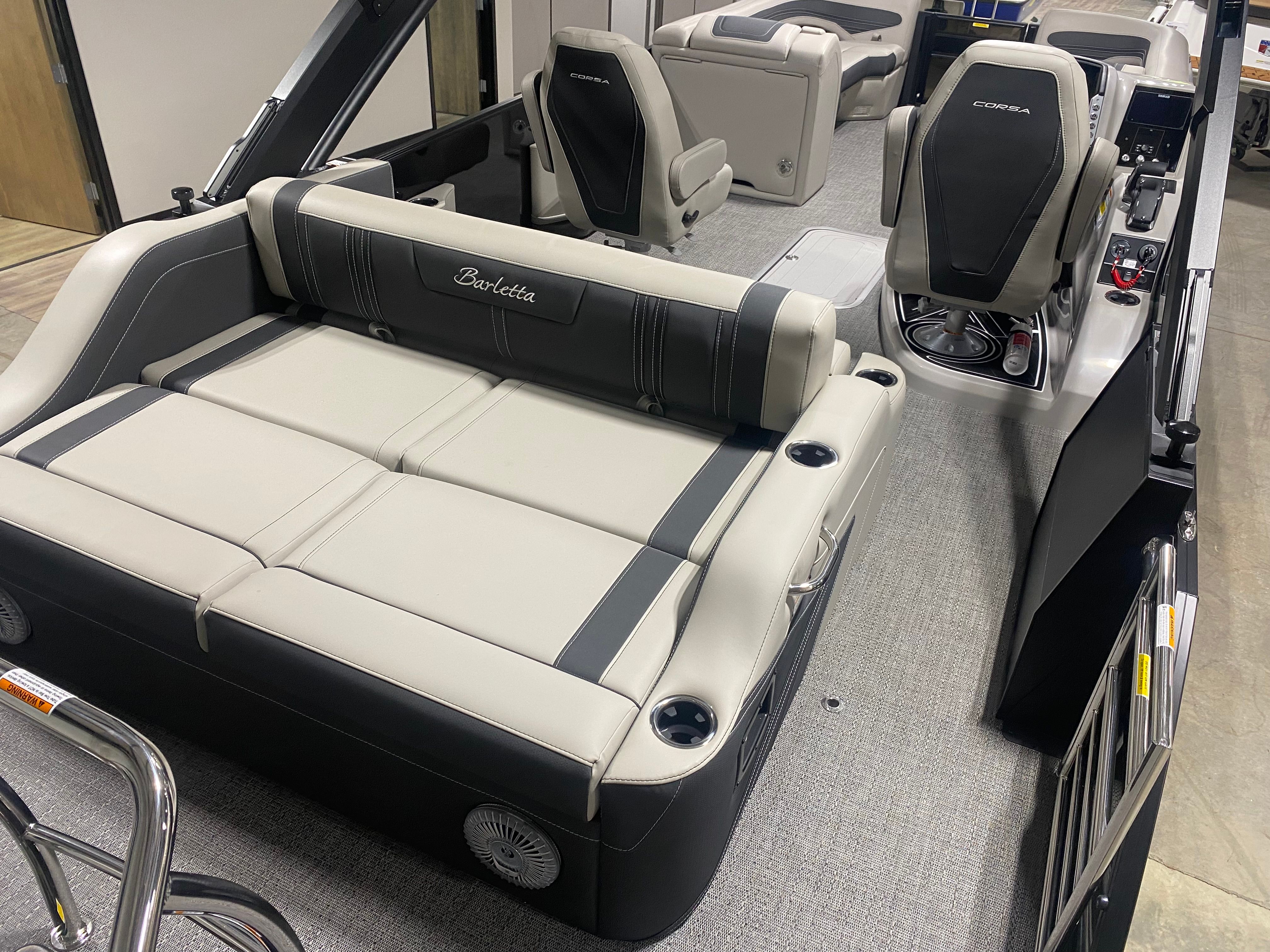 The Barletta Corsa 25UCA is a 27-foot pontoon boat crafted for those who appreciate quality and sophistication. As a new model for 2026, it showcases Barletta’s commitment to innovation and comfort. The Blackout Package Corsa gives the exterior a bold, contemporary look, while the Soft Touch Marquesan Gray furniture with Carbon Accent and Amore Gray flooring create a refined, inviting atmosphere onboard. Whether you’re cruising with family or entertaining friends, this Barletta boat for sale offers a spacious and stylish setting for every occasion.