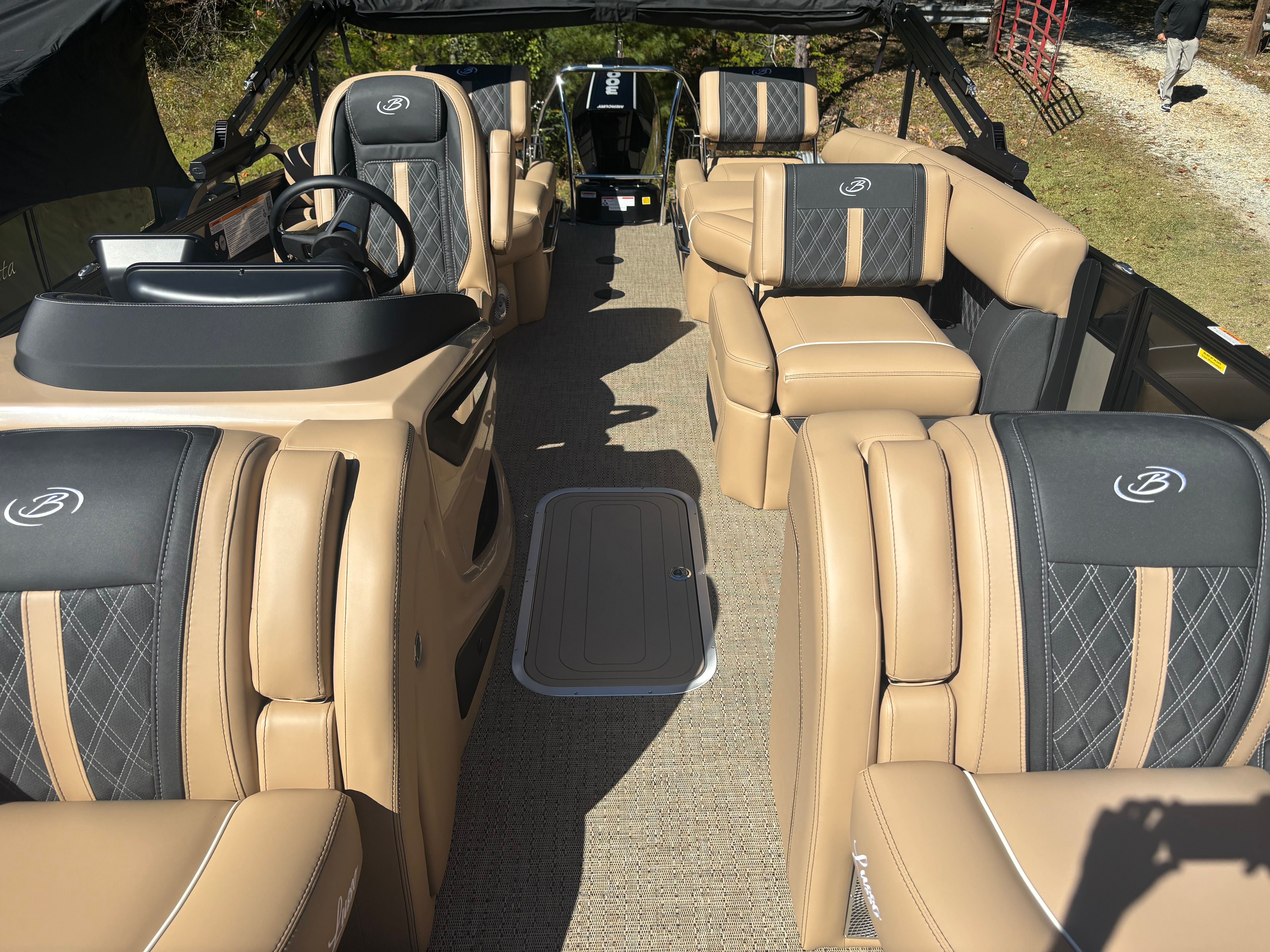 Step aboard and discover a world of luxury and convenience. The Lusso L23M features a striking Champagne accent color and Amore Tan flooring, creating a warm and inviting environment. The Carmella Tan furniture with Onyx accents adds a touch of elegance, while the Blackout Package Lusso railskin and Black Diamond sweep color give the exterior a bold, modern look. Exterior lighting, including white underdeck and underwater illumination, enhances both safety and ambiance during evening cruises. The 2-bank battery charger ensures your electrical systems are always ready, and the digital gauges keep you informed at a glance. Every detail has been thoughtfully designed to enhance your boating experience.