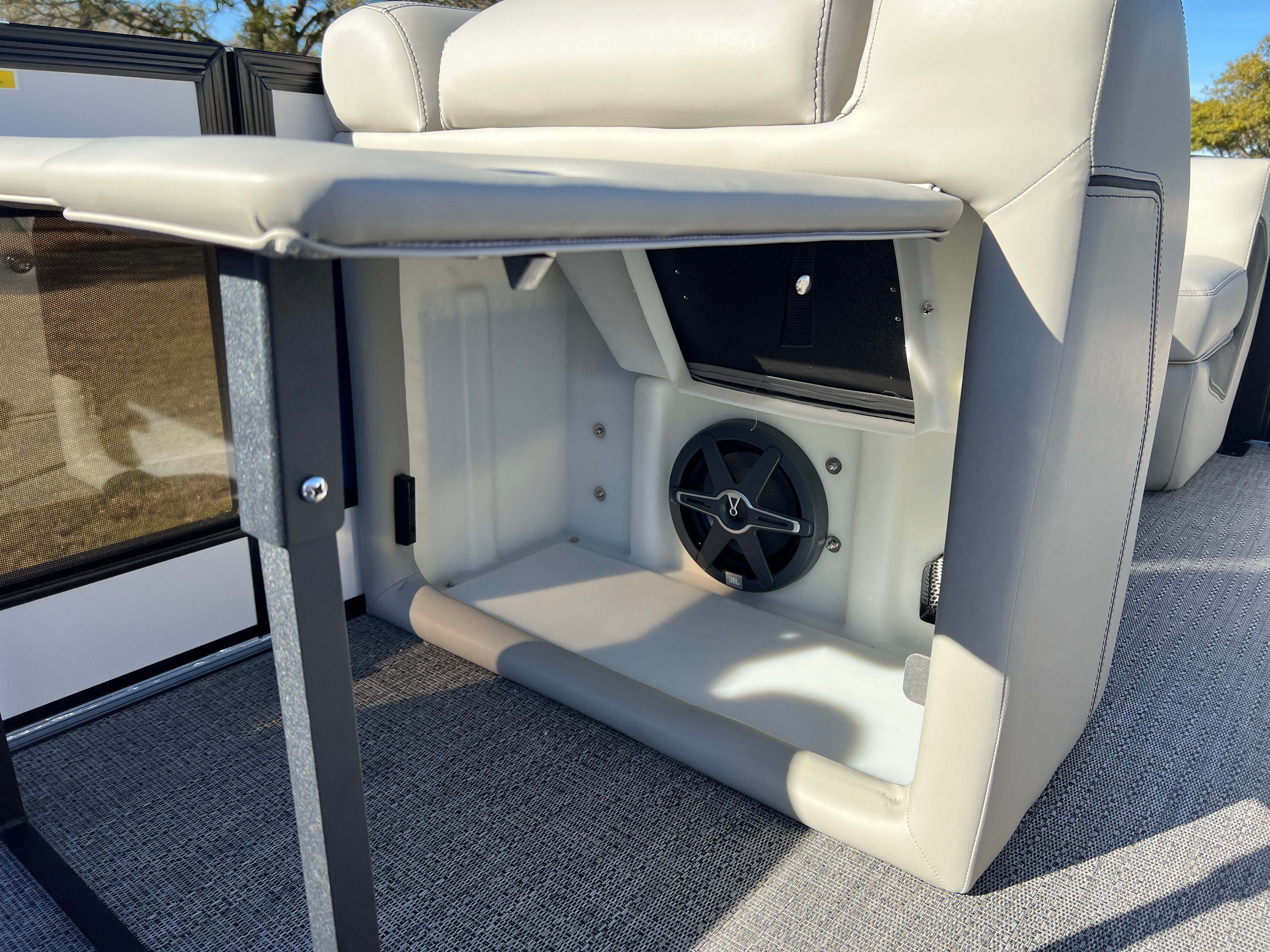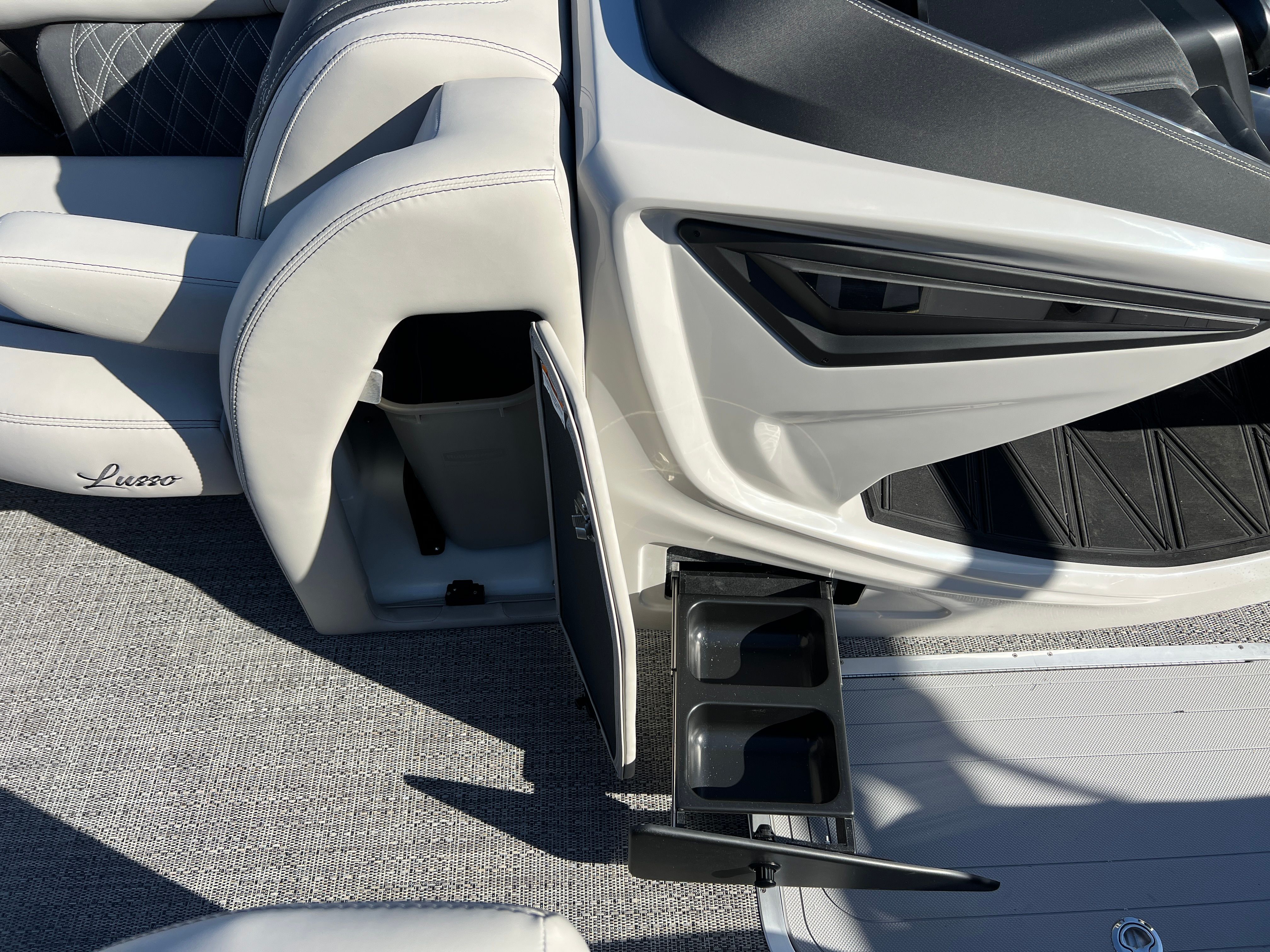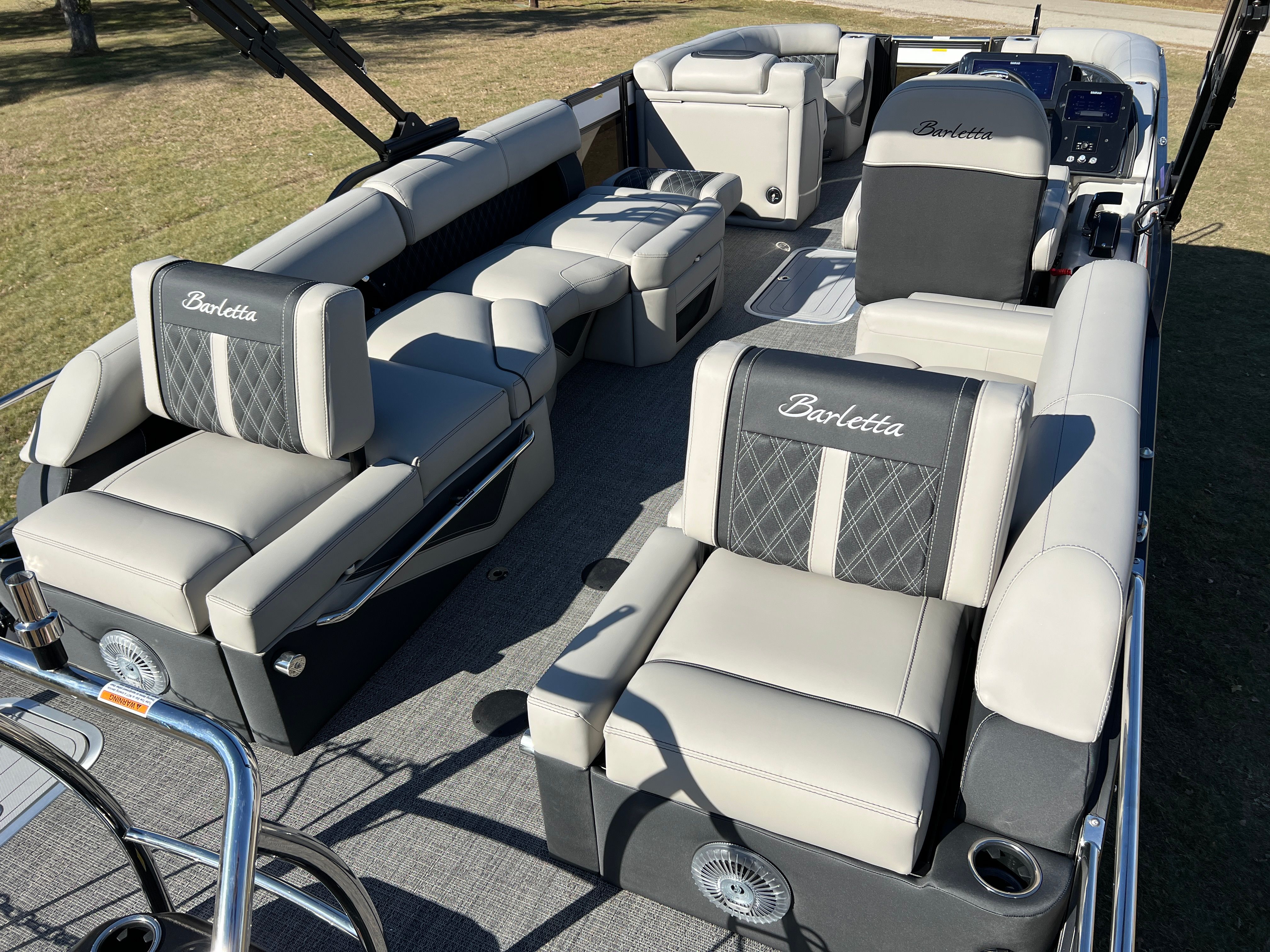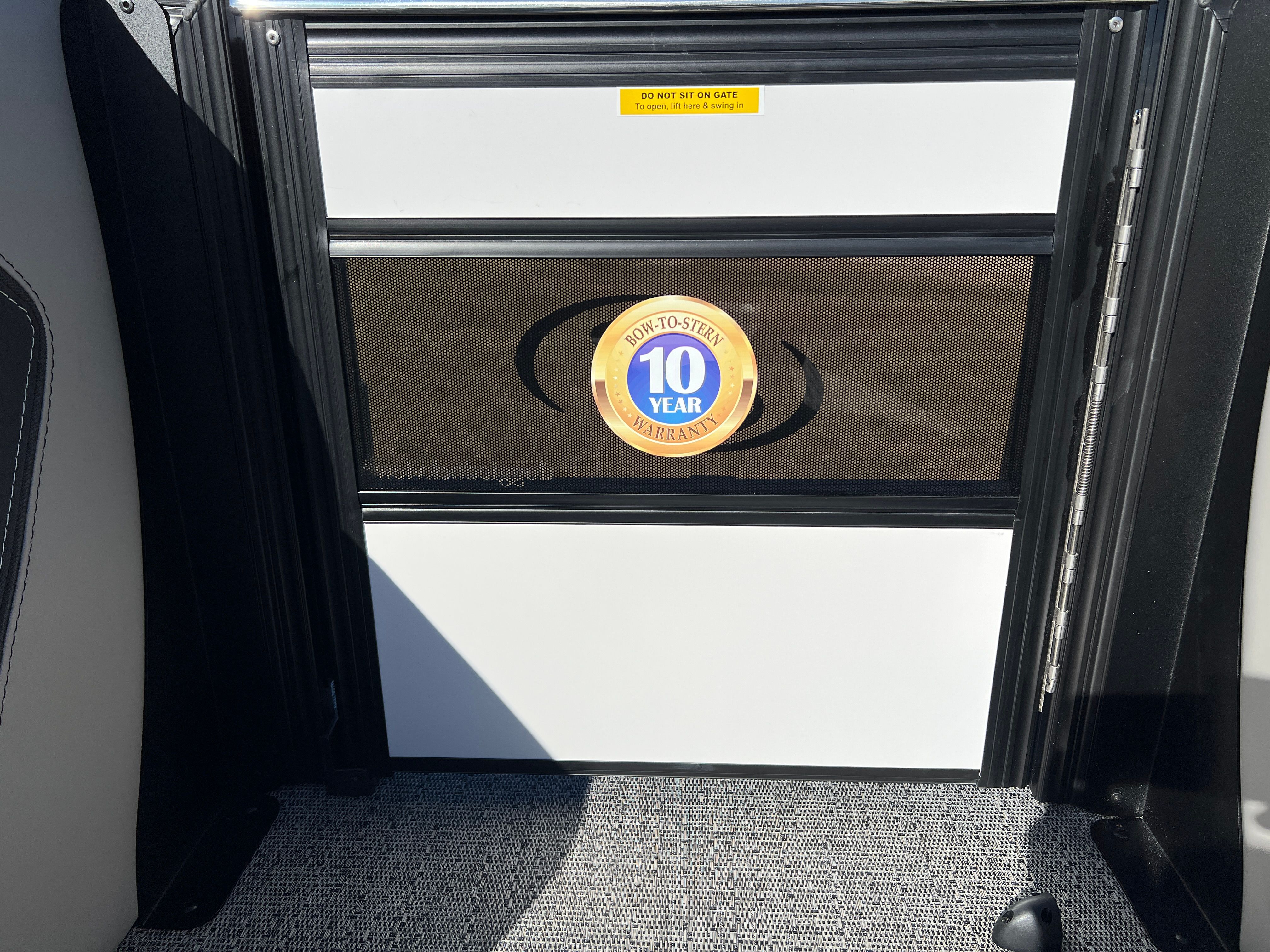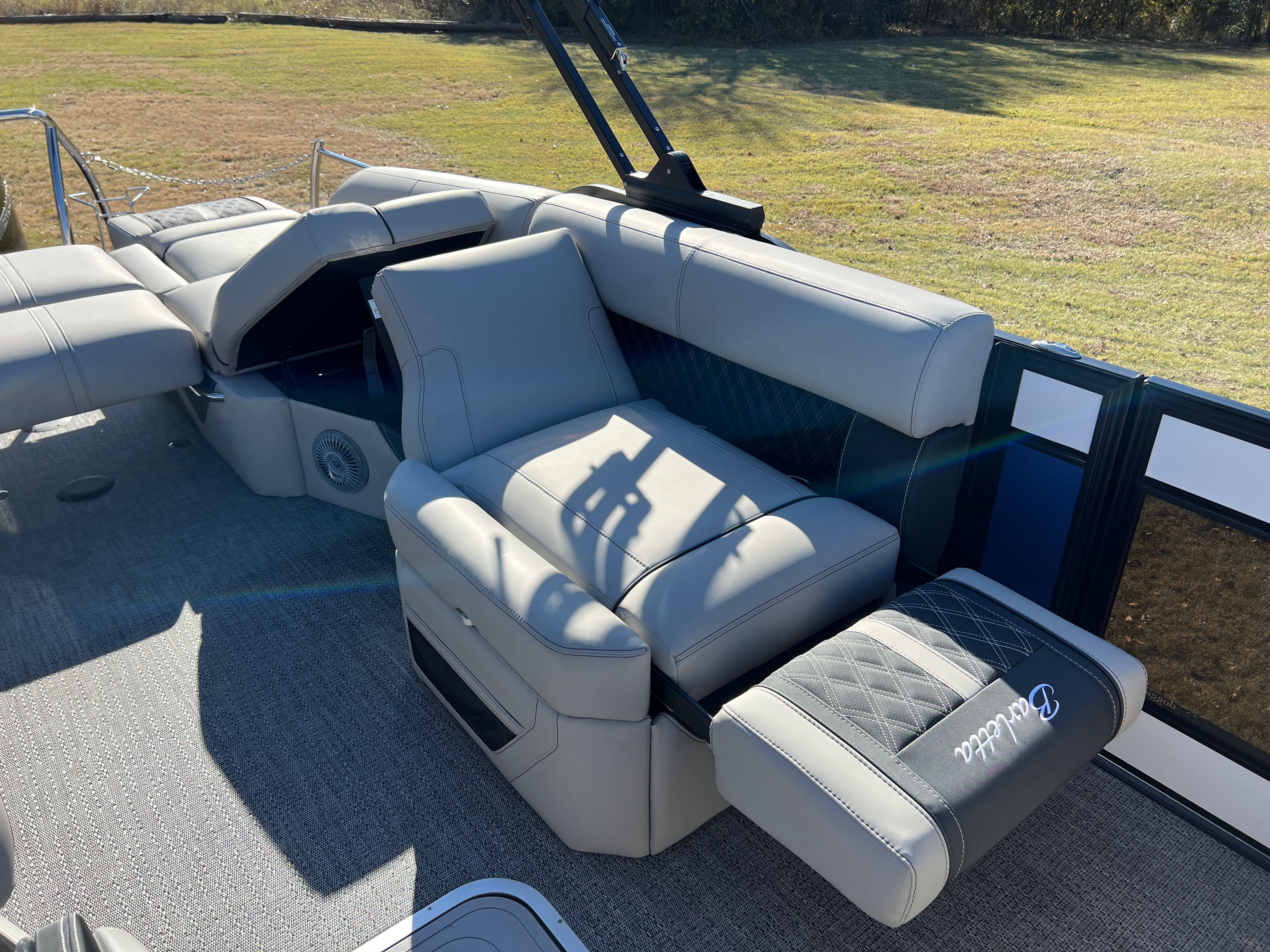 The Barletta Lusso L23M is loaded with features designed to enhance your time on the water. The onboard battery charger with two batteries ensures you have reliable power for all your adventures, while the Metal Jacket Protectant keeps your pontoon looking pristine season after season. The thoughtfully selected Marquesan Gray with Onyx furniture provides plush, supportive seating, perfect for lounging or entertaining guests. The Amore Gray flooring is both stylish and practical, offering a comfortable, slip-resistant surface that is easy to maintain. The Blackout Package Lusso railskin not only adds visual appeal but also offers added protection and durability. The Mercury Digital DTS Pre-Rig and Vessel Link system streamline engine management, giving you intuitive control and peace of mind. Hydraulic and power assist steering, along with digital gauges, ensure a smooth and responsive ride, while the stainless steel prop enhances performance and longevity.