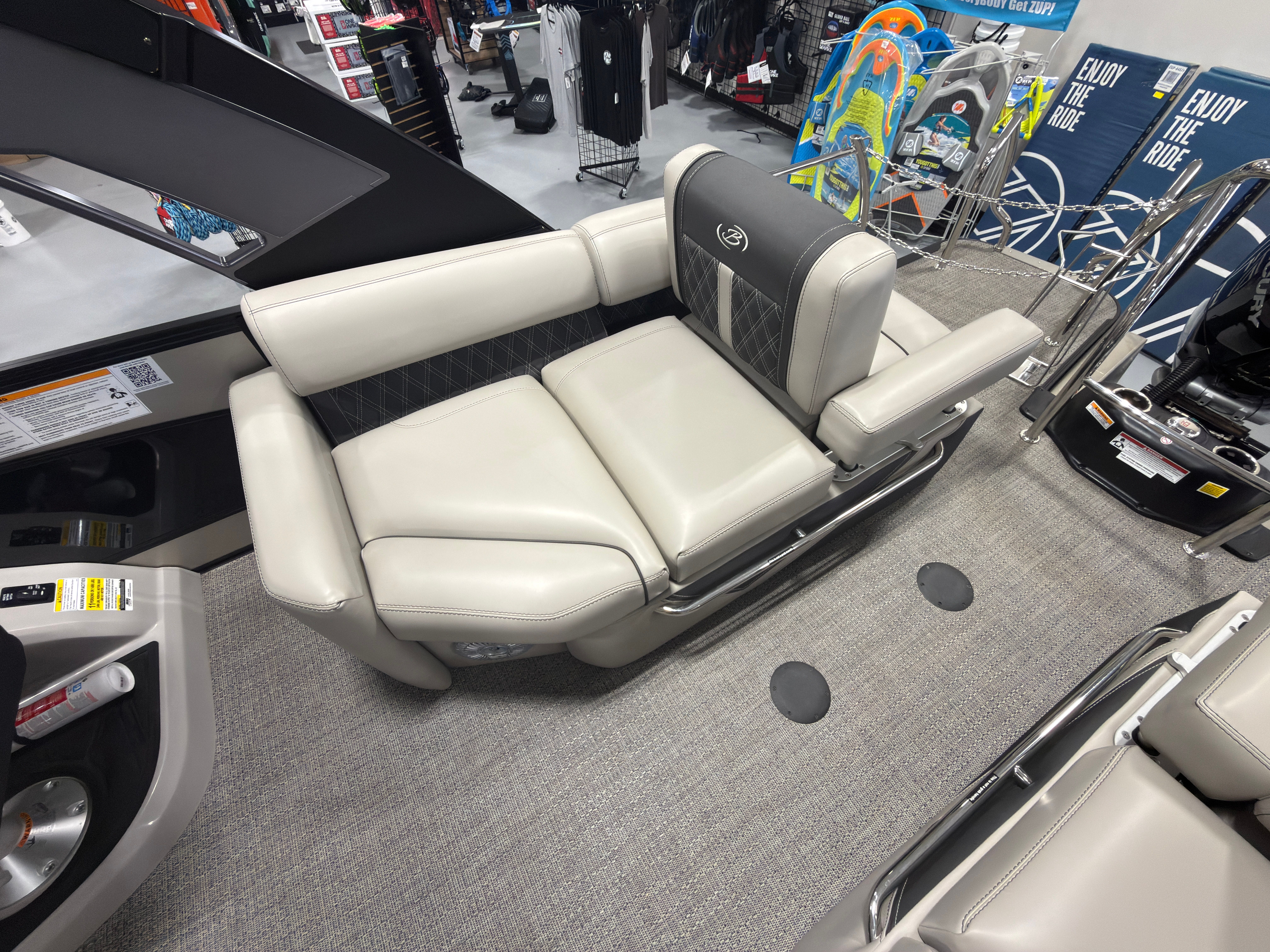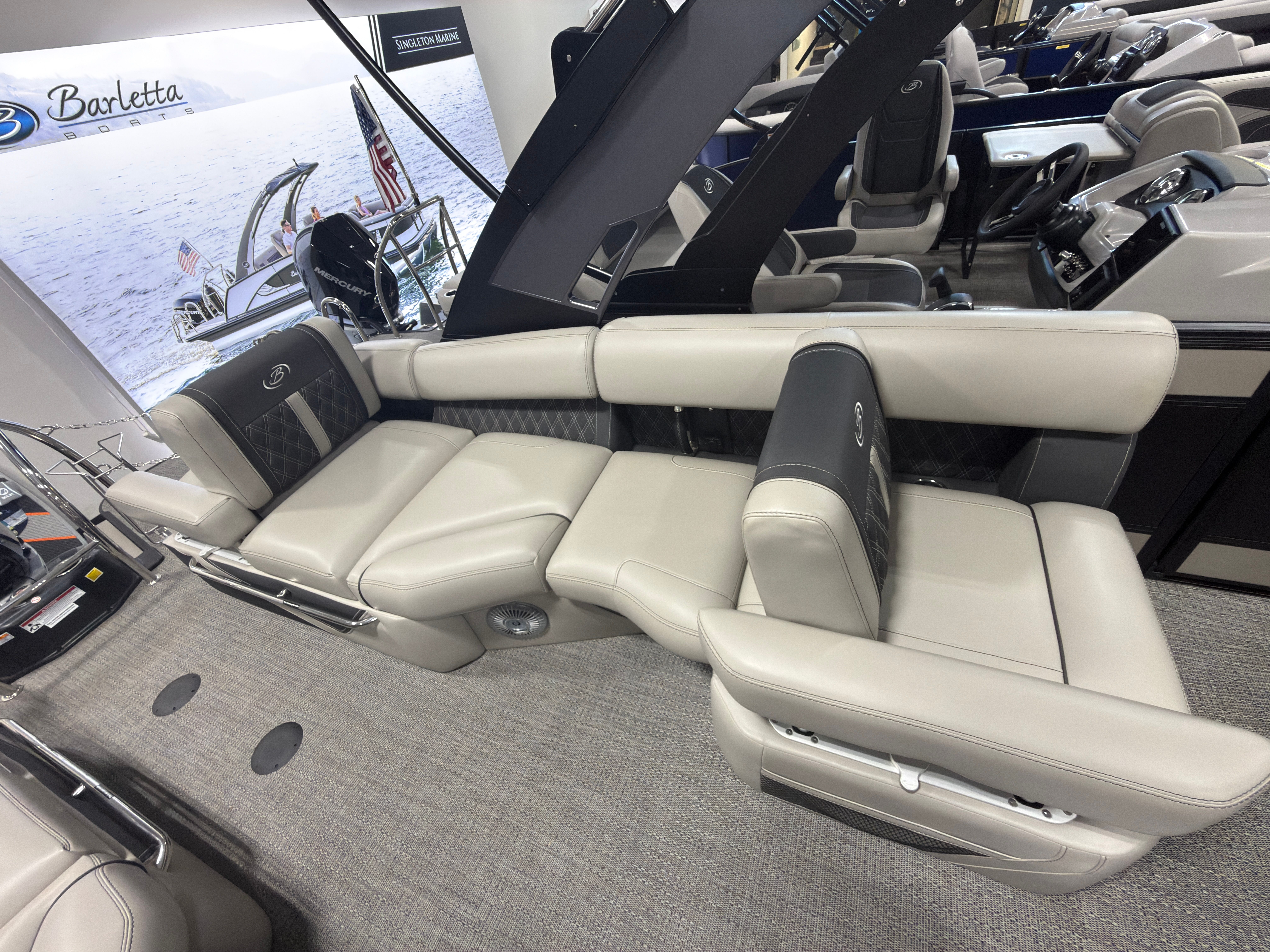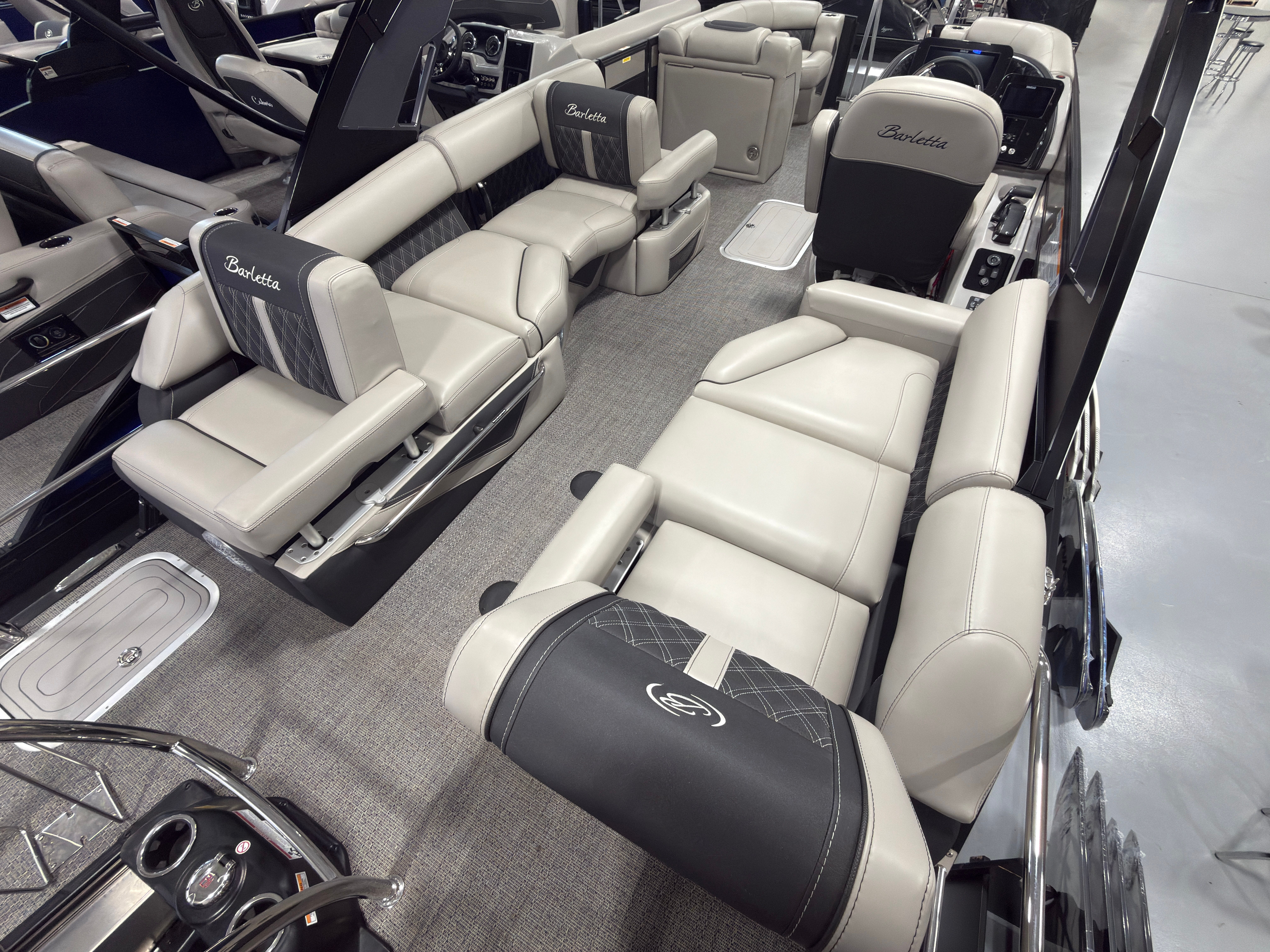 Step aboard the Barletta Lusso L23MA and discover a world of premium features designed to maximize comfort and convenience. The flooring is finished in Amore Gray, providing a sophisticated and easy-to-maintain surface that complements the boat’s overall aesthetic. The furniture, crafted in Marquesan Gray/Onyx, offers plush seating and ample lounging space, perfect for relaxing or entertaining guests.The Lusso L23MA features the Blackout Package Lusso railskin, adding a bold and modern touch to the exterior. The sweep color in Champagne and accent color in Black Diamond create a striking visual contrast, ensuring this pontoon stands out on the water. The Mercury Digital DTS Pre-Rig for VERADO engines with Vessel Link streamlines engine management, while hydraulic and power assist steering make handling effortless and precise.Digital gauges provide clear, real-time information, allowing you to monitor performance with ease. The exterior lighting, including white underdeck and underwater lights, enhances visibility and ambiance during evening cruises, creating a magical atmosphere for nighttime adventures.