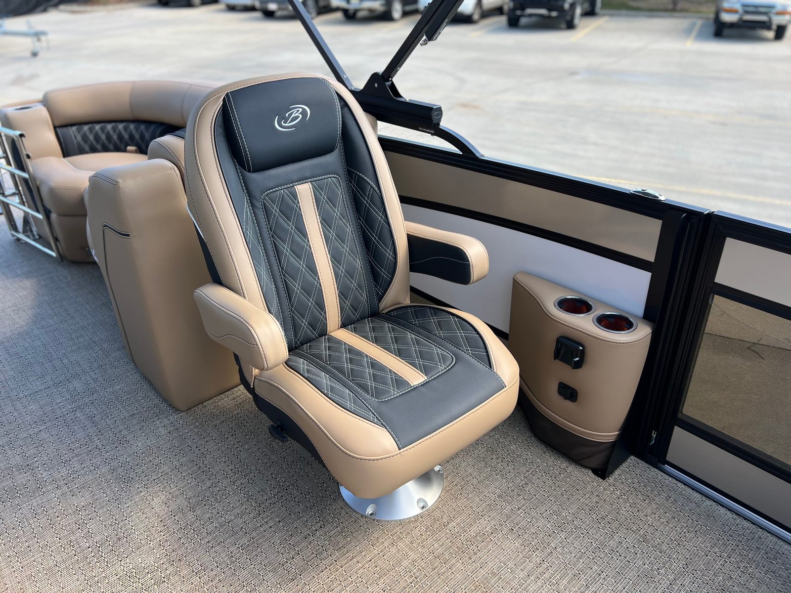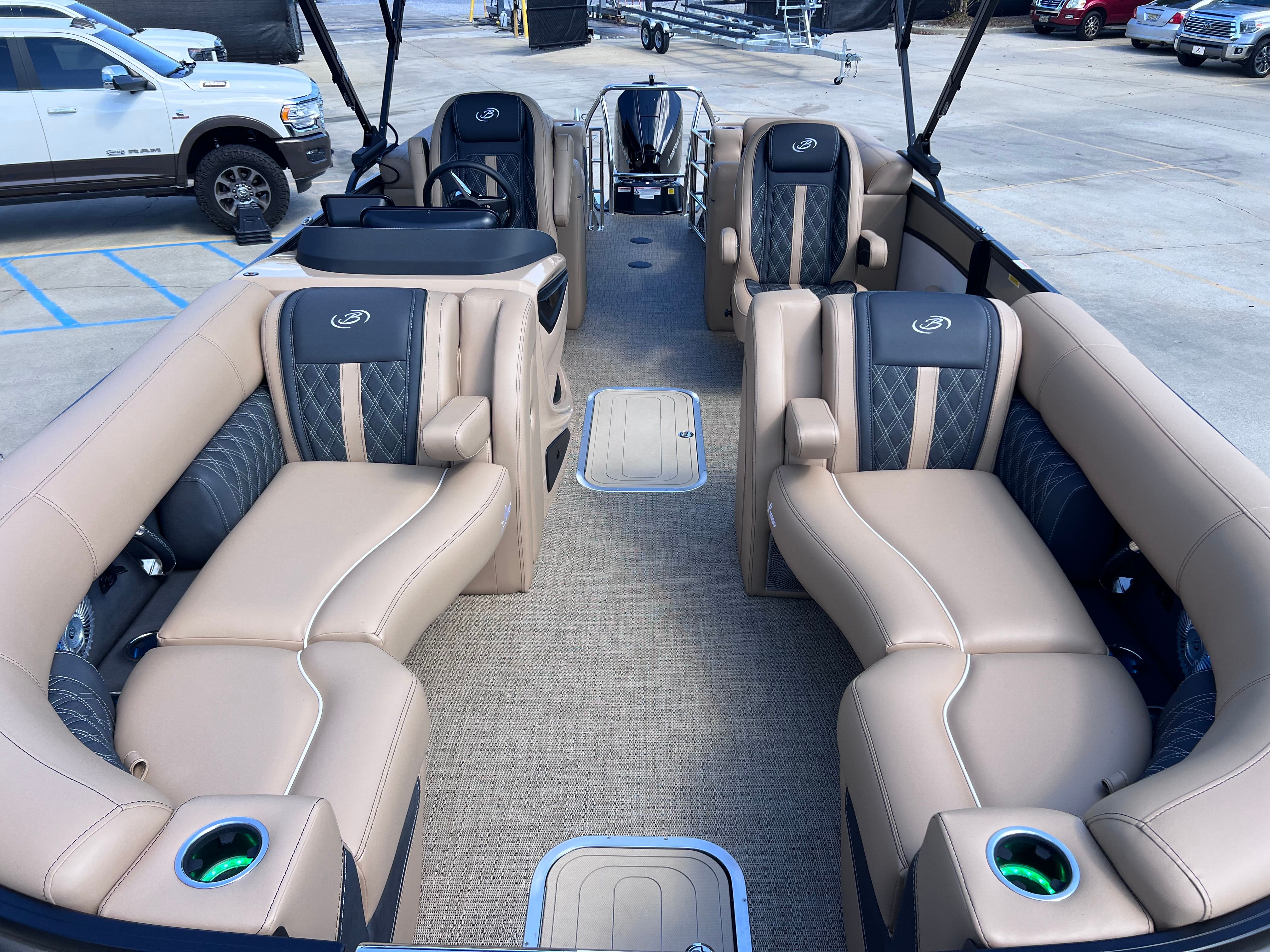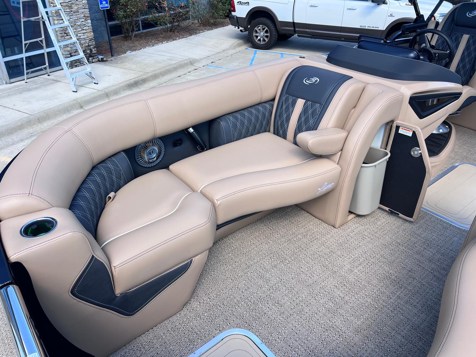 The Barletta Lusso L23QCSS is a 25.5-foot pontoon boat, crafted for those who appreciate the finer things in life. Built in 2026, this model showcases Barletta’s commitment to quality, comfort, and cutting-edge design. The Lusso series is renowned for its attention to detail, and the L23QCSS is no exception. Its Champagne sweep color, accented by Winter White, creates a sophisticated exterior that stands out at any marina or lake. The Blackout Package Lusso railskin adds a bold, modern touch, while the Carmella Tan with Onyx furniture and Amore Tan flooring provide a warm, inviting atmosphere for you and your guests.