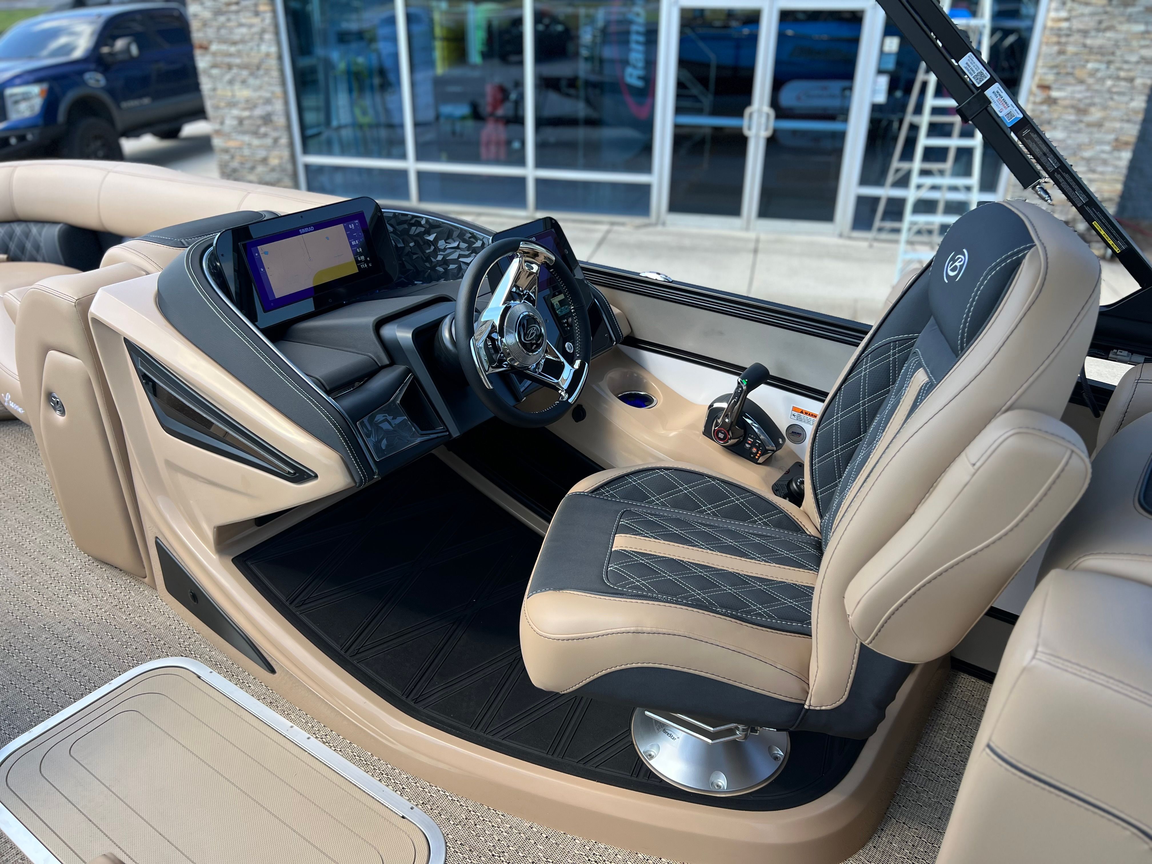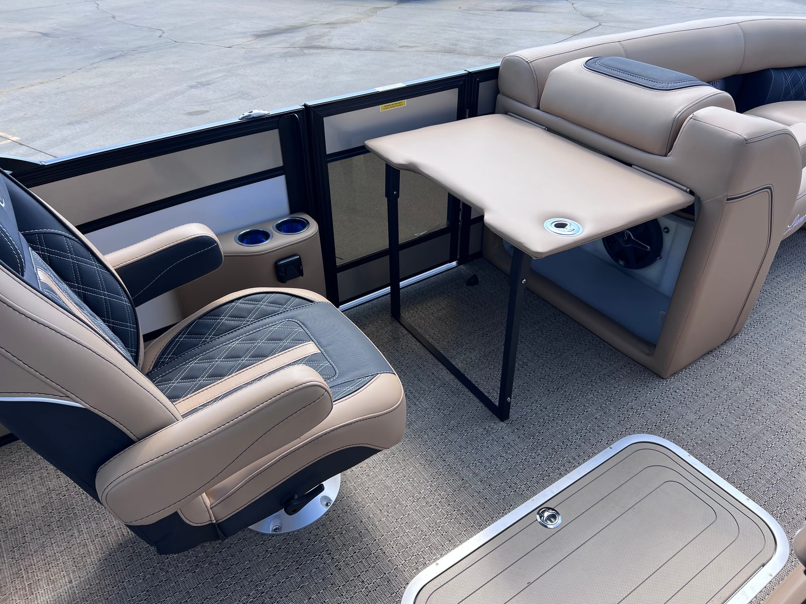 The Barletta Lusso L23QCSS is packed with premium features that enhance both comfort and convenience. Digital gauges provide clear, real-time information at a glance, allowing you to monitor your boat’s performance with ease. The rigging includes a stainless steel prop for durability and efficiency, while the on-board battery charger with two batteries ensures you’re always ready to go. Exterior protection is provided by the Metal Jacket Protectant, helping to maintain the boat’s pristine appearance season after season. Every detail, from the luxurious Carmella Tan with Onyx furniture to the Amore Tan flooring, is designed to create an inviting space for relaxation and socializing.