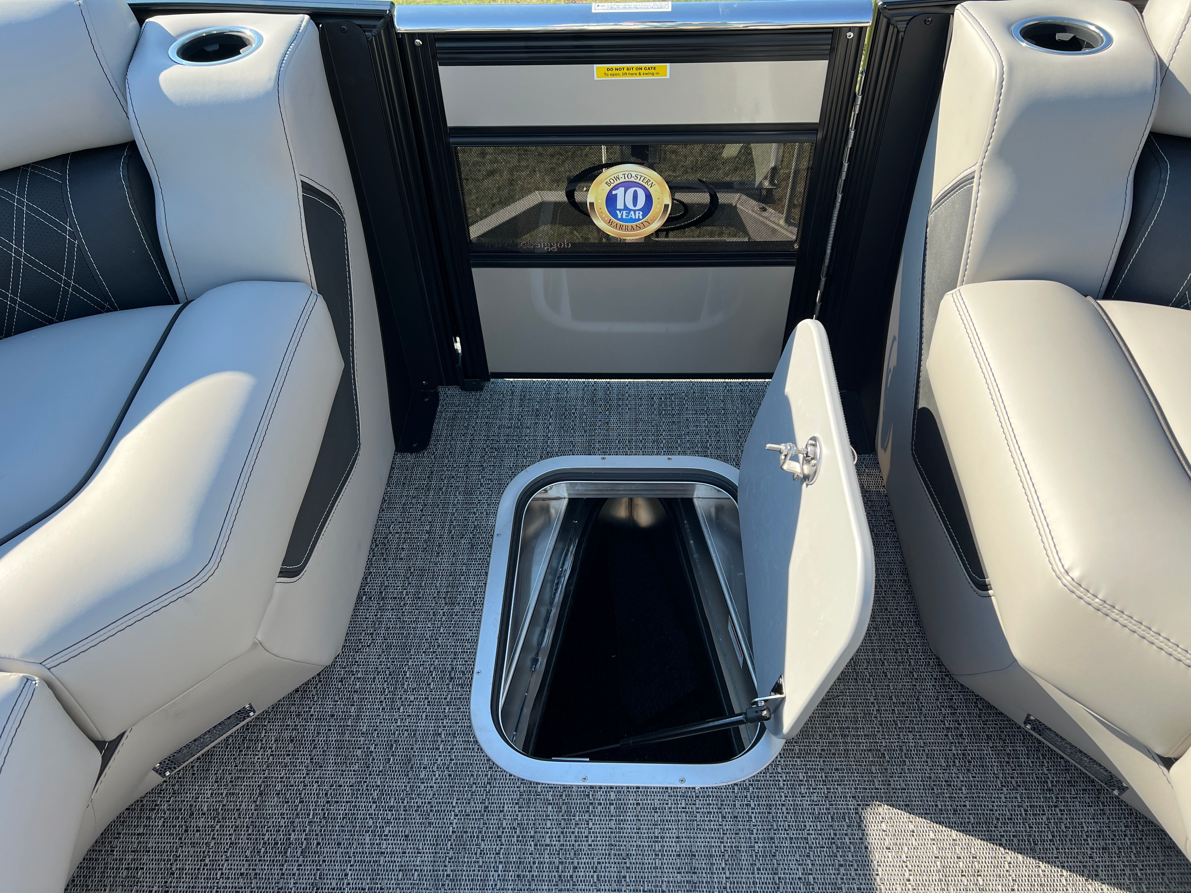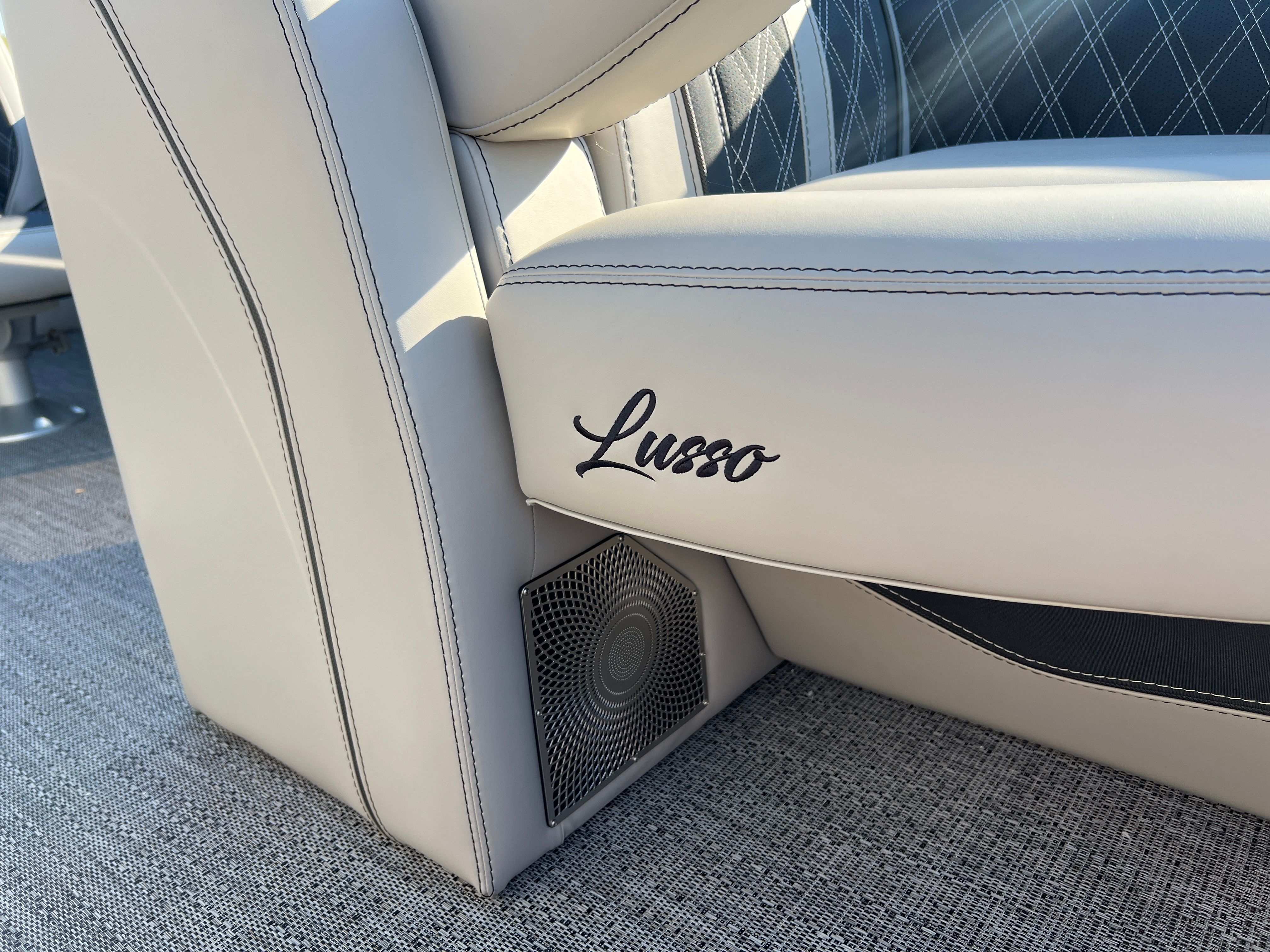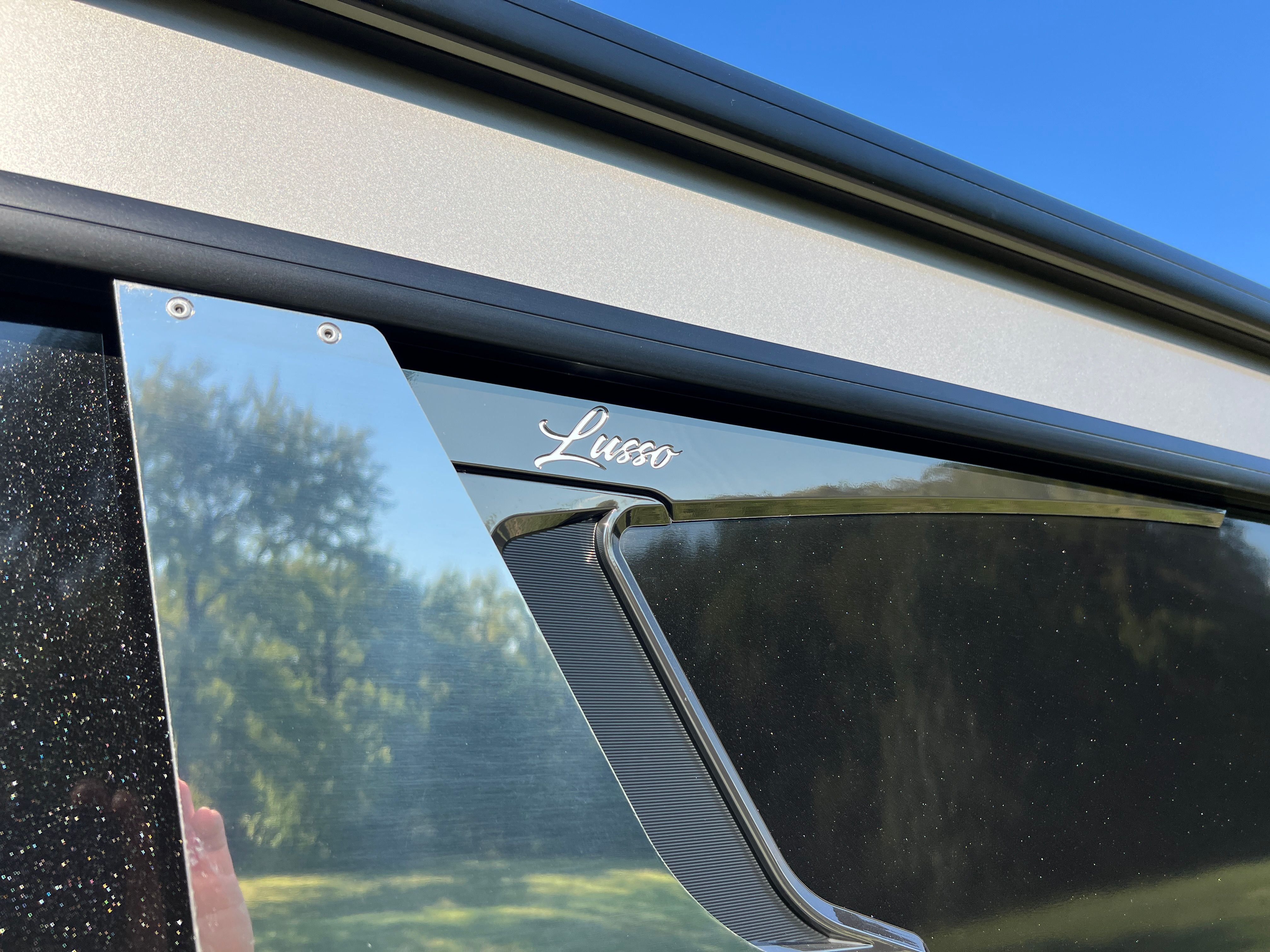 The Lusso L23UC is packed with features designed to enhance your time on the water. The onboard battery charger supports two batteries, ensuring you have plenty of power for extended outings. The Metal Jacket Protectant on the exterior adds durability and keeps your pontoon looking pristine season after season. The combination of Marquesan Gray furniture with Onyx accents and Amore Gray flooring creates a sophisticated lounge area, perfect for relaxing or entertaining. The Blackout Package Lusso railskin and the Champagne/Black Diamond color scheme set this pontoon apart from the rest, making it a true showpiece.