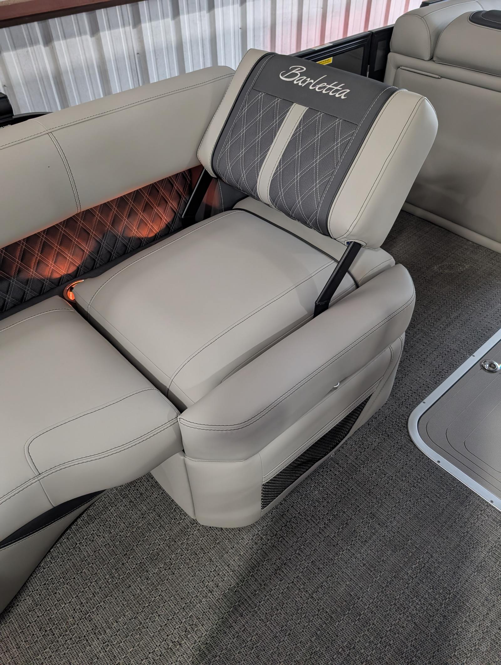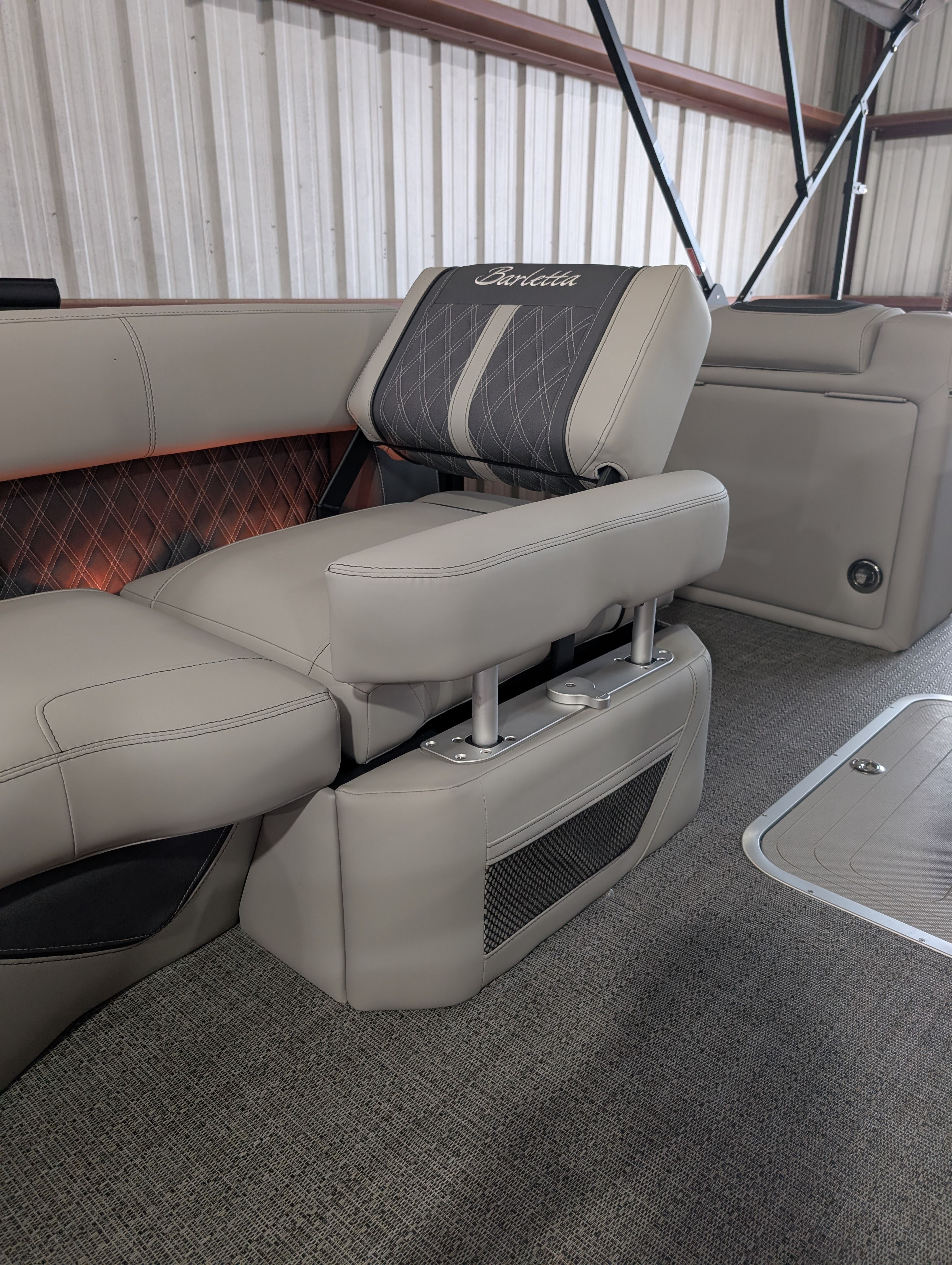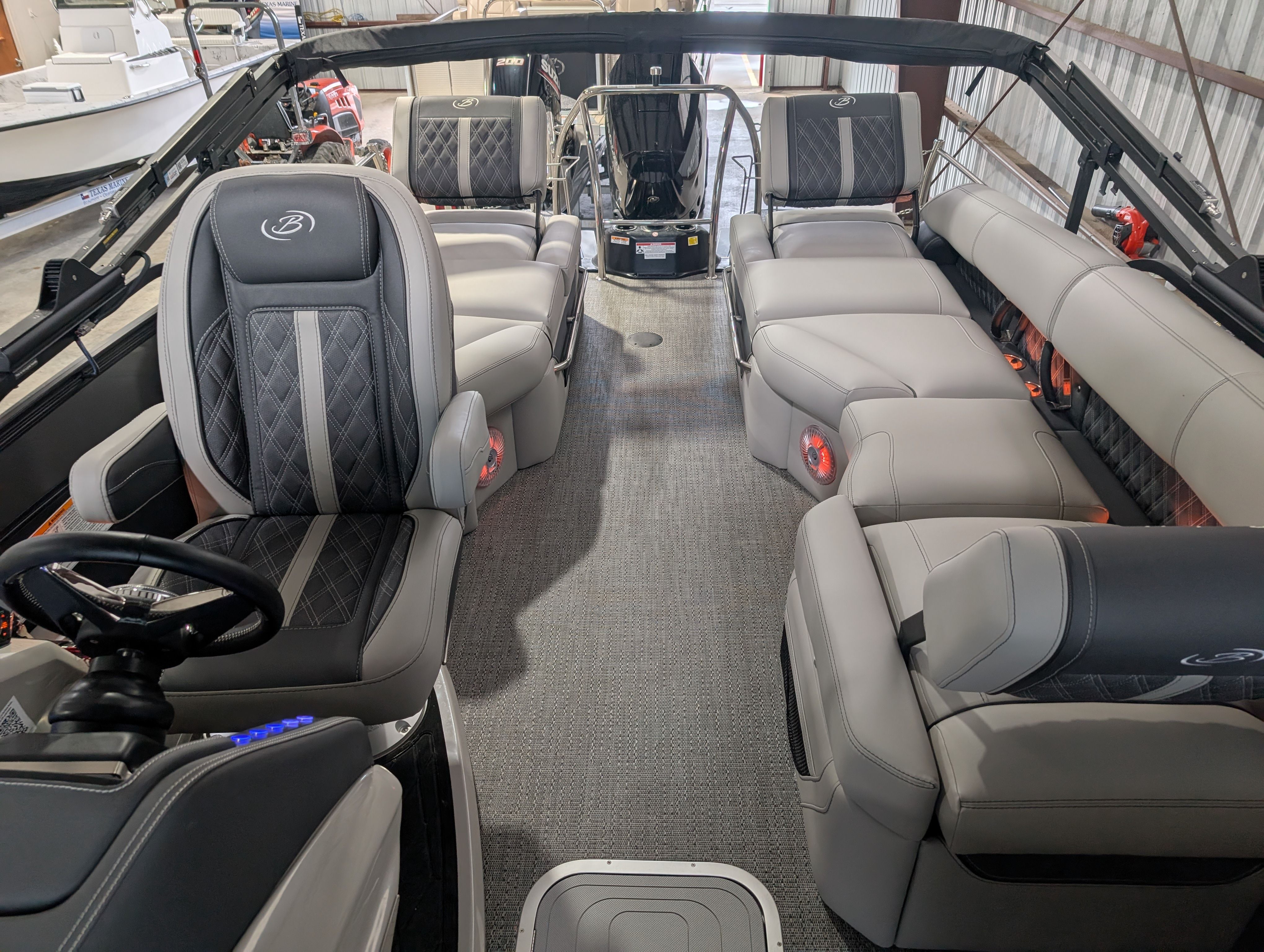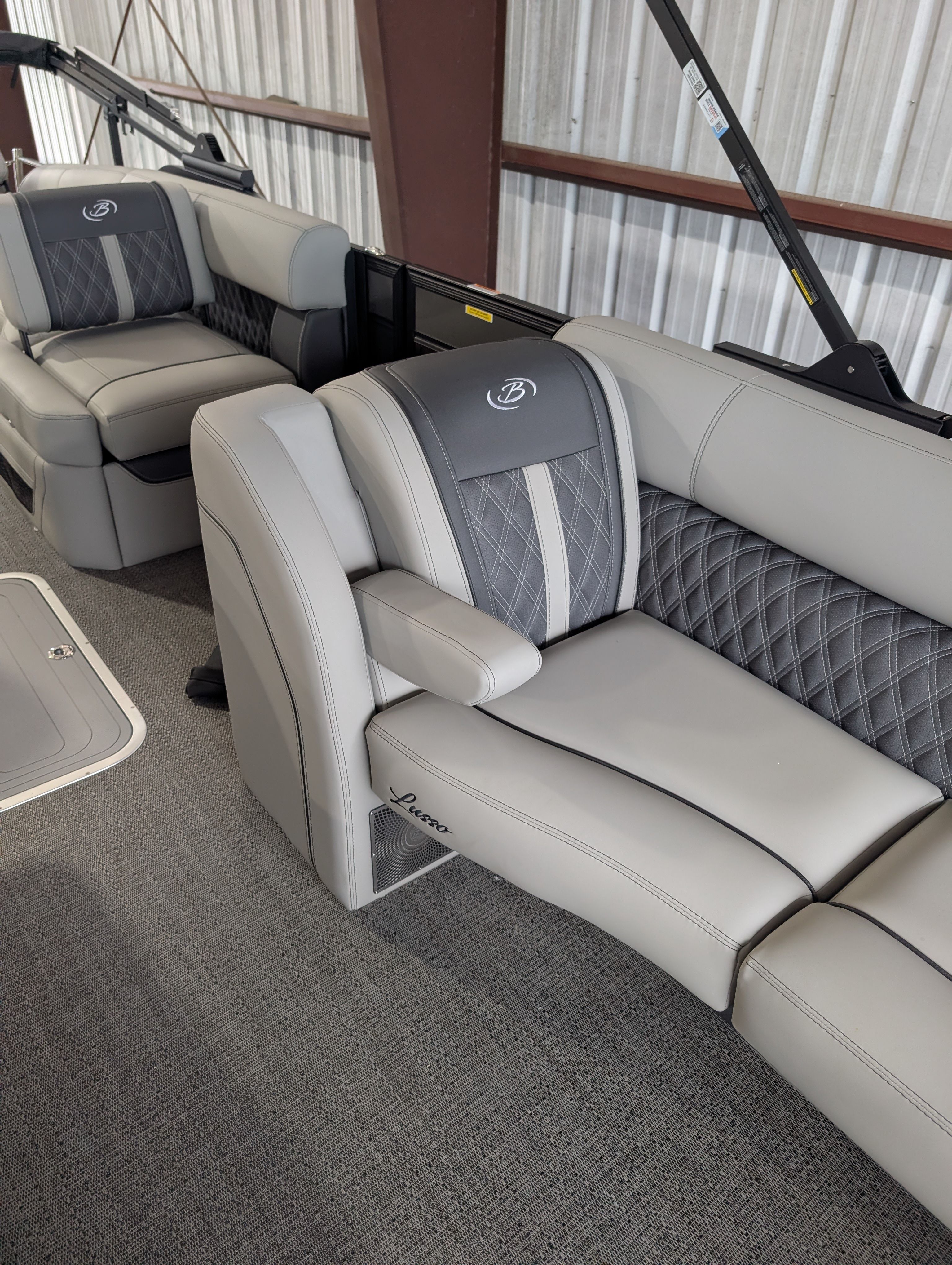 The Barletta Lusso L25M is packed with premium features that set it apart from other pontoon boats for sale. Step aboard and you’ll immediately notice the Amore Gray flooring, which provides a sophisticated foundation for the entire vessel. The interior is equally impressive, featuring Marquesan Gray furniture with Charcoal accents and a Matte Black accent color for a modern, upscale look.The captain’s chair at the helm is equipped with an adjustable pedestal, ensuring optimal comfort and visibility for the driver. Entertaining guests is a breeze thanks to the interior table, pedestal, and base, complete with Yeti-ready cupholders for your favorite beverages. Exterior lighting, including white underdeck and underwater lights, adds a dramatic flair for evening cruises and enhances safety after sunset.The Lusso L25M’s sweep color in Gray Moonstone complements its overall aesthetic, while the rigging and pre-rigging for the Mercury V10 engine ensure seamless integration and reliable performance. Every detail has been thoughtfully designed to maximize comfort, convenience, and enjoyment on the water.