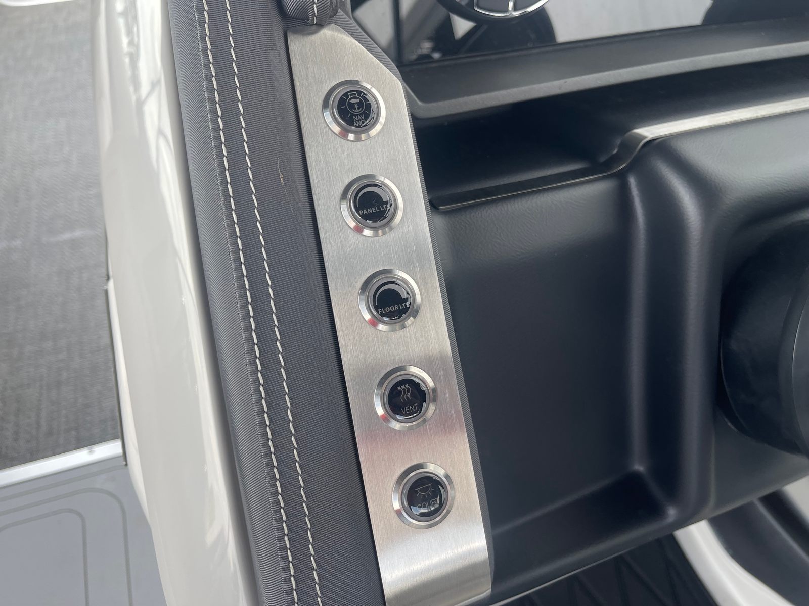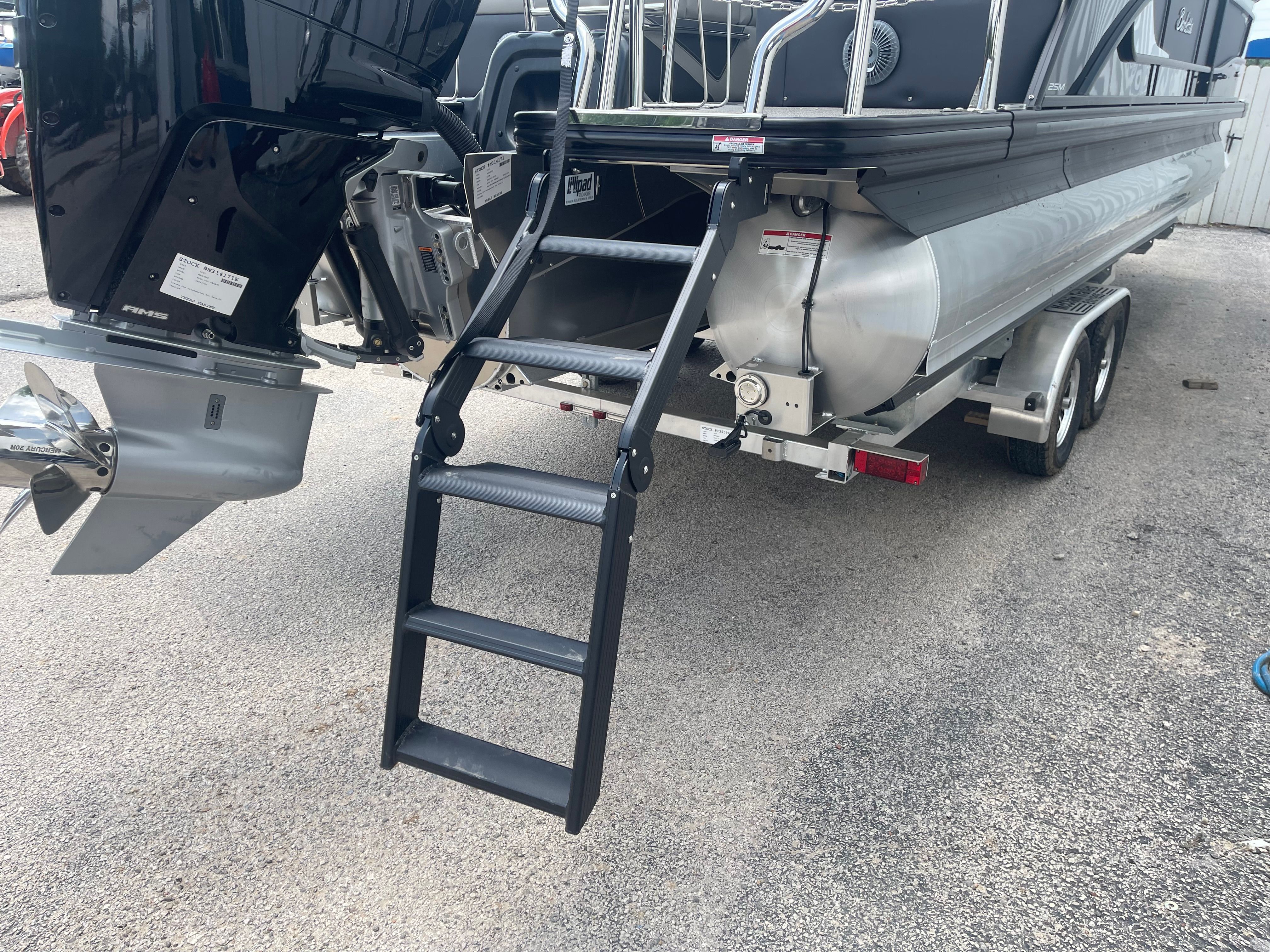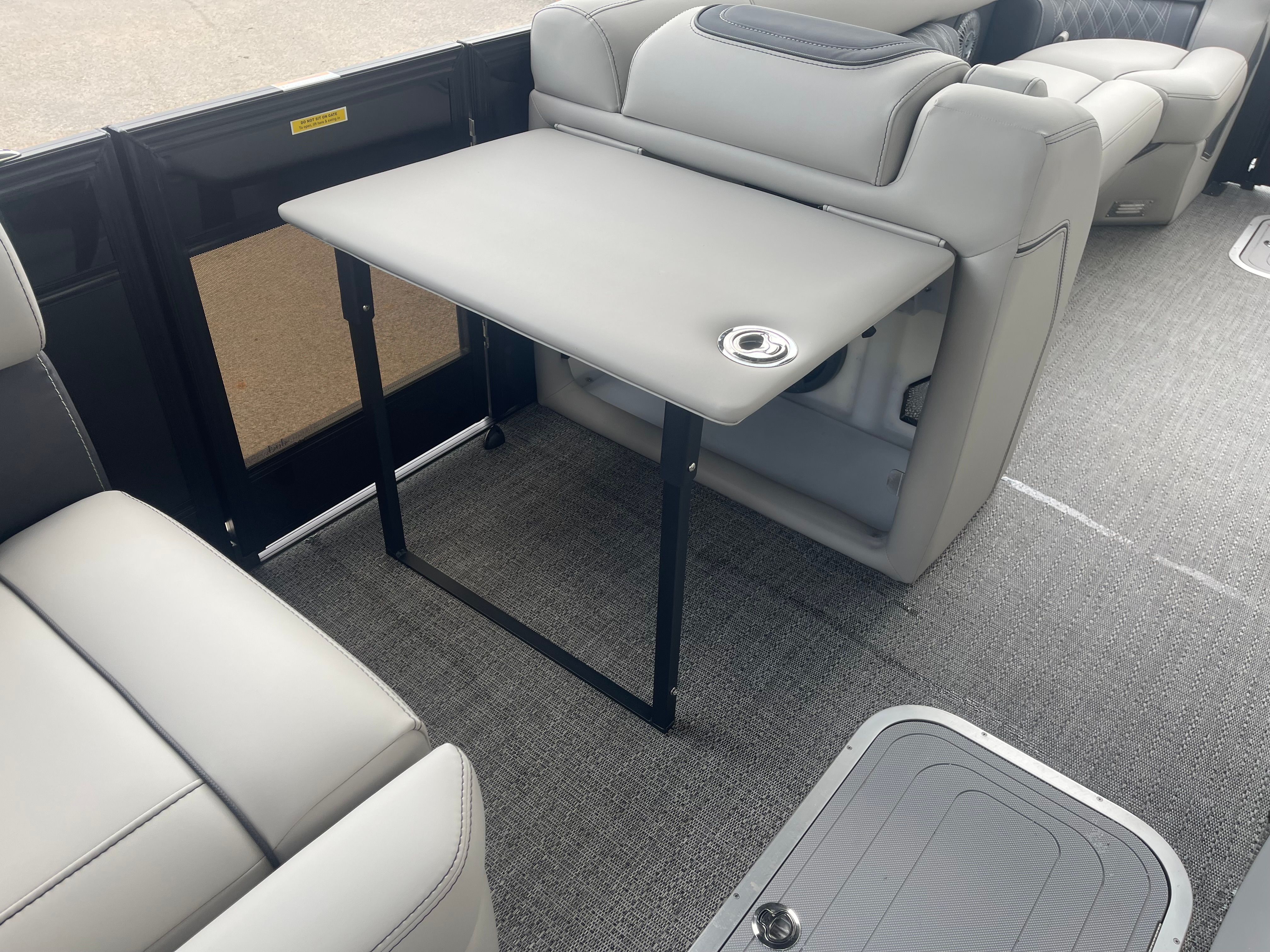 The 2025 Barletta Lusso L25M is packed with premium features that elevate your boating experience to new heights. The interior showcases an adjustable pedestal on the captain’s chair at the helm, providing customizable comfort and control for the captain. The Amore Gray flooring adds a touch of sophistication and durability, while the Marquesan Gray furniture with Charcoal accents creates a stylish and inviting atmosphere for all passengers.For those who love to entertain, the Lusso L25M includes a table with a pedestal and base, complete with Yeti-ready cupholders, making it easy to serve refreshments and keep drinks secure during your journey. The double bimini setup, featuring an additional power bimini, offers versatile shade options to keep everyone cool and comfortable, no matter how long you stay out on the water.Exterior enhancements include a metal jacket protectant for added durability and longevity, as well as striking white underdeck and underwater lighting that not only enhance the boat’s appearance but also improve visibility during evening cruises. The combination of Matte Black and Black Diamond colors gives the Lusso L25M a contemporary and elegant look that is sure to impress.