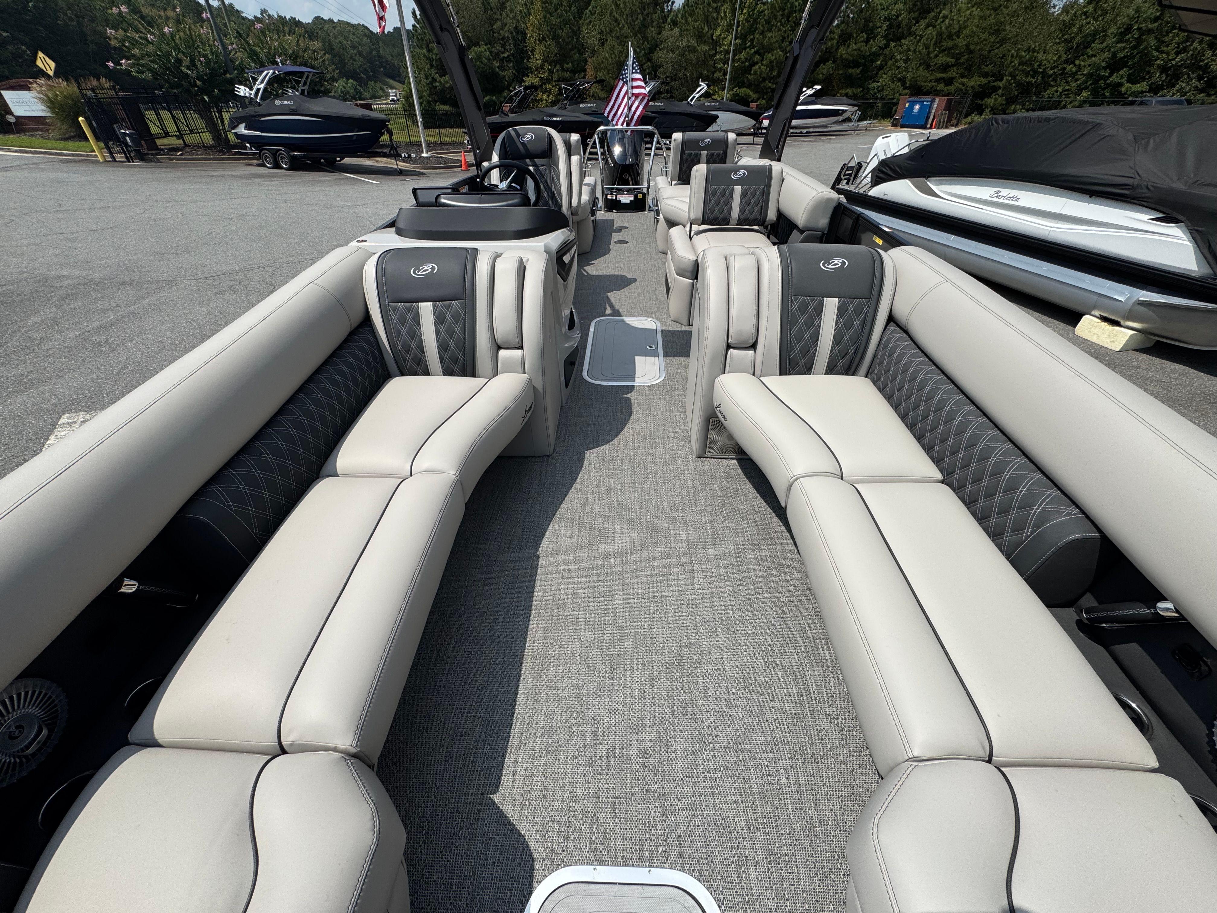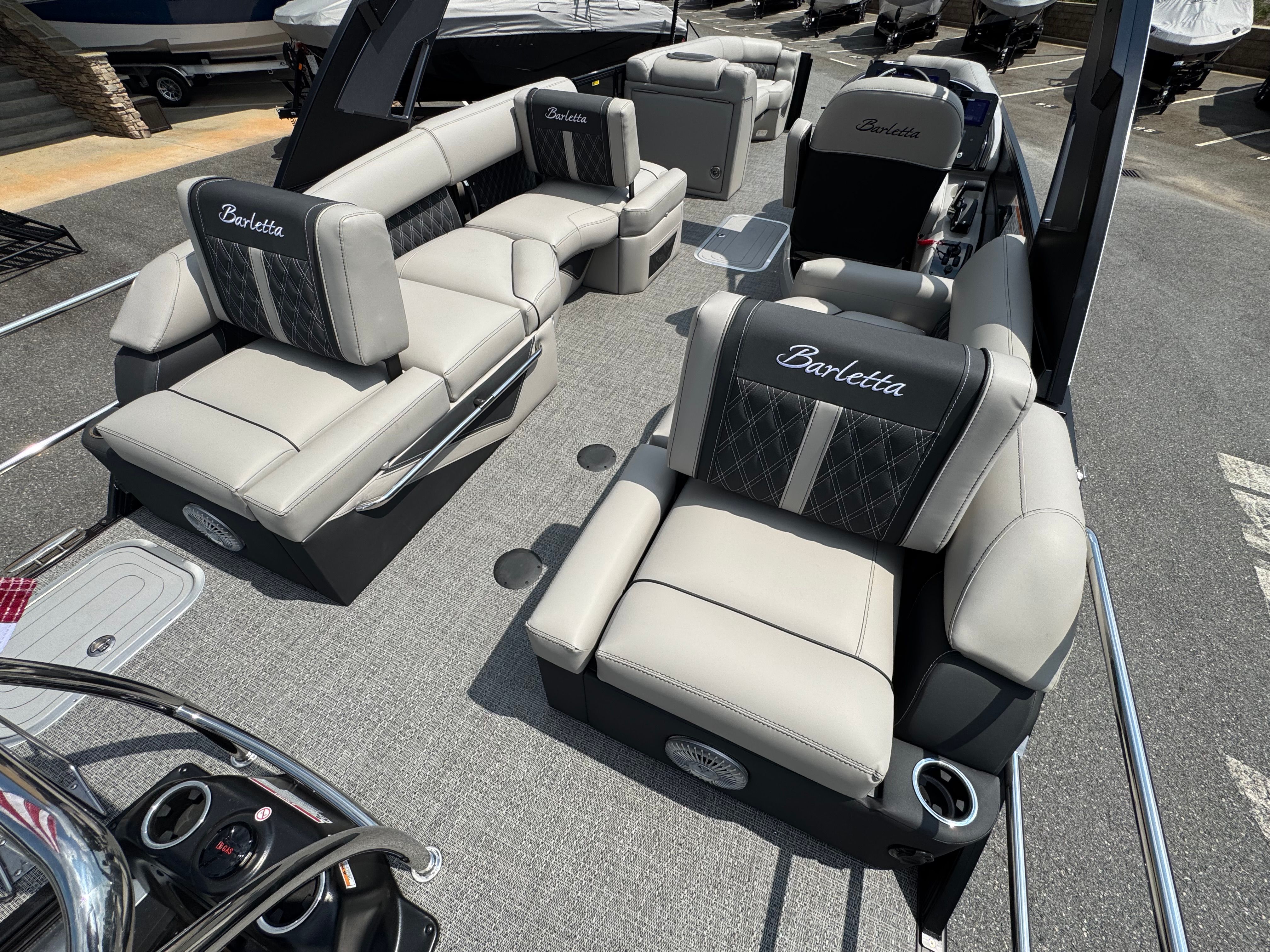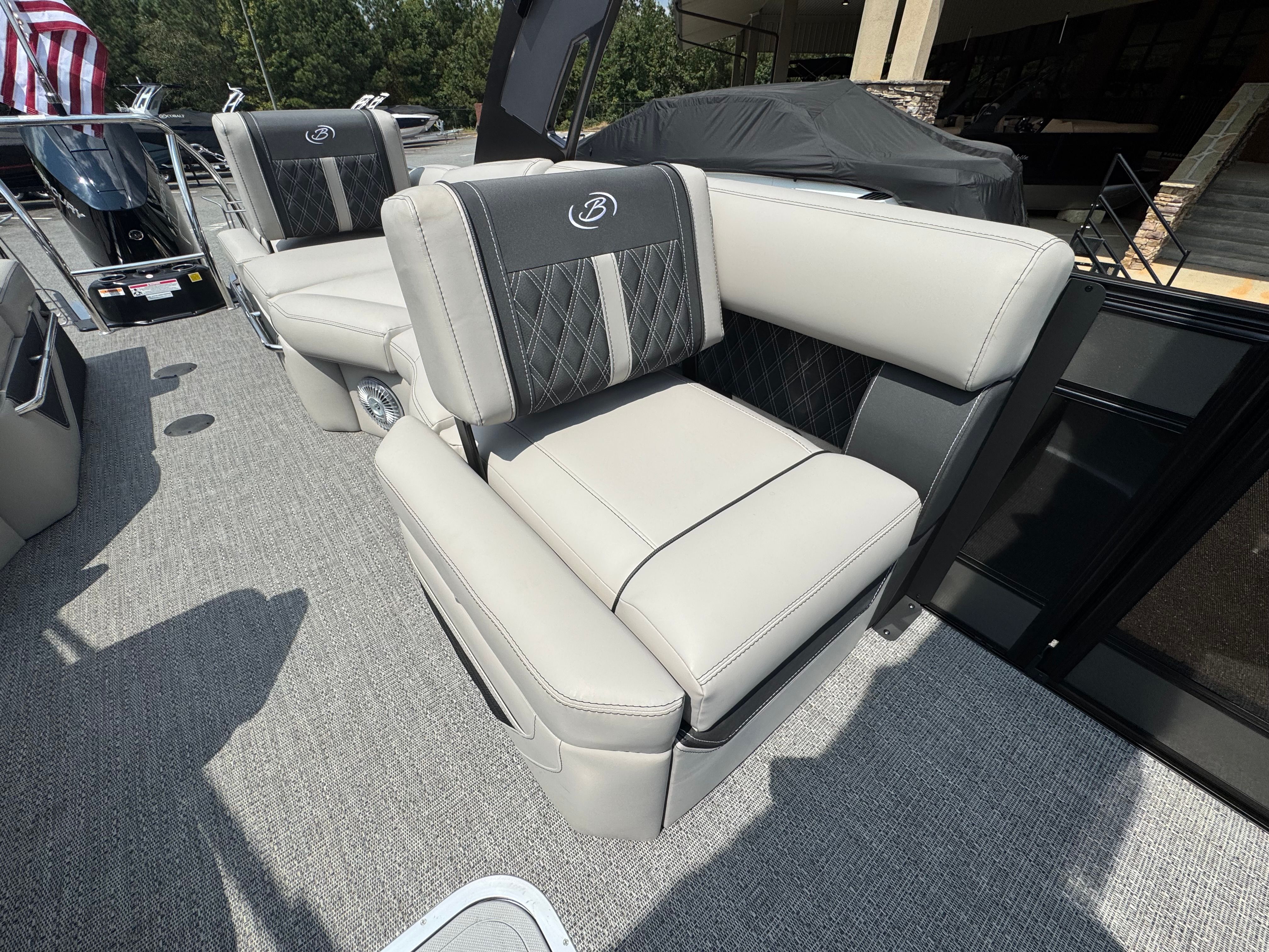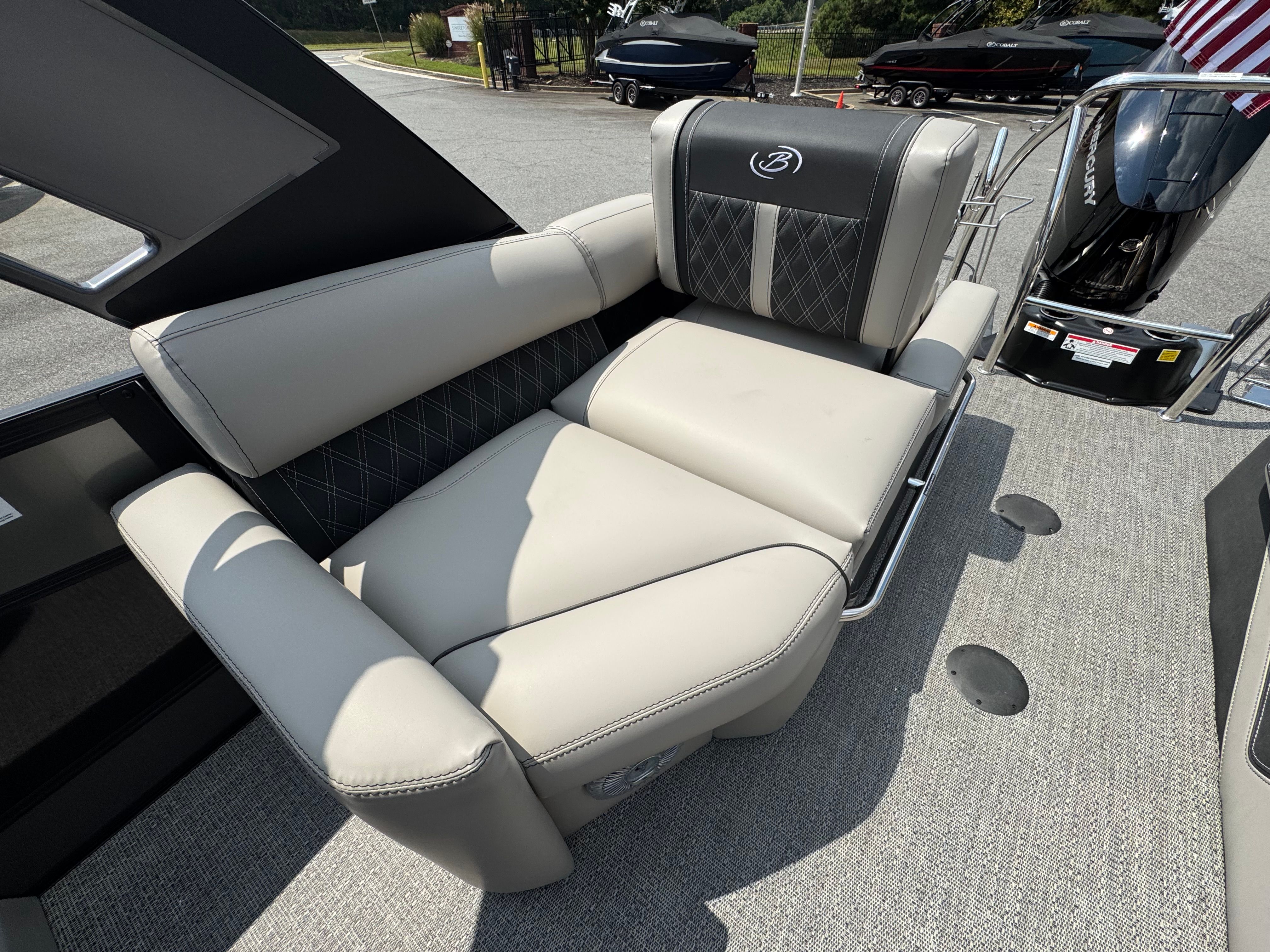 The 2026 Barletta Lusso L25MA is loaded with premium features designed to enhance your boating experience. The Marquesan Gray furniture with Onyx accents provides a luxurious and comfortable seating arrangement, perfect for relaxing or socializing with friends and family. The Amore Gray flooring adds a touch of sophistication while offering durability and easy maintenance. The Blackout Package Lusso railskin and Black Diamond accent color create a bold and modern aesthetic, ensuring your pontoon stands out wherever you go.For those who appreciate ambiance, the Lusso L25MA is equipped with white underdeck and underwater exterior lighting, creating a captivating atmosphere during evening cruises or dockside gatherings. The onboard battery charger with two batteries ensures you have reliable power for all your onboard systems, while the Mercury Digital Pre-Rig for V10 provides advanced control and monitoring of your engine’s performance. Every detail of this Barletta boat for sale is thoughtfully designed to deliver comfort, convenience, and style.