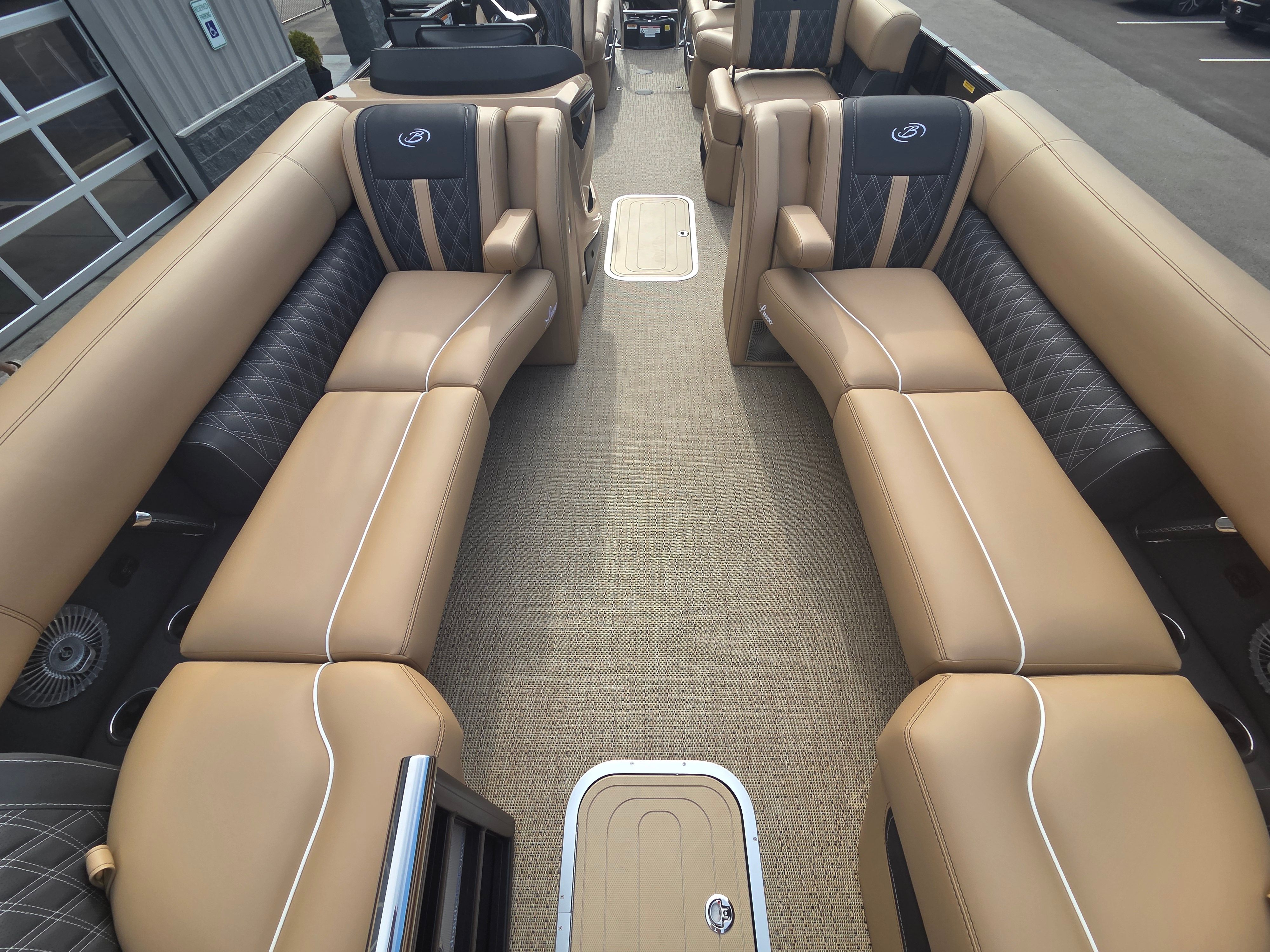 The Barletta Lusso L25MA is packed with special features that elevate your boating experience. The flooring is finished in Amore Tan, providing a warm and inviting atmosphere that complements the Carmella Tan with Onyx furniture. The exterior is protected by Metal Jacket Protectant, ensuring durability and a lasting shine. The Blackout Package Lusso railskin adds a bold, modern touch to the boat’s profile, while the Meridian Flip Table, pedestal, and base offer versatile options for dining, entertaining, or simply relaxing.For those who appreciate ambiance, the Lusso L25MA is equipped with white exterior lighting under the deck and underwater, creating a captivating glow during evening cruises. The onboard battery charger supports two batteries, ensuring you have reliable power for all your electronics and accessories. These features, combined with Barletta’s commitment to quality construction, make the Lusso L25MA a standout pontoon boat for sale in today’s market.