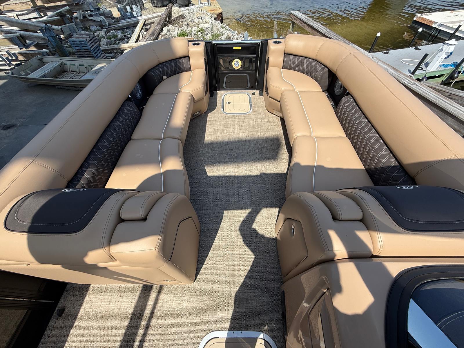 In addition to its recreational appeal, the Lusso L25MAT offers practical benefits that make ownership easy and enjoyable. The pontoon design provides excellent stability, making it ideal for families with children or those who prefer a smooth, steady ride. The spacious layout allows for convenient storage of gear, water toys, and personal items, ensuring everything you need is within reach. The dual engines not only enhance performance but also contribute to efficient fuel usage, helping you spend more time on the water and less at the pump. Docking and maneuvering are simplified by the responsive controls, making this pontoon boat for sale a pleasure to operate.