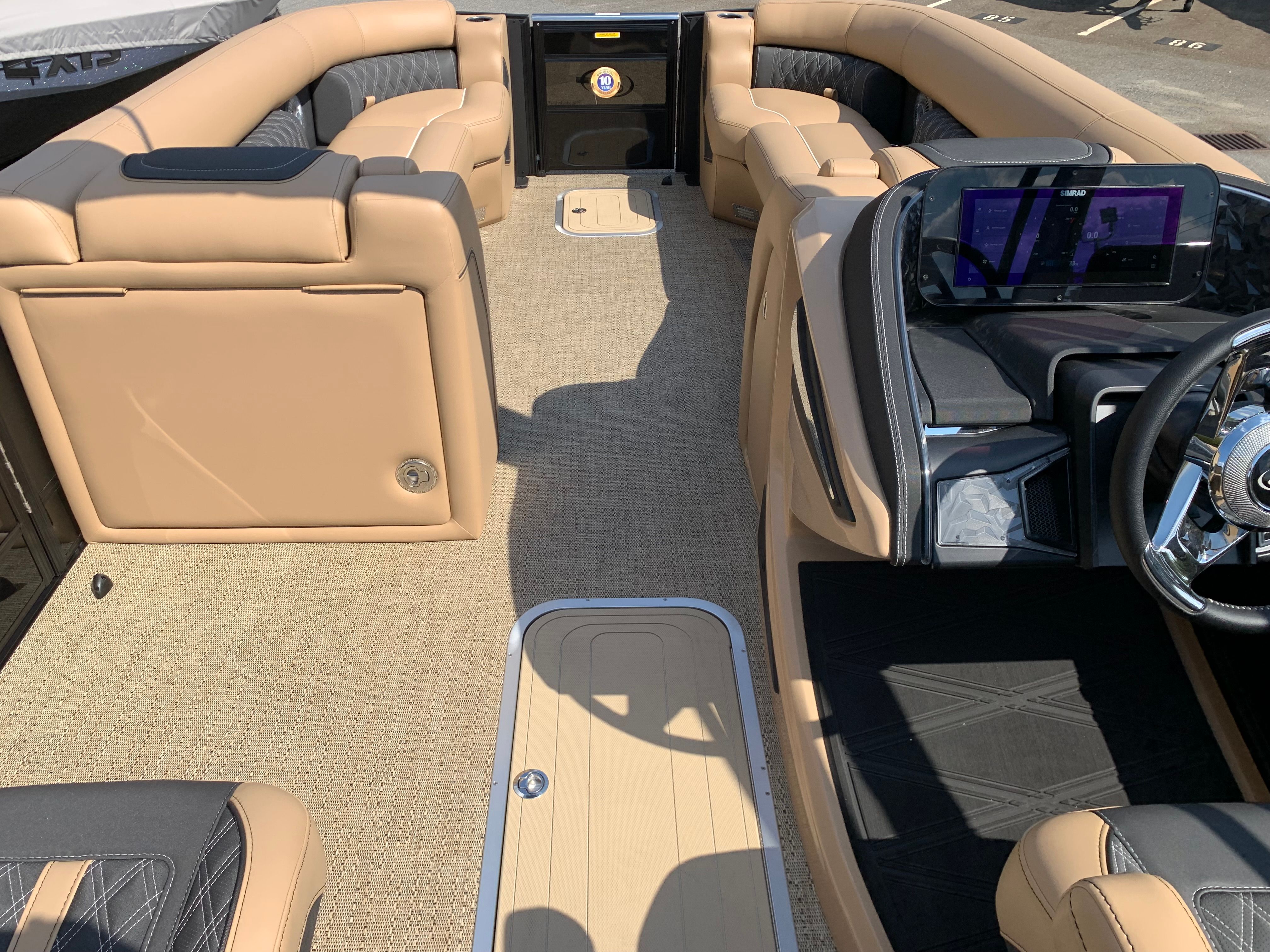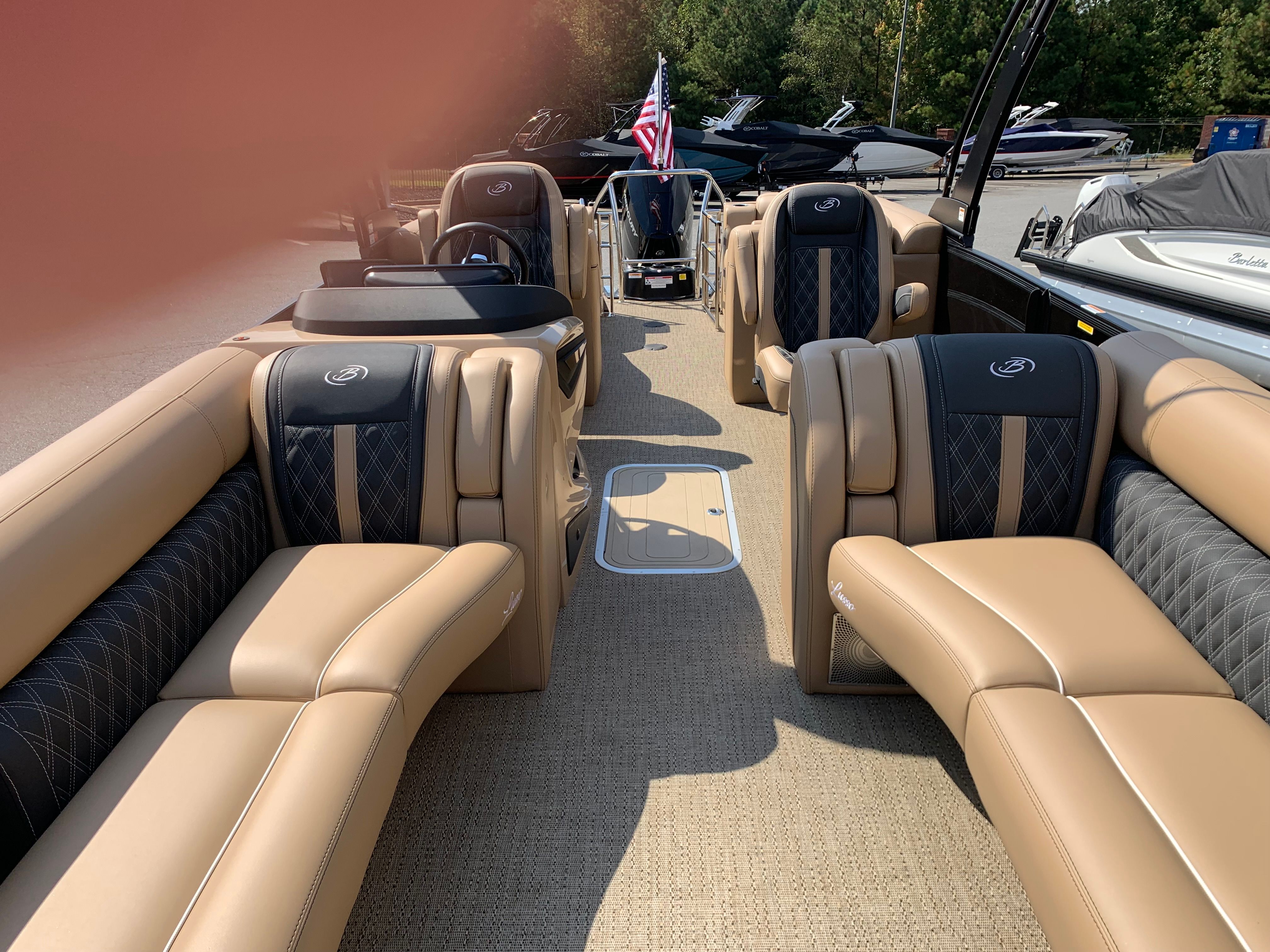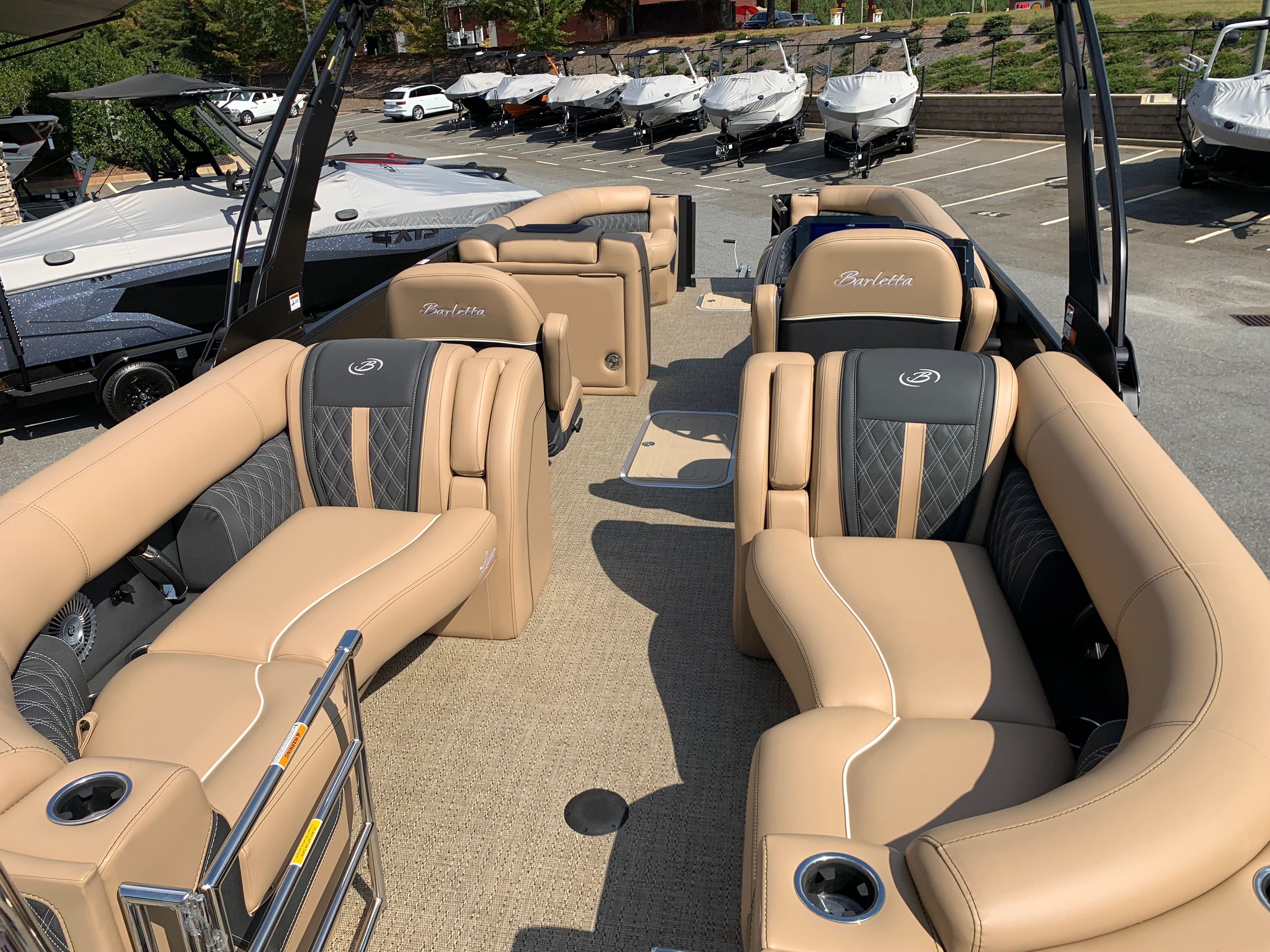 The 2026 Barletta Lusso L25QCSS is loaded with premium features designed to elevate your time on the water. The Blackout Package Lusso Railskin adds a touch of elegance and exclusivity, while the Sport Bimini (installed in place of the standard bimini) offers superior sun protection and a sporty look. Enjoy the ambiance created by white underdeck and underwater exterior lighting, perfect for evening cruises or entertaining guests after sunset. The flooring features luxurious Amore Tan material, providing both comfort and durability underfoot. The furniture is upholstered in Carmella Tan with Onyx accents, ensuring a plush and stylish seating arrangement for all passengers.