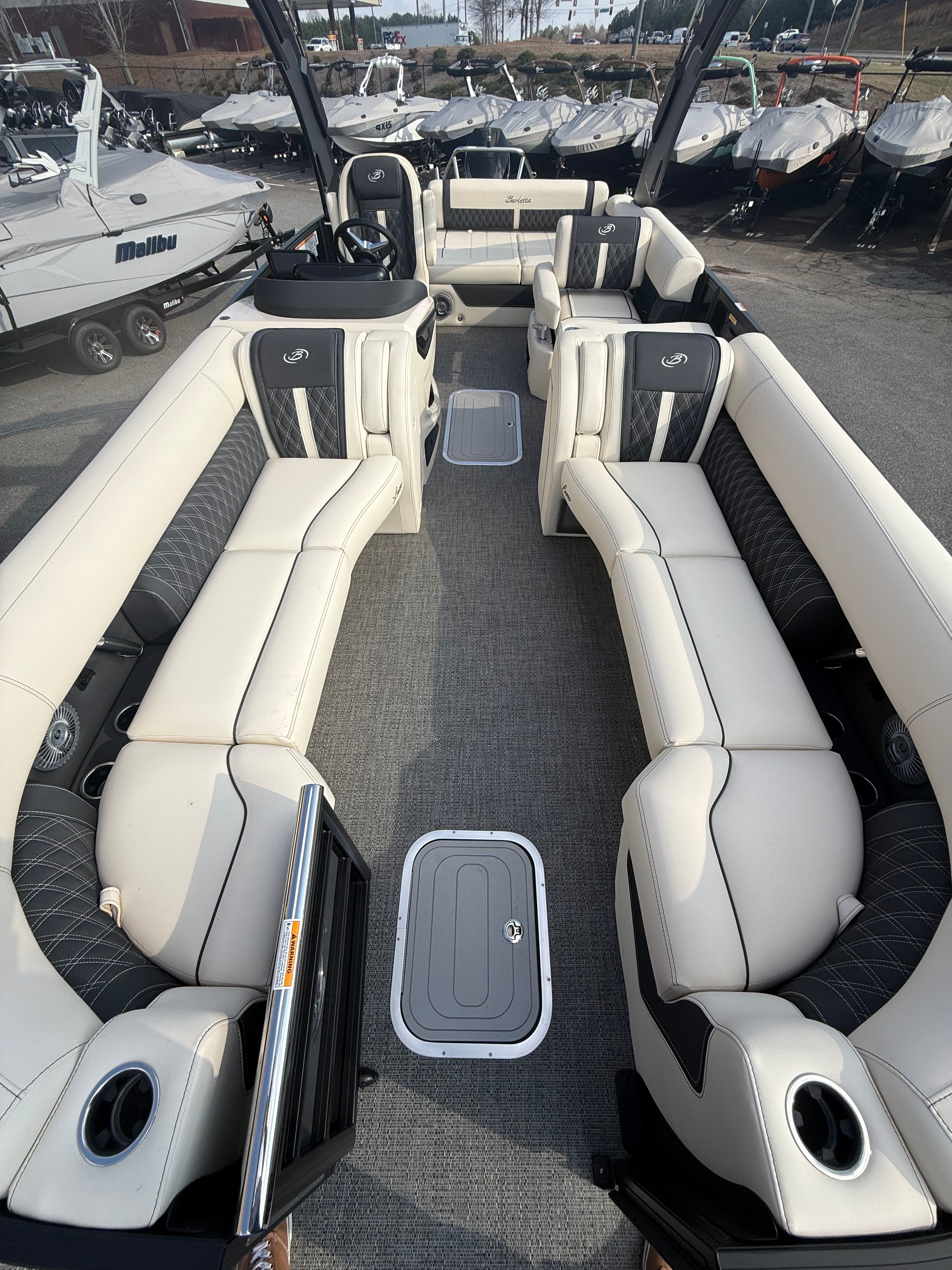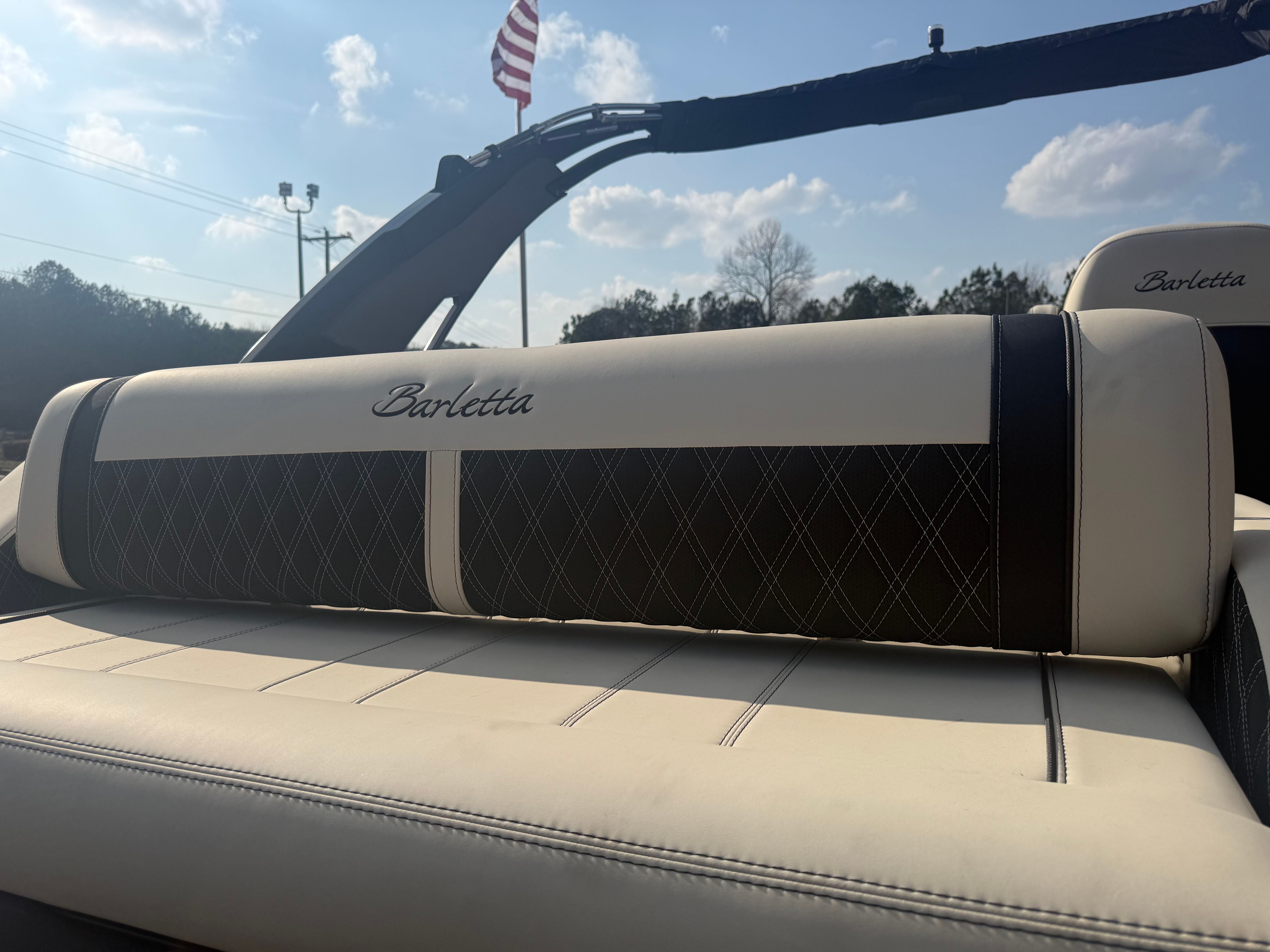 The 2026 Barletta Lusso L25UA is loaded with premium features designed to elevate your boating experience. The exterior lighting package includes white underdeck and underwater lights, creating a captivating ambiance for evening cruises and dockside gatherings. The Amore Gray flooring not only adds a touch of elegance but also provides a comfortable, slip-resistant surface for all your on-board activities. The furniture, finished in luxurious Linen with Onyx accents, offers plush seating and ergonomic support, ensuring every passenger enjoys the journey in style. The Blackout Package Lusso railskin enhances the boat’s sleek profile, while the Matte Black accent color adds a modern edge to its overall appearance.