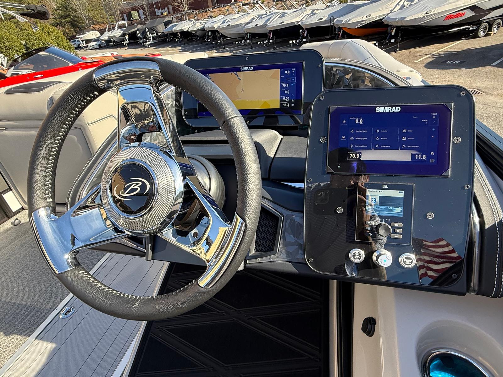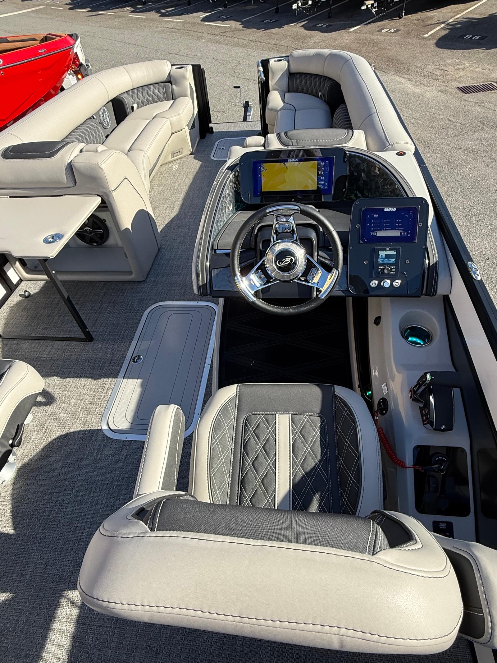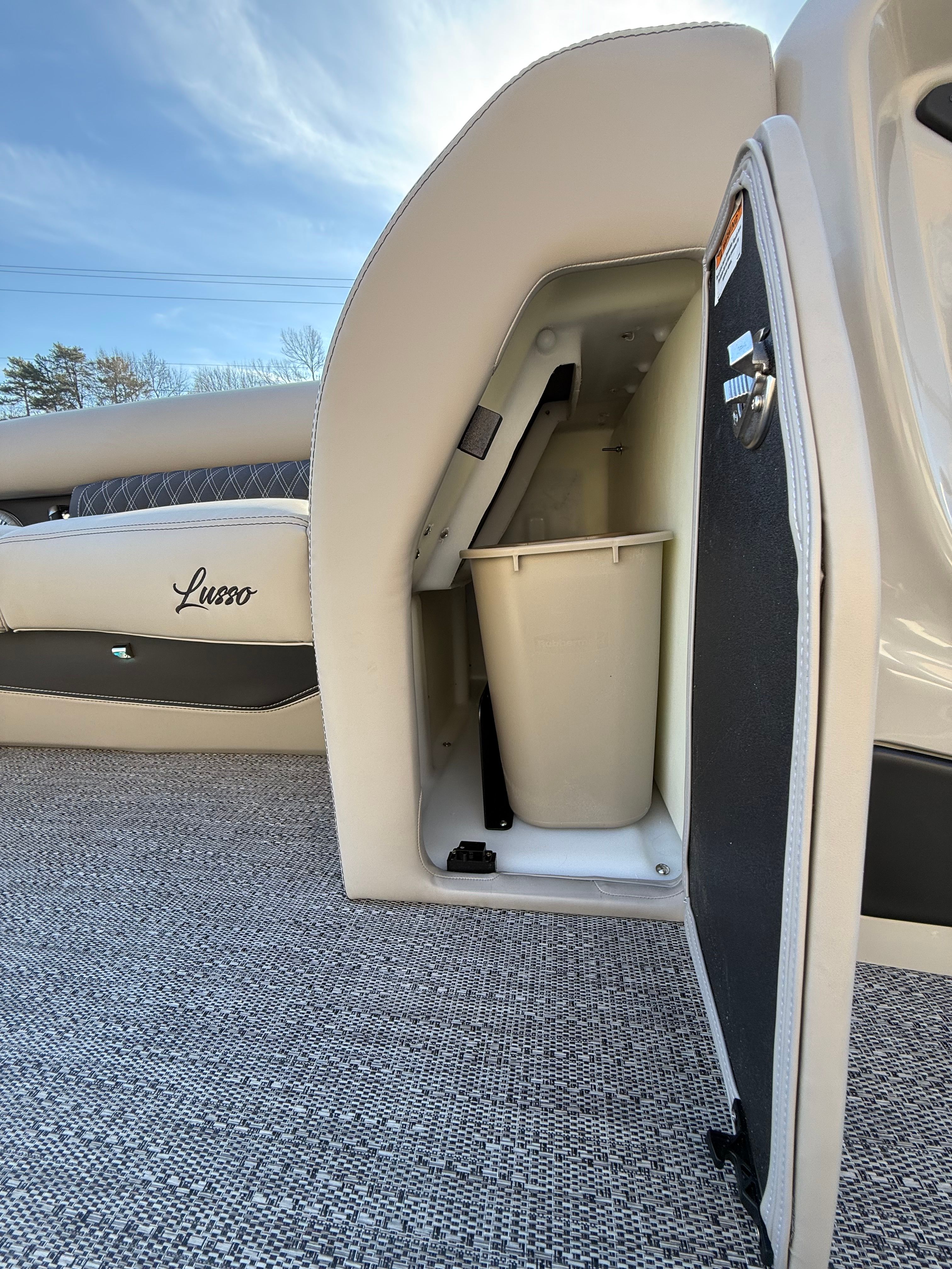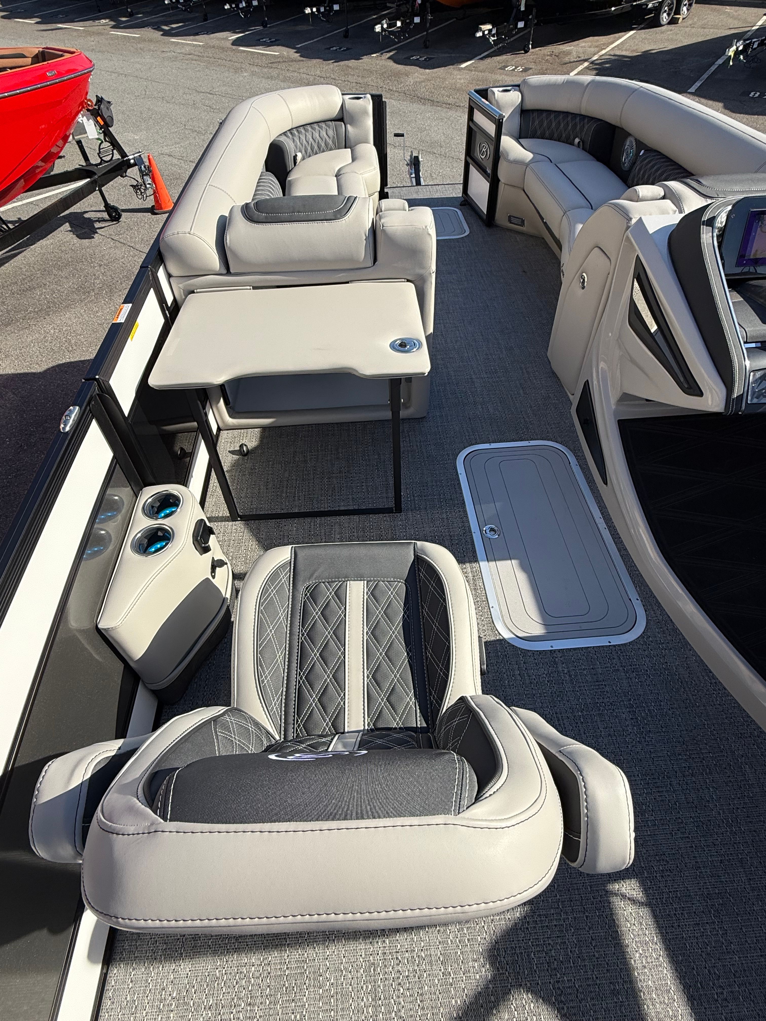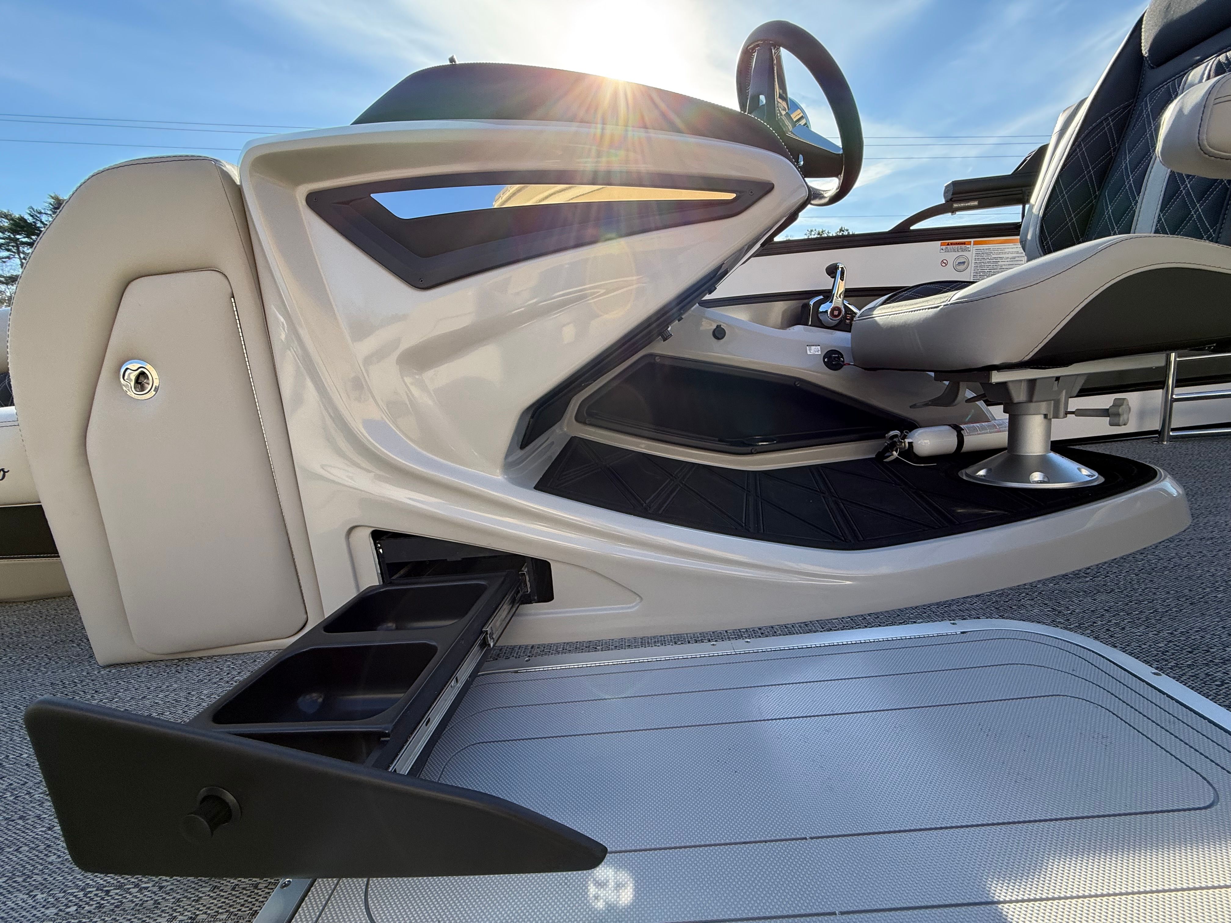 The Barletta Lusso L25UC is packed with special features that elevate your boating experience. The onboard battery charger supports two batteries, ensuring you have plenty of power for extended outings. Exterior lighting, including white underdeck and underwater lights, adds a dramatic flair for evening cruises and enhances safety during nighttime adventures. The furniture is upholstered in Marquesan Gray with Onyx accents, offering plush seating and a modern look, while the Amore Gray flooring is both stylish and durable. The Blackout Package Lusso railskin gives the boat a contemporary edge, and the sweep color in Winter White with Gray Moonstone accents ensures you’ll turn heads wherever you go. Mercury Digital DTS Pre-Rig and Vessel Link integration provide advanced connectivity and control, while hydraulic and power assist steering make handling effortless. Digital gauges keep you informed at a glance, and the rigging includes a stainless steel prop for optimal performance.