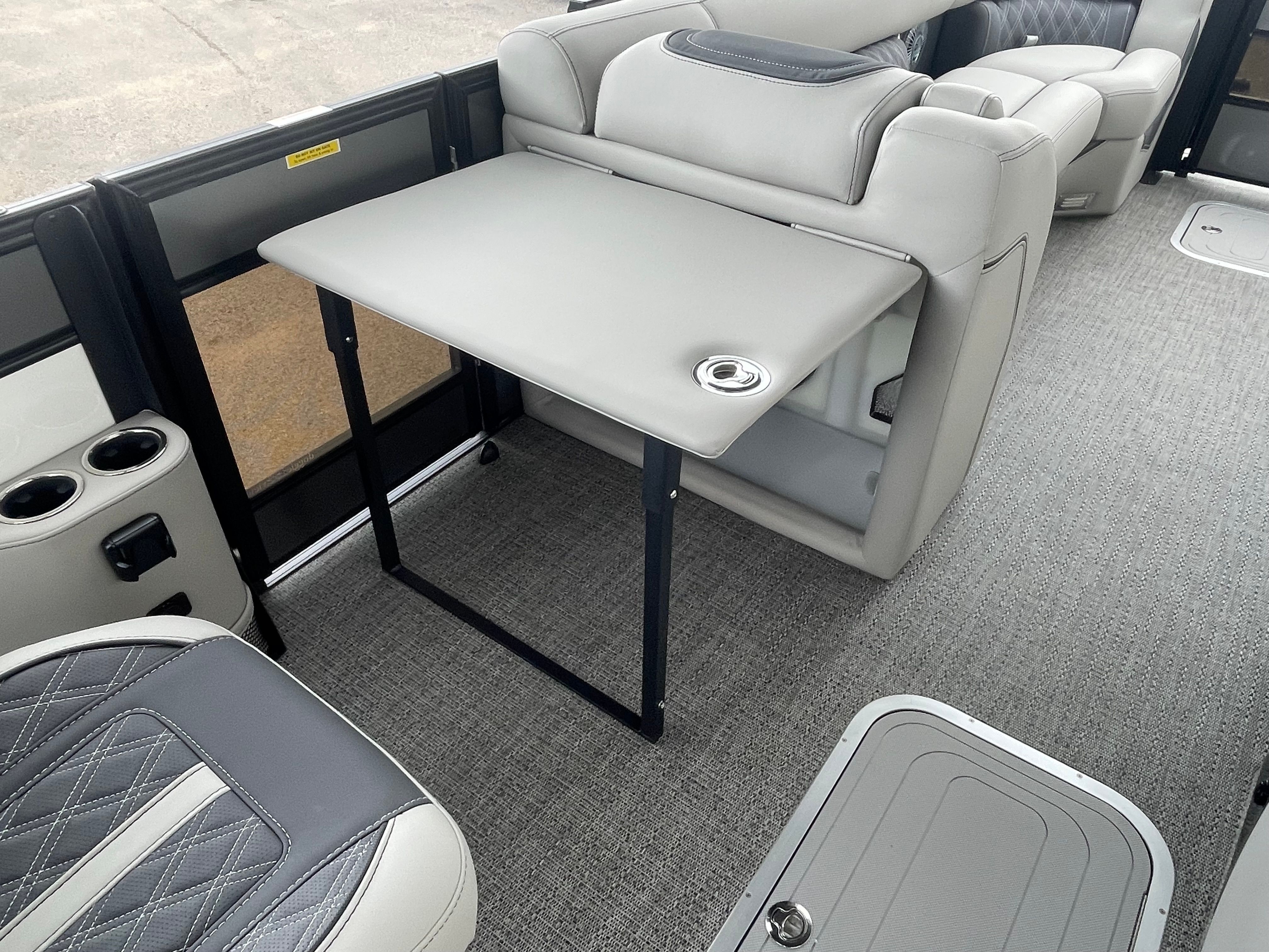 The 2025 Barletta Lusso L25UC is designed to impress from every angle, boasting a suite of special features that set it apart from other pontoon boats for sale. The exterior showcases a sophisticated Sweep Color in Gray Moonstone, complemented by a striking White Opal accent color. The Blackout Package Lusso railskin adds a bold, modern touch, while the Metal Jacket Protectant ensures the exterior remains pristine and protected against the elements.Step aboard and you are greeted by luxurious Marquesan Gray furniture with Charcoal accents, creating a refined and inviting atmosphere. The Amore Gray flooring not only enhances the aesthetic appeal but also provides comfort and durability underfoot. For those who love to entertain or simply relax in the shade, the double bimini setup, including an additional power bimini, offers versatile sun protection and comfort throughout the day.