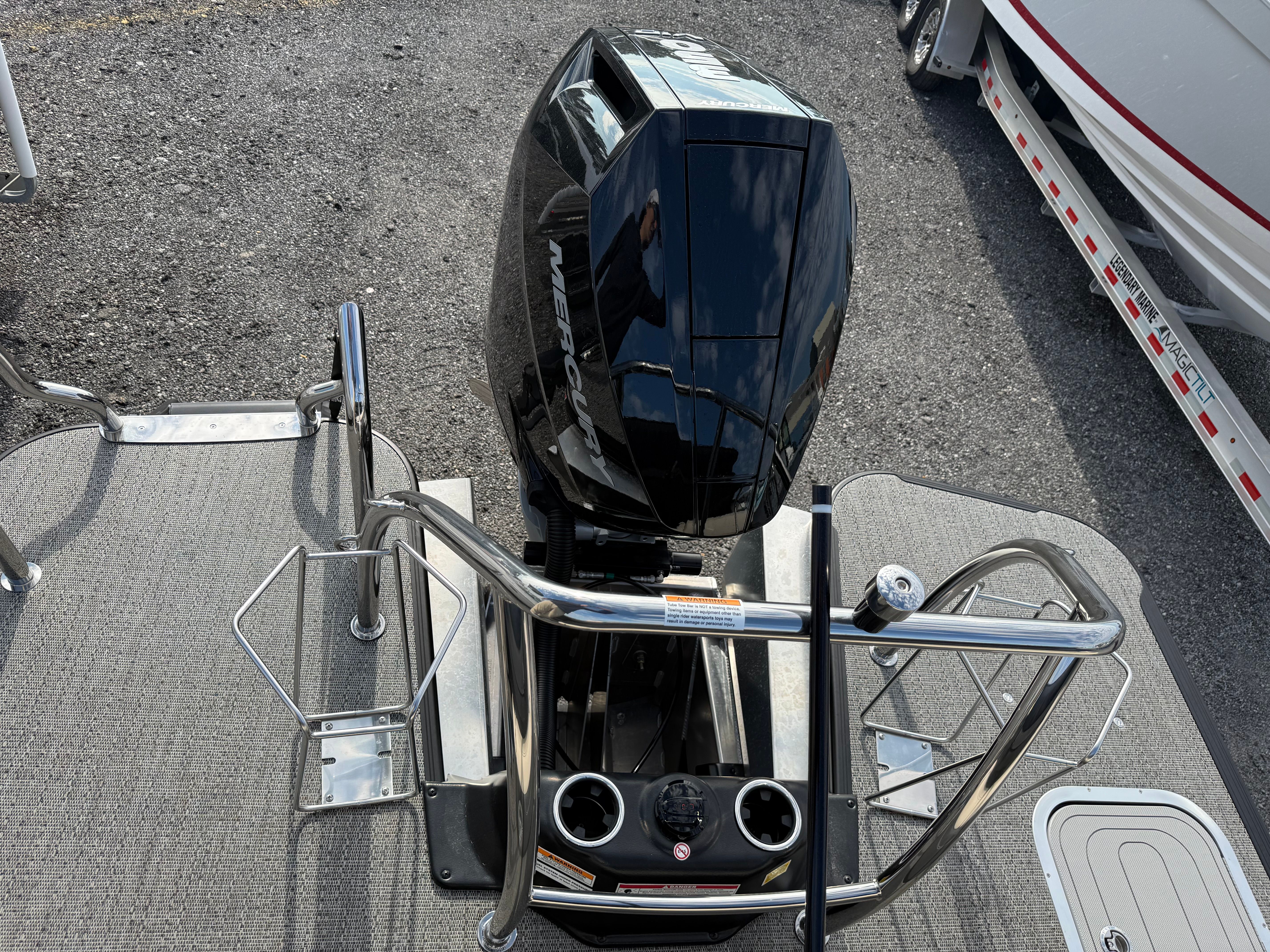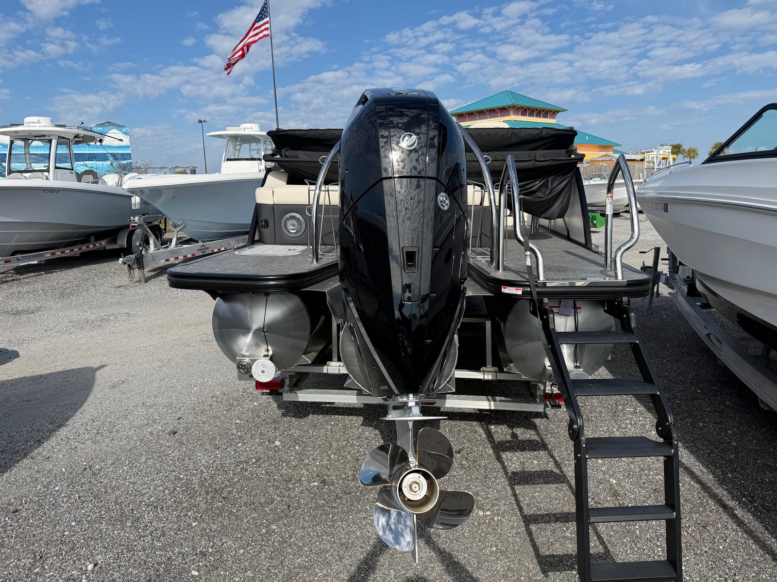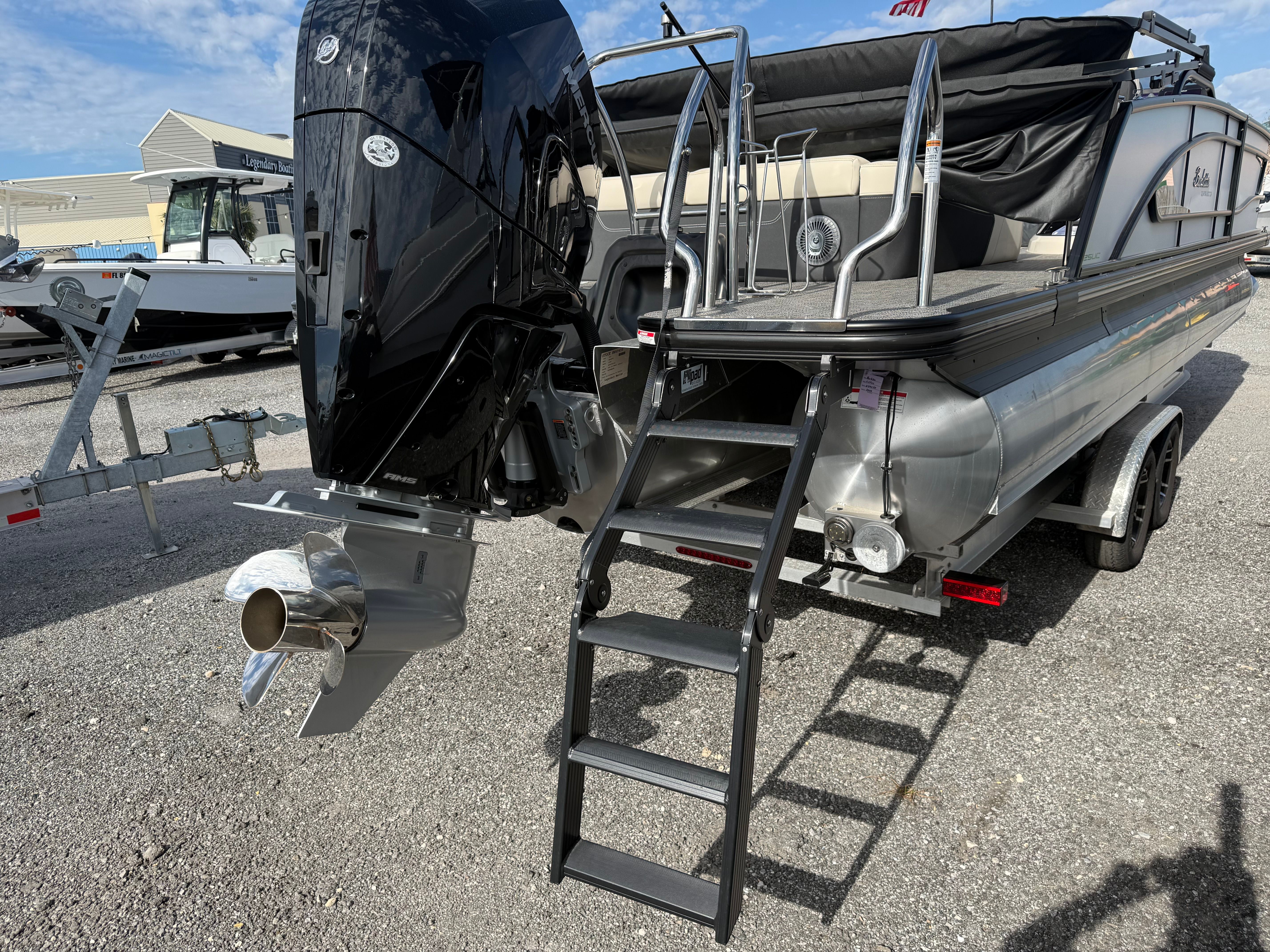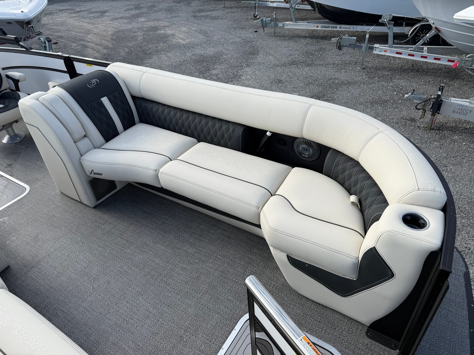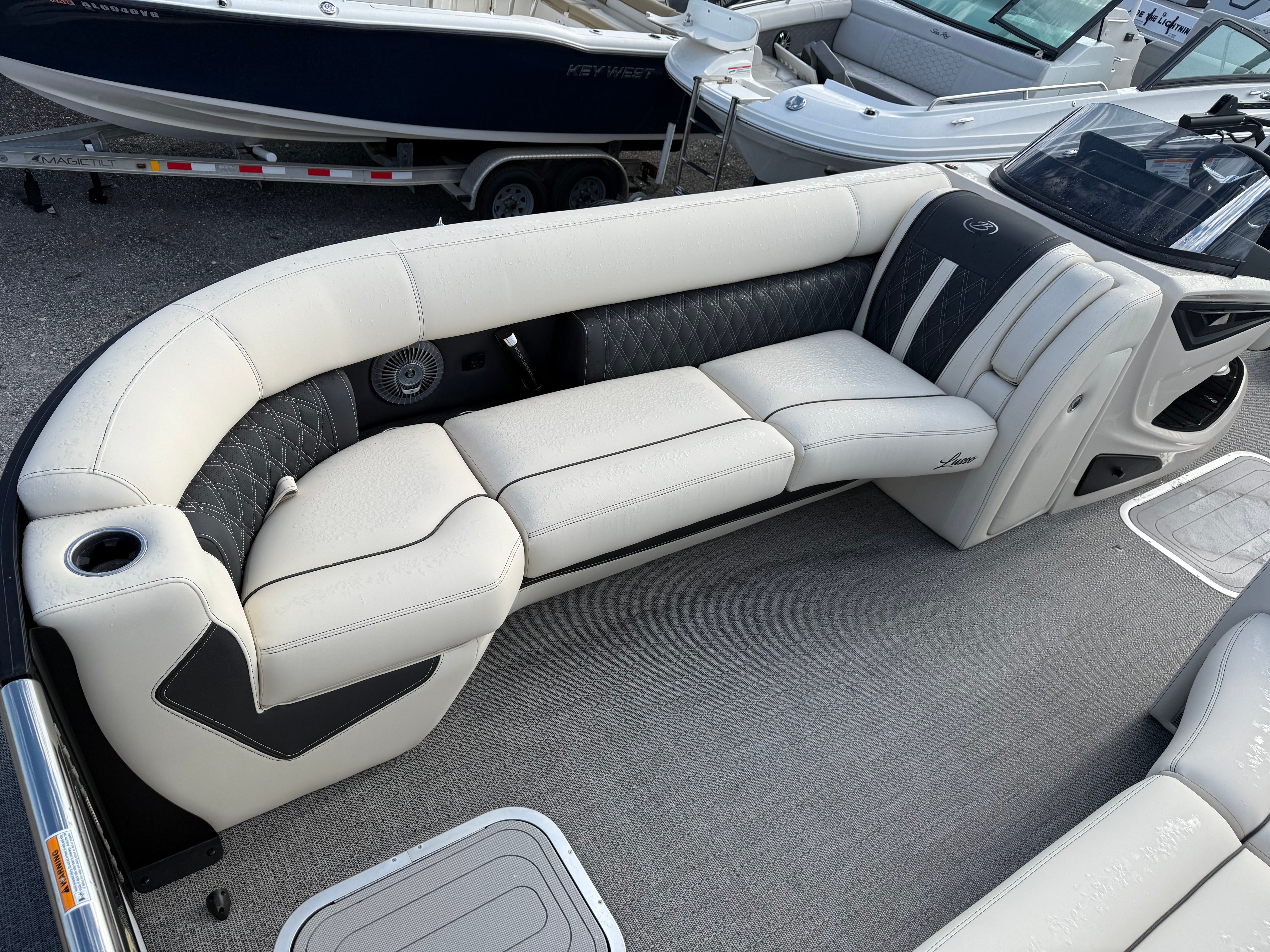 The Lusso L25UC is packed with premium features designed to enhance your boating experience. The Coastal Edition Lusso brings a touch of nautical elegance, while the Blackout Package Lusso adds a bold, contemporary edge to the exterior. The Winter White sweep and accent colors create a timeless look that stands out in any marina. Inside, the Linen with Onyx furniture offers plush seating and stylish comfort, complemented by the Amore Gray flooring for a modern finish.For added ambiance, the Lusso L25UC is equipped with white underdeck and underwater exterior lighting, creating a captivating glow during evening cruises. The Mercury Digital Pre-Rig for V10 ensures advanced engine management and connectivity, while the rigged engine with V10 prop maximizes performance and efficiency. Every detail of this pontoon boat for sale has been thoughtfully designed to provide both luxury and practicality.