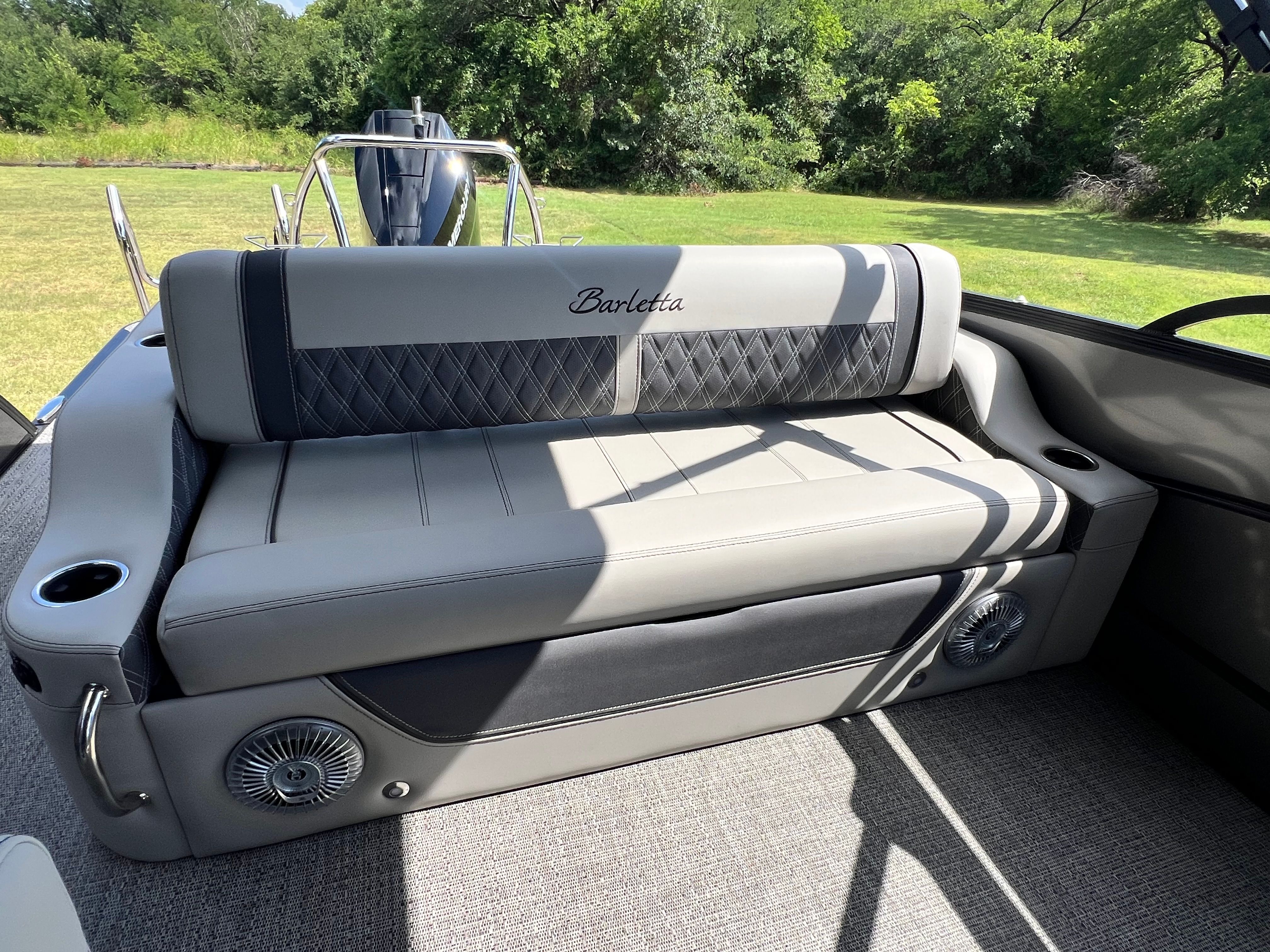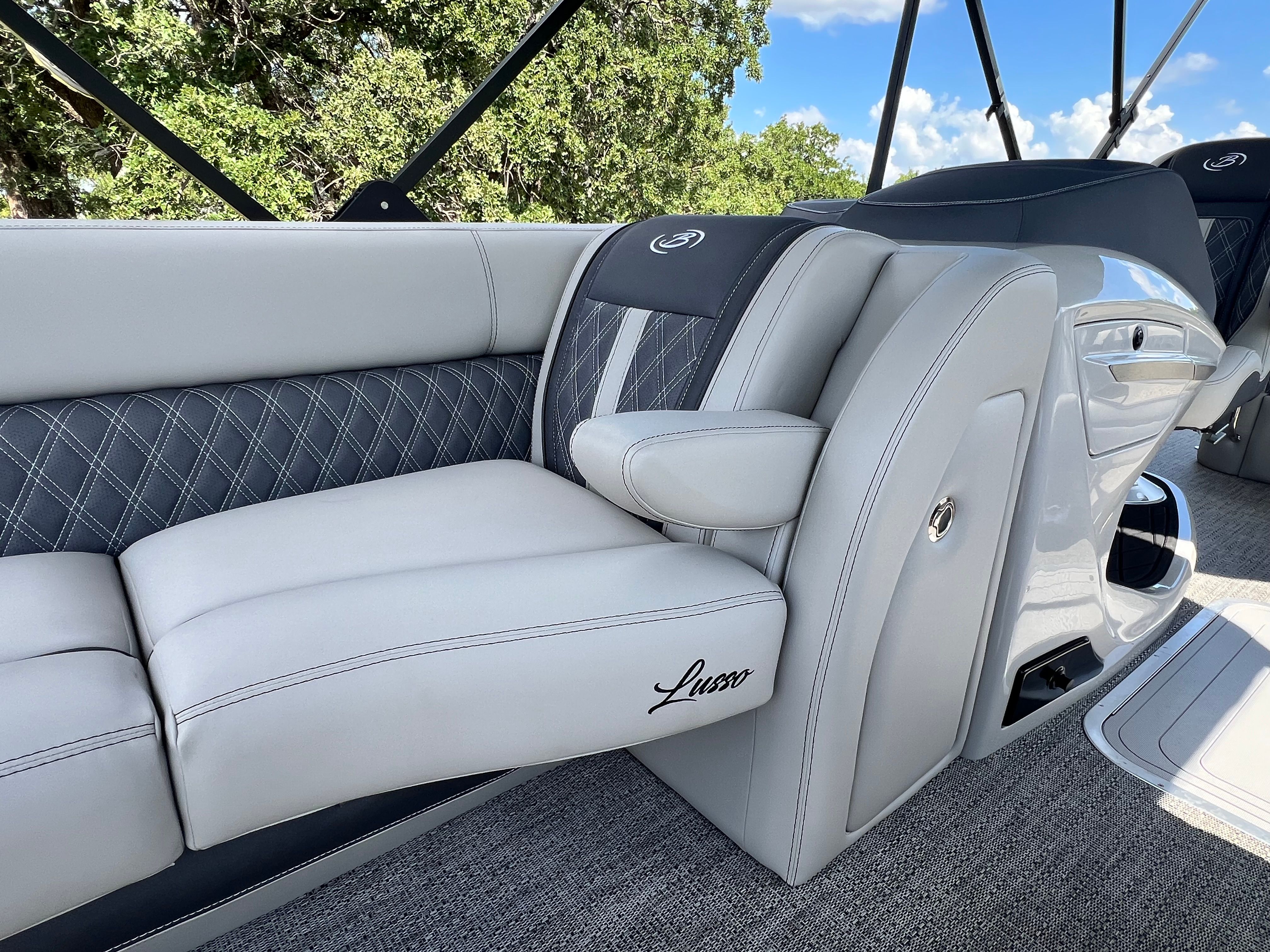 The 2025 Barletta Lusso L25UC is loaded with special features that enhance both comfort and convenience. Step inside and you will find a beautifully appointed interior, featuring a table with a pedestal and base, complete with Yeti-ready cupholders—perfect for keeping your favorite beverages secure while you relax or entertain. The furniture is finished in a sophisticated Marquesan Gray with Charcoal Accent, complemented by Amore Gray flooring that is both stylish and easy to maintain.For those who appreciate versatility and shade, the Lusso L25UC comes equipped with a double bimini, including an additional power bimini for effortless adjustment. The Blackout Package Lusso adds a bold, modern touch to the railskin, while the Metal Jacket Protectant on the exterior ensures your pontoon boat stays looking pristine season after season. The captain’s chair features an adjustable pedestal, providing customized comfort for long days on the water.
