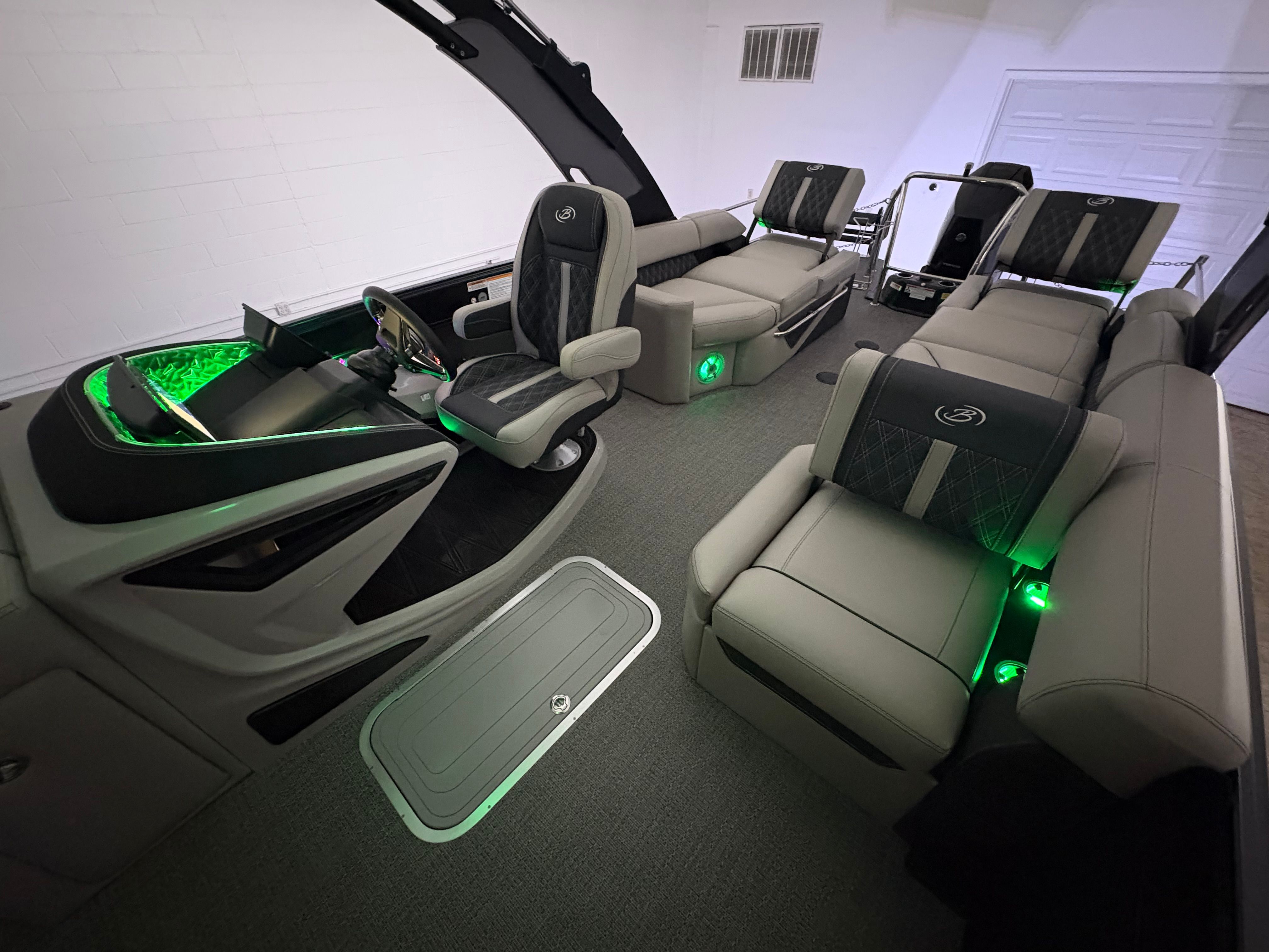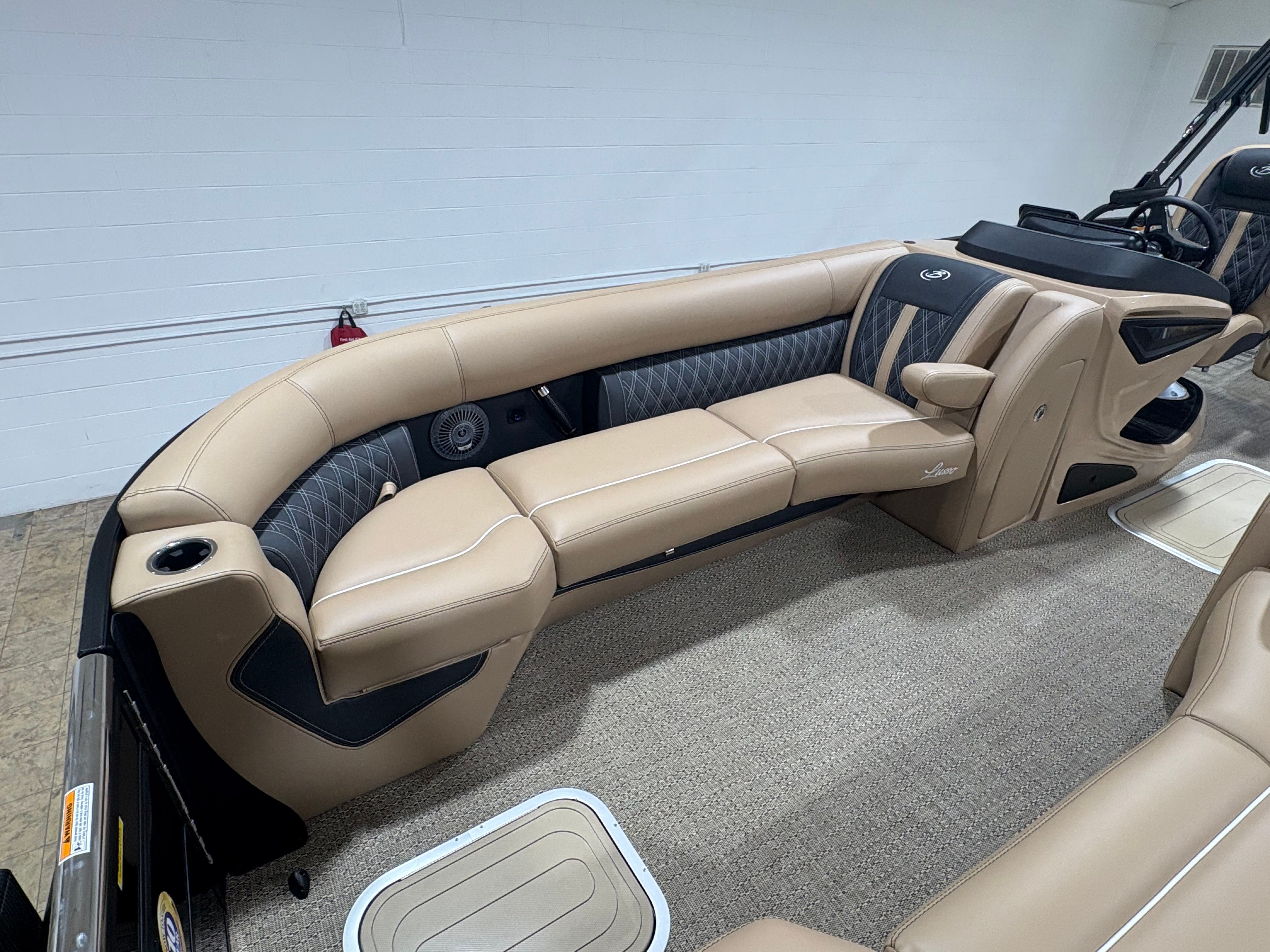 The Barletta Lusso L25UC is packed with premium features that set it apart from other pontoon boats for sale. The Blackout Package Lusso railskin adds a bold, sophisticated touch to the exterior, perfectly complemented by the Black Diamond sweep and accent colors. Inside, the Carmella Tan with Onyx furniture offers plush, ergonomic seating for ultimate comfort, while the Amore Tan flooring provides a stylish and durable foundation for all your onboard activities.Advanced digital gauges keep you informed at a glance, ensuring you have all the information you need for a safe and enjoyable outing. The exterior is protected by a Metal Jacket Protectant, helping to maintain the boat’s pristine appearance season after season. For those who love to entertain after sunset, the exterior lighting package includes white underdeck and underwater lights, creating a captivating ambiance that enhances every evening on the water.