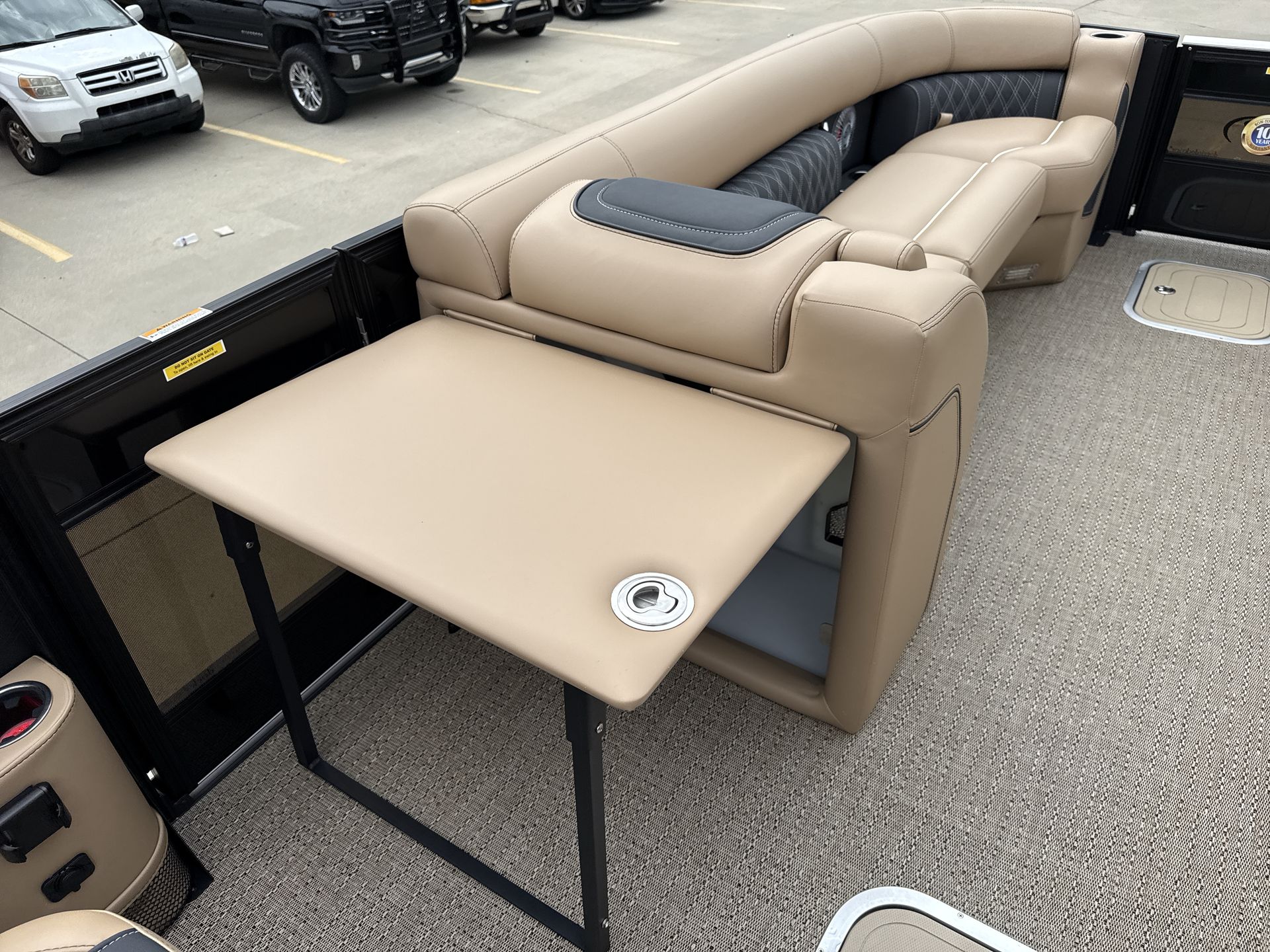 The 2026 Barletta Lusso L25UC stands out as a premier pontoon boat for sale, offering a perfect balance of style, comfort, and functionality. Measuring an impressive 27.5 feet in length, this new pontoon provides ample space for family gatherings, social events, or peaceful escapes on the water. The Lusso L25UC’s modern design is accentuated by its Black Diamond sweep and accent colors, complemented by the Blackout Package Lusso railskin, creating a bold and sophisticated presence wherever you cruise. The Carmella Tan with Onyx furniture and Amore Tan flooring add a touch of elegance and warmth, ensuring every moment onboard feels like a first-class experience.