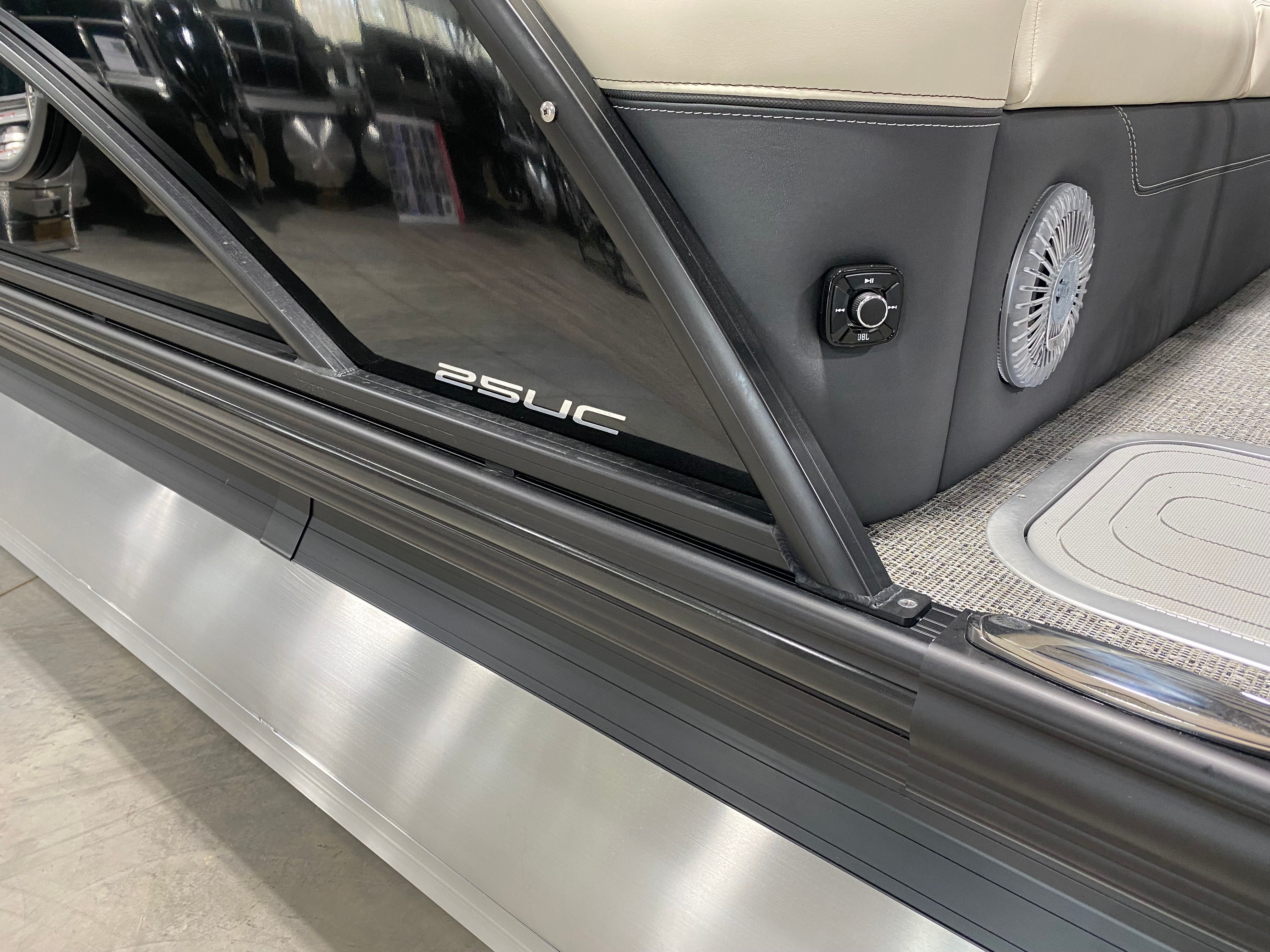 Step aboard the Lusso L25UCA and you’ll immediately notice its attention to detail and premium finishes. The Blackout Package Lusso railskin adds a touch of sophistication, while the furniture in Linen with Onyx creates a welcoming and stylish atmosphere. The flooring, finished in Amore Gray, is both elegant and practical, providing comfort underfoot and easy maintenance. Exterior lighting, including white underdeck and underwater lights, enhances the ambiance for evening cruises and adds a layer of safety when navigating after sunset.The Lusso L25UCA is designed for those who appreciate the finer things in life. Every element, from the color scheme to the furniture selection, has been chosen to create a harmonious and luxurious environment. The spacious deck layout allows for flexible seating arrangements, perfect for socializing, sunbathing, or enjoying a meal with loved ones. The pontoon’s sturdy construction and high-quality materials ensure durability and longevity, so you can enjoy your investment for years to come.
