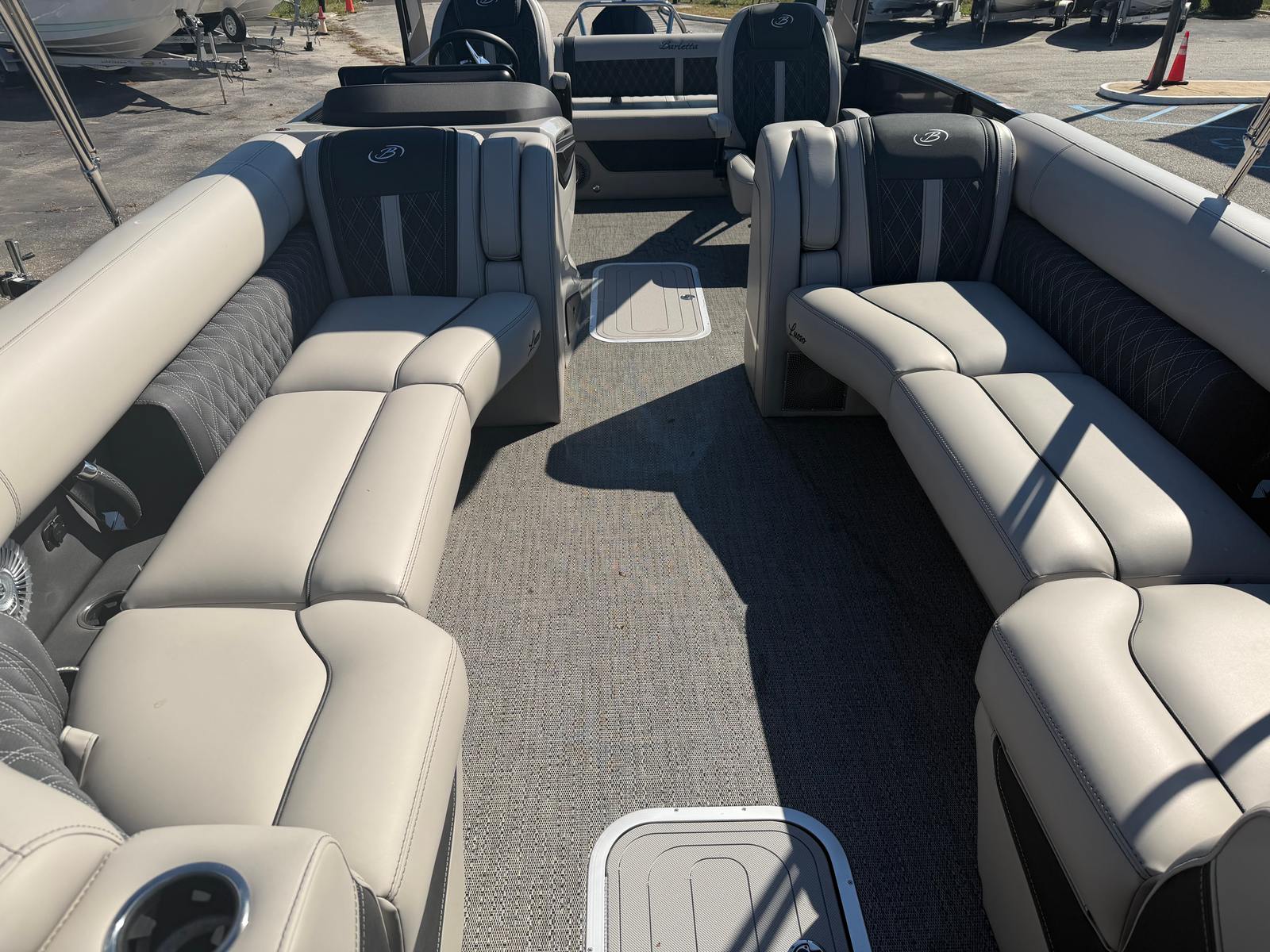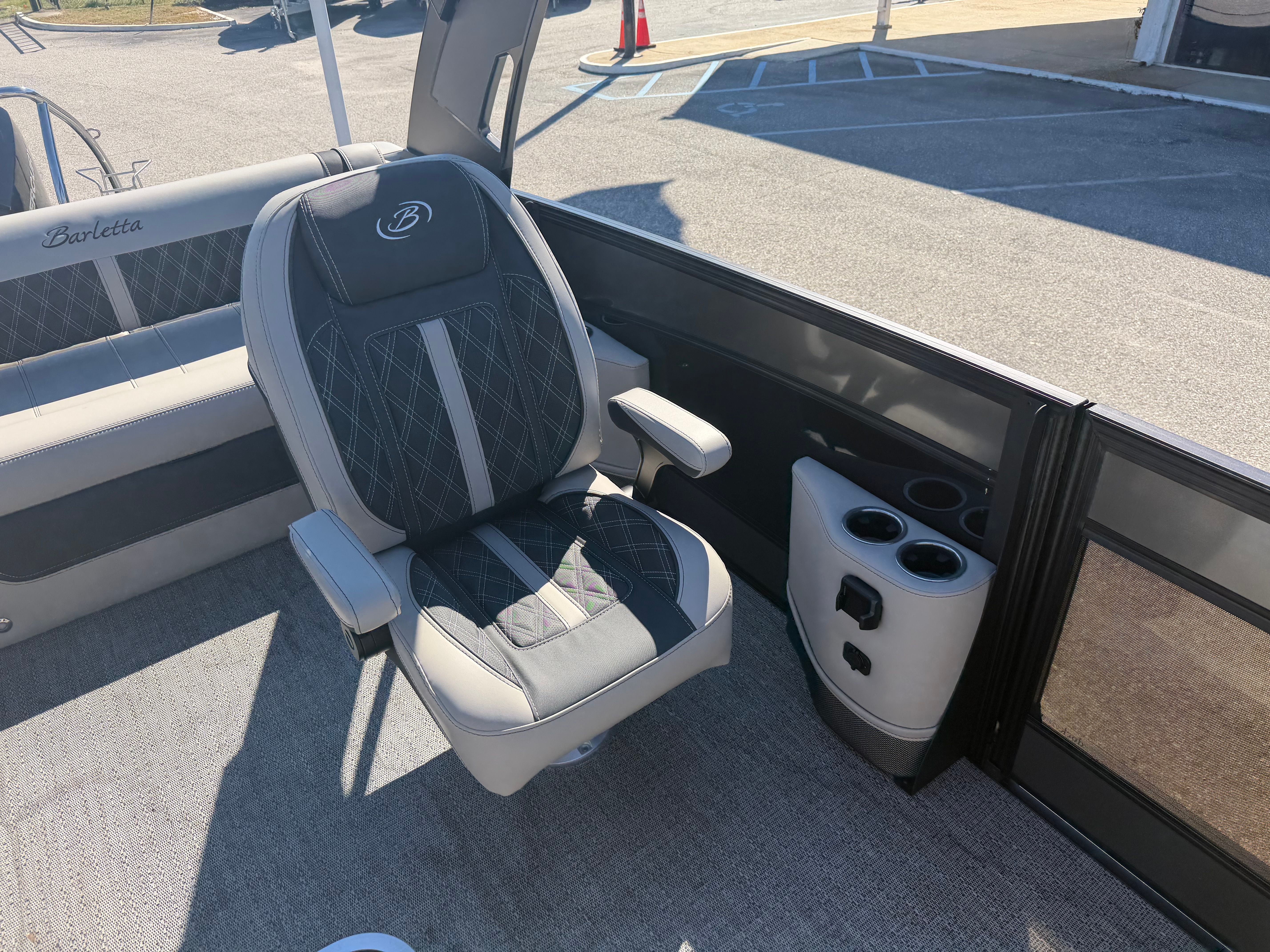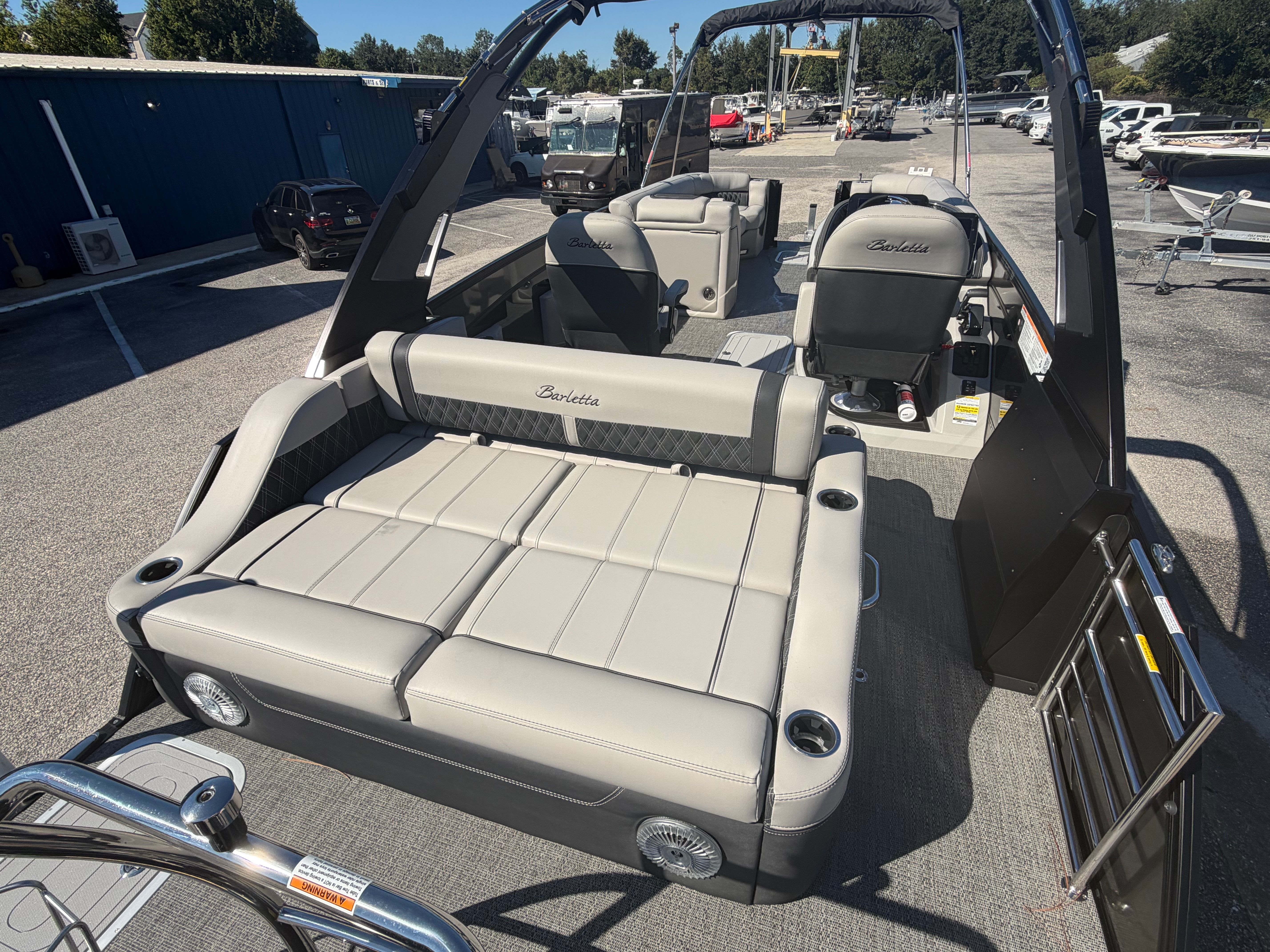 This Barletta boat for sale is packed with premium features designed to enhance your boating experience. The Double Bimini Arch Models offer versatile shade options, allowing you to enjoy the sun or relax in the cool comfort of the shade. The Coastal Edition Lusso brings added durability and style, perfect for both freshwater and coastal adventures. The Blackout Package Lusso, combined with the sleek railskin packages, gives the boat a bold, contemporary look that’s sure to impress. Inside, the Marquesan Gray with Onyx furniture provides plush seating and ample space for socializing, while the Amore Gray flooring is both stylish and easy to maintain. Digital gauges offer real-time information at your fingertips, and the Mercury Digital DTS Pre-Rig ensures your engine is ready for peak performance.