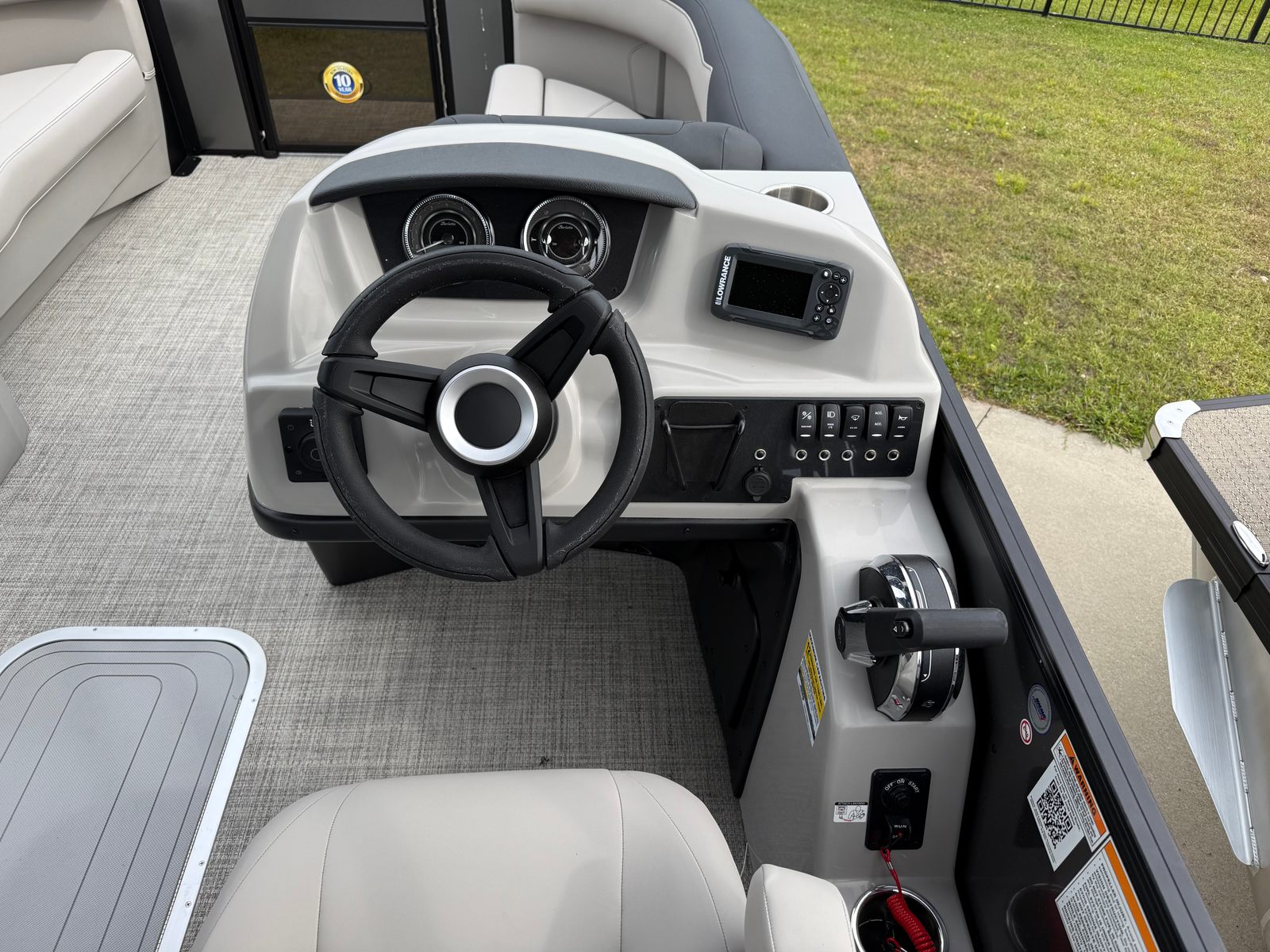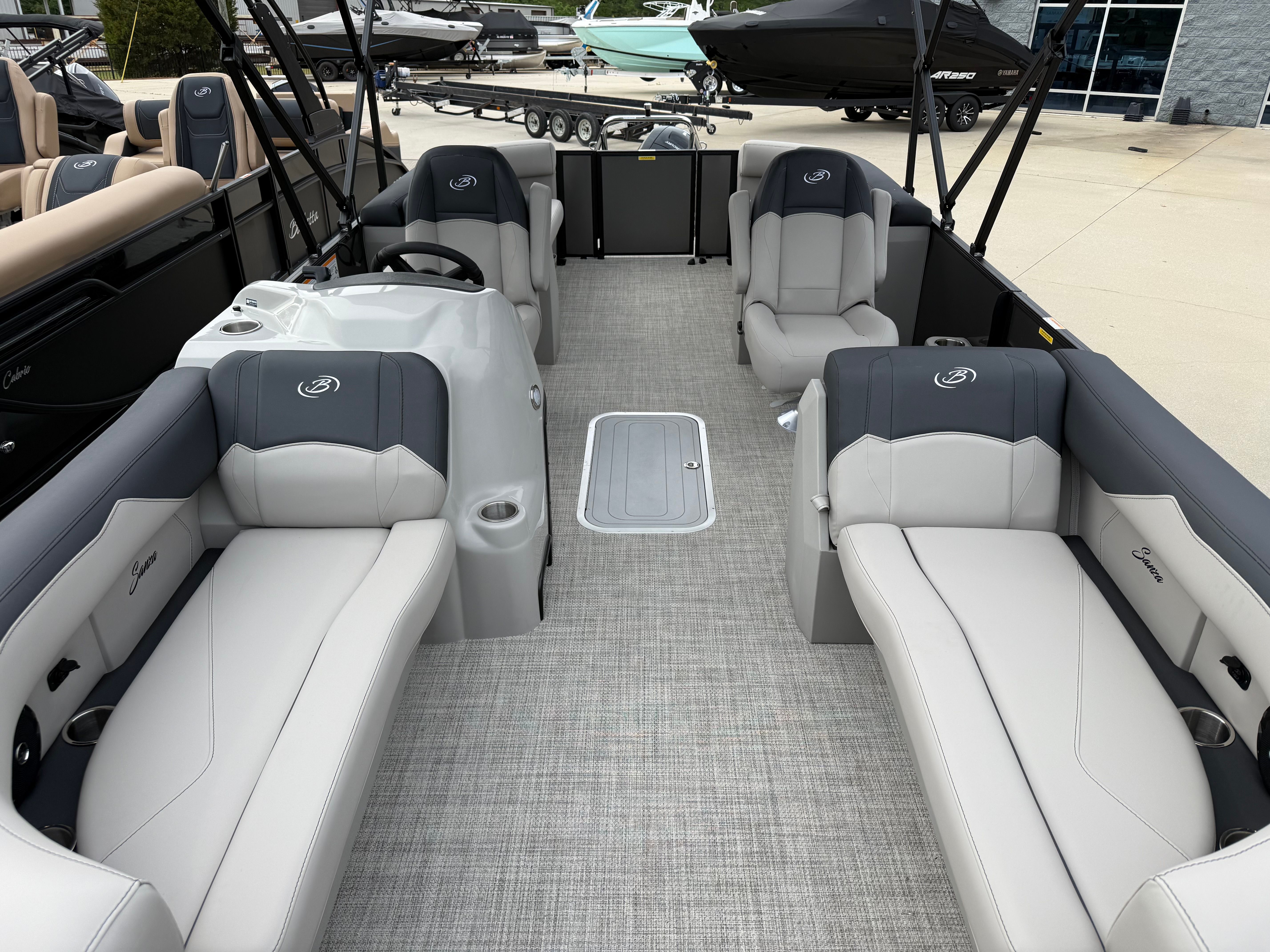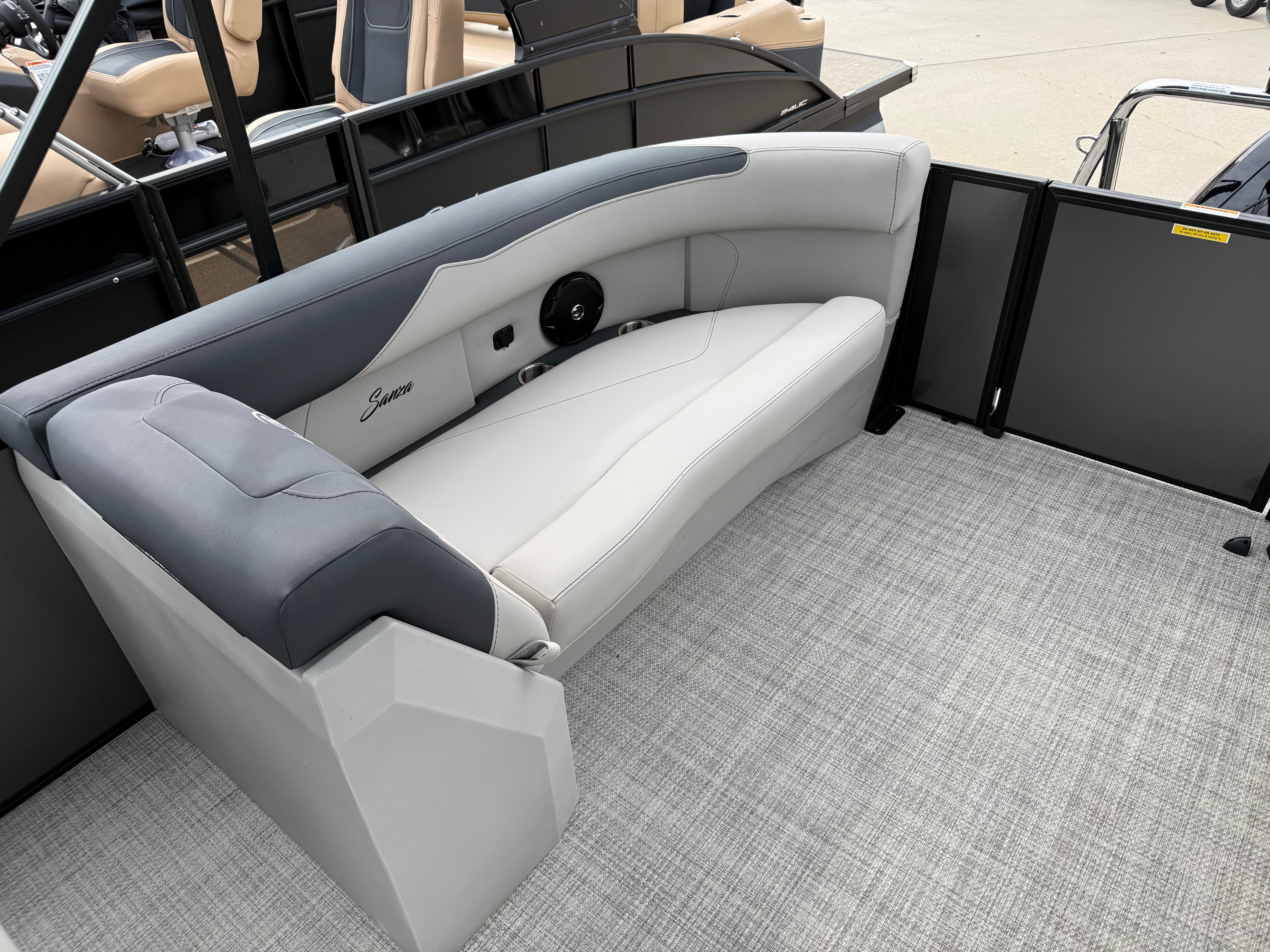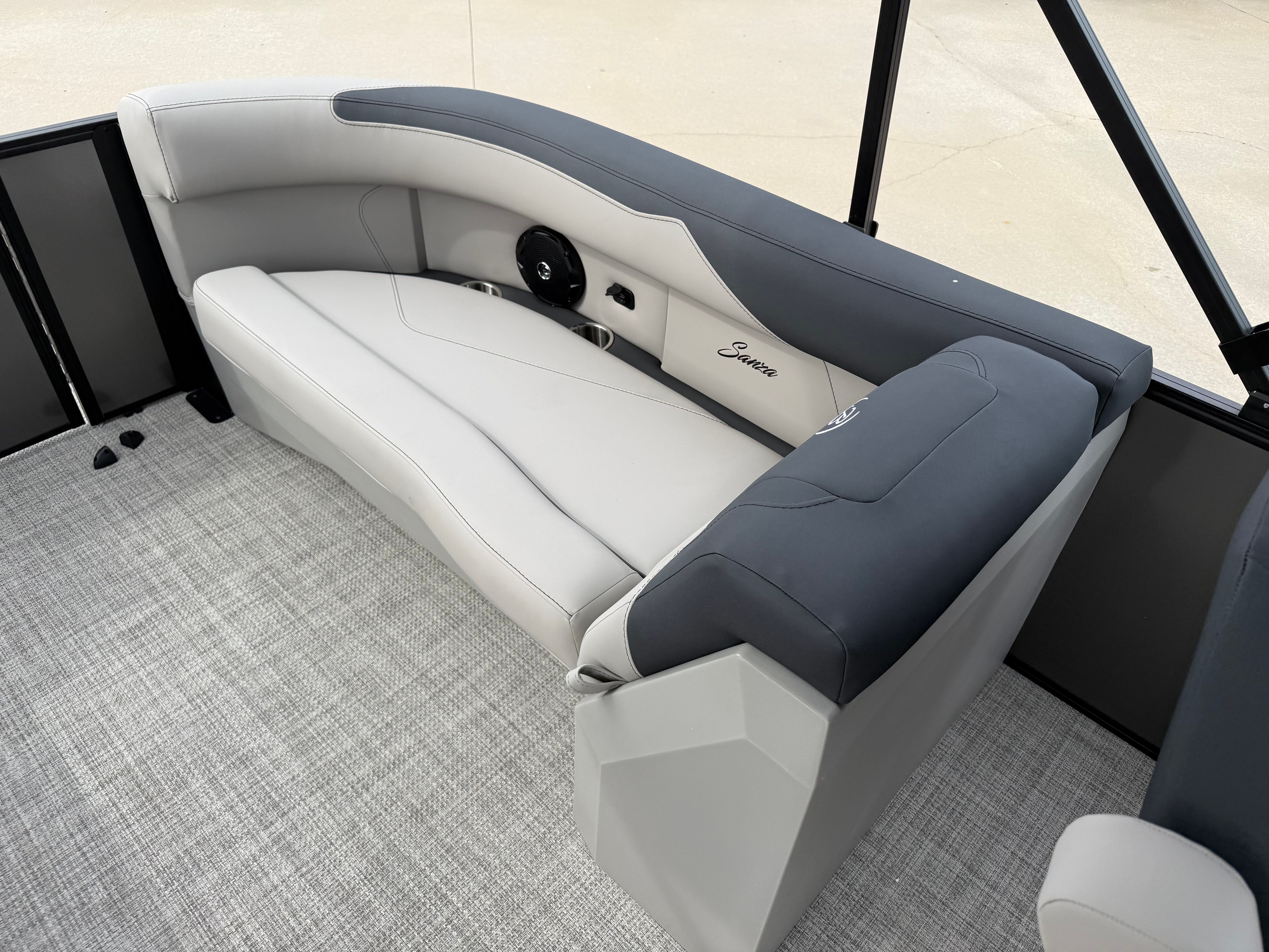 The 2026 Barletta Sanza S22QC is loaded with special features that elevate your boating experience. The Railskin Color in Gray Moonstone gives this pontoon a modern, elegant look, while the Sanza Blackout Package adds a touch of bold sophistication. The Marquesan Gray with Onyx furniture provides a plush, inviting atmosphere, perfectly complemented by the Alpine Gray flooring that is both stylish and easy to maintain. The Sanza Triple Toon Package enhances stability and ride quality, making every journey smooth and enjoyable. For added convenience, the in-floor midship storage offers ample space to stow your gear, keeping the deck clutter-free and organized.